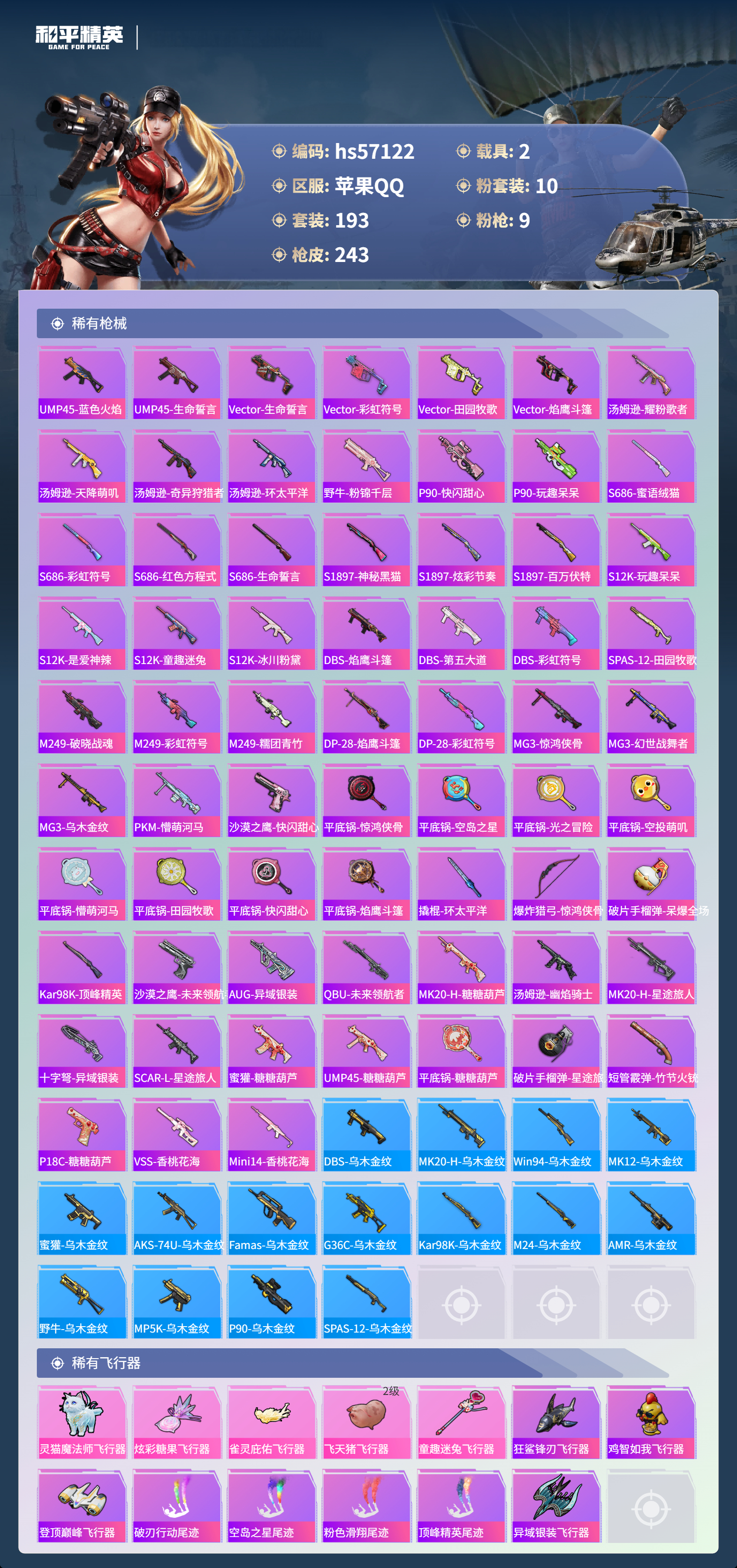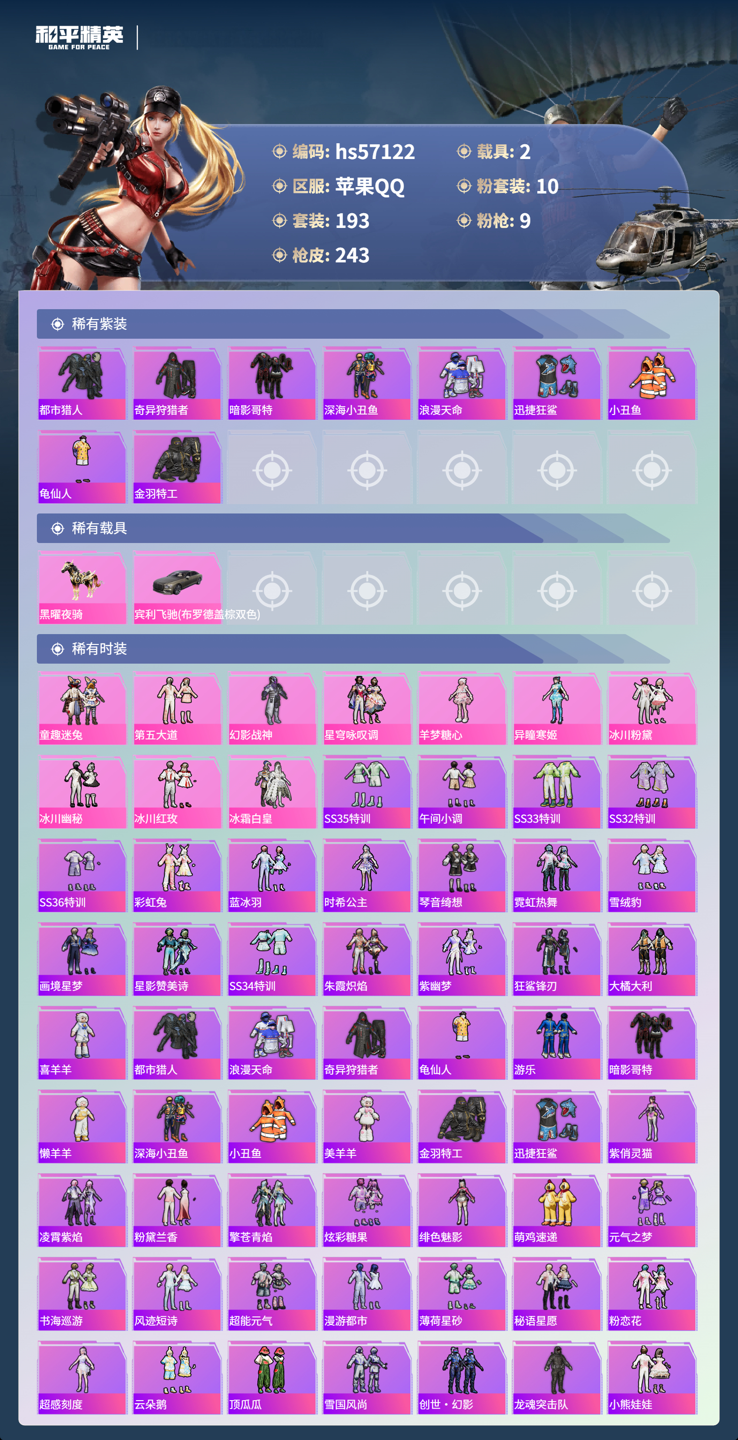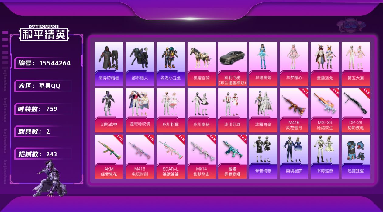 【300414】【不可二次】【苹果QQ】龟仙人 AKM-绿萝繁花 漫步者 都市猎人 迅捷狂鲨 奇异狩猎者 M24-奇异狩猎者 极速红龙 金羽特工 忍者信条 M416-电玩时刻 SCAR-L-锦绣绵绵 M416-风花雪月 深海小丑鱼 幻影战神 童趣迷兔 童趣迷兔飞行器 浪漫天命 暗影哥特 冰霜白皇
