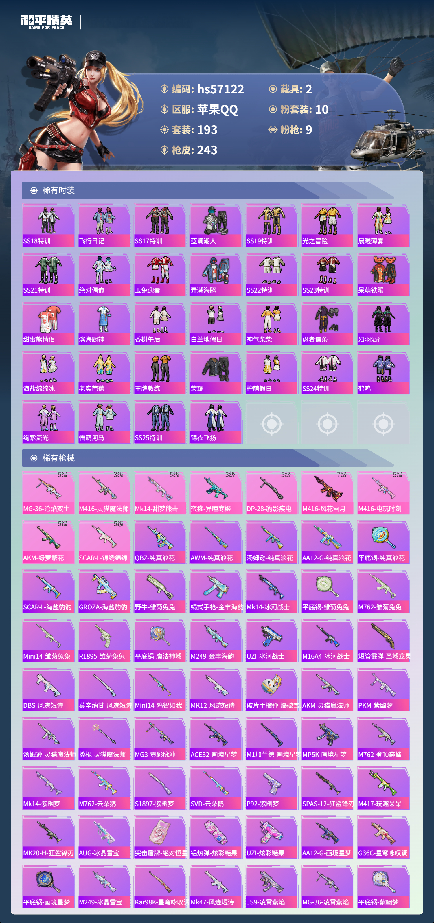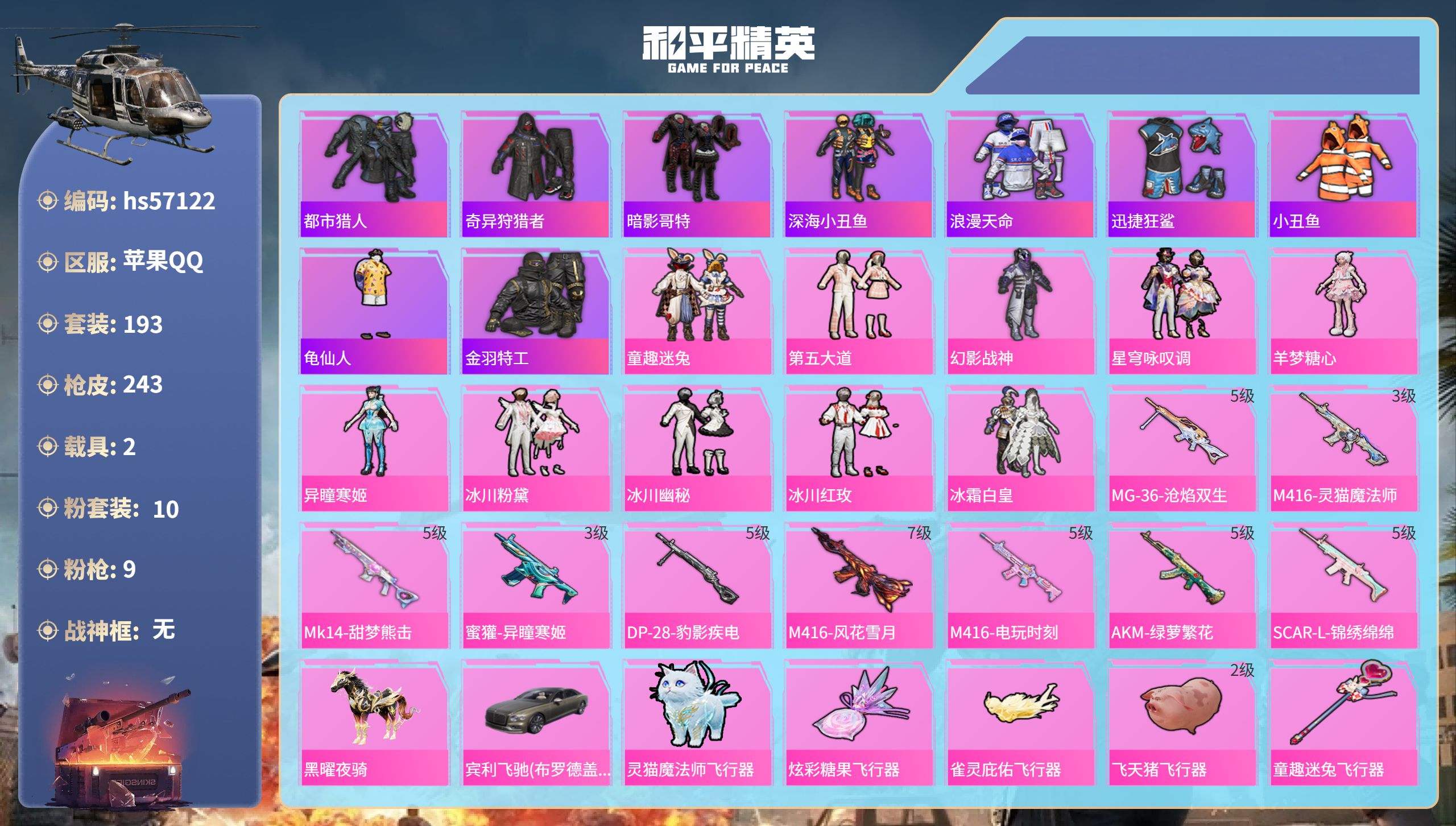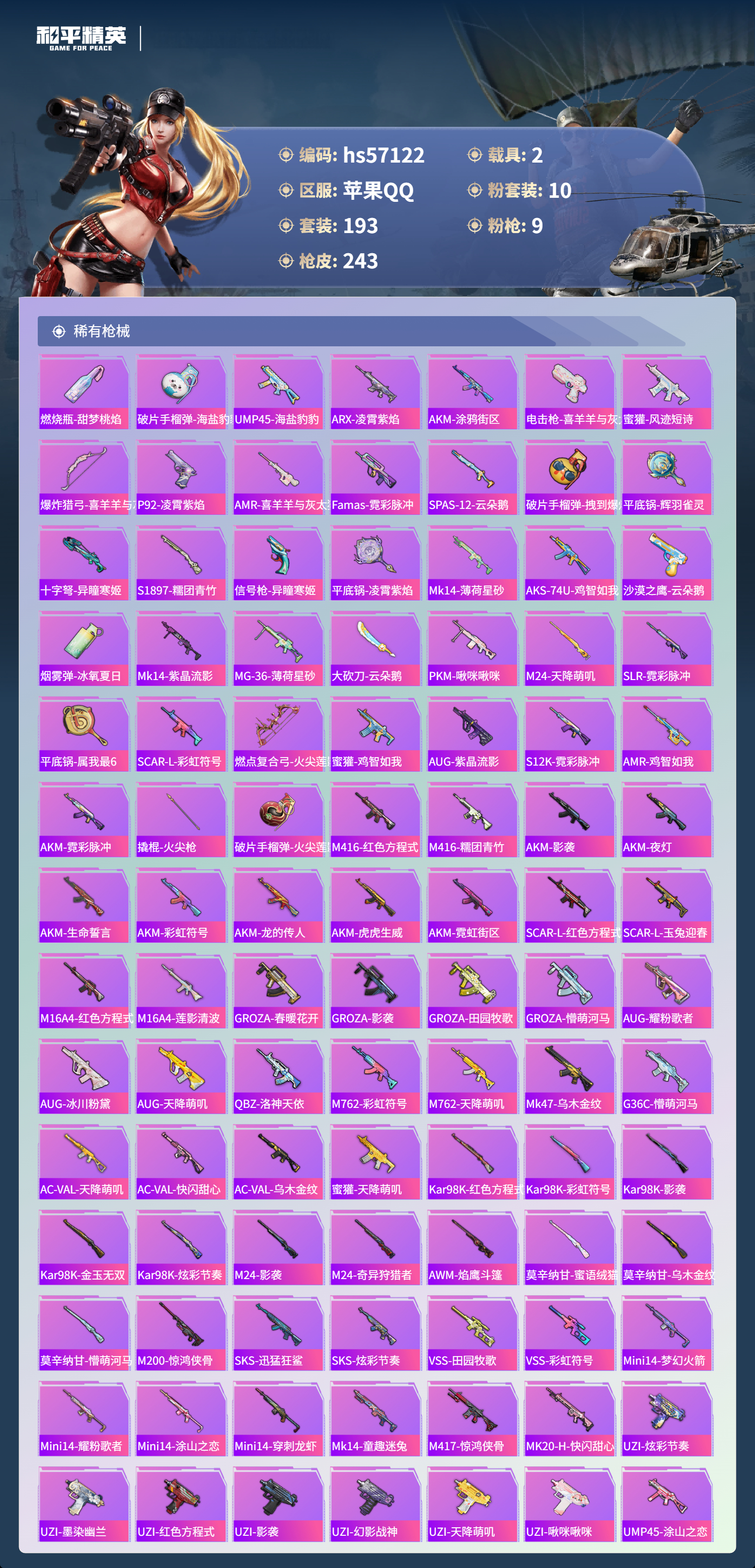 【300414】【不可二次】【苹果QQ】龟仙人 AKM-绿萝繁花 漫步者 都市猎人 迅捷狂鲨 奇异狩猎者 M24-奇异狩猎者 极速红龙 金羽特工 忍者信条 M416-电玩时刻 SCAR-L-锦绣绵绵 M416-风花雪月 深海小丑鱼 幻影战神 童趣迷兔 童趣迷兔飞行器 浪漫天命 暗影哥特 冰霜白皇
