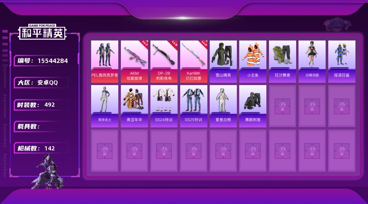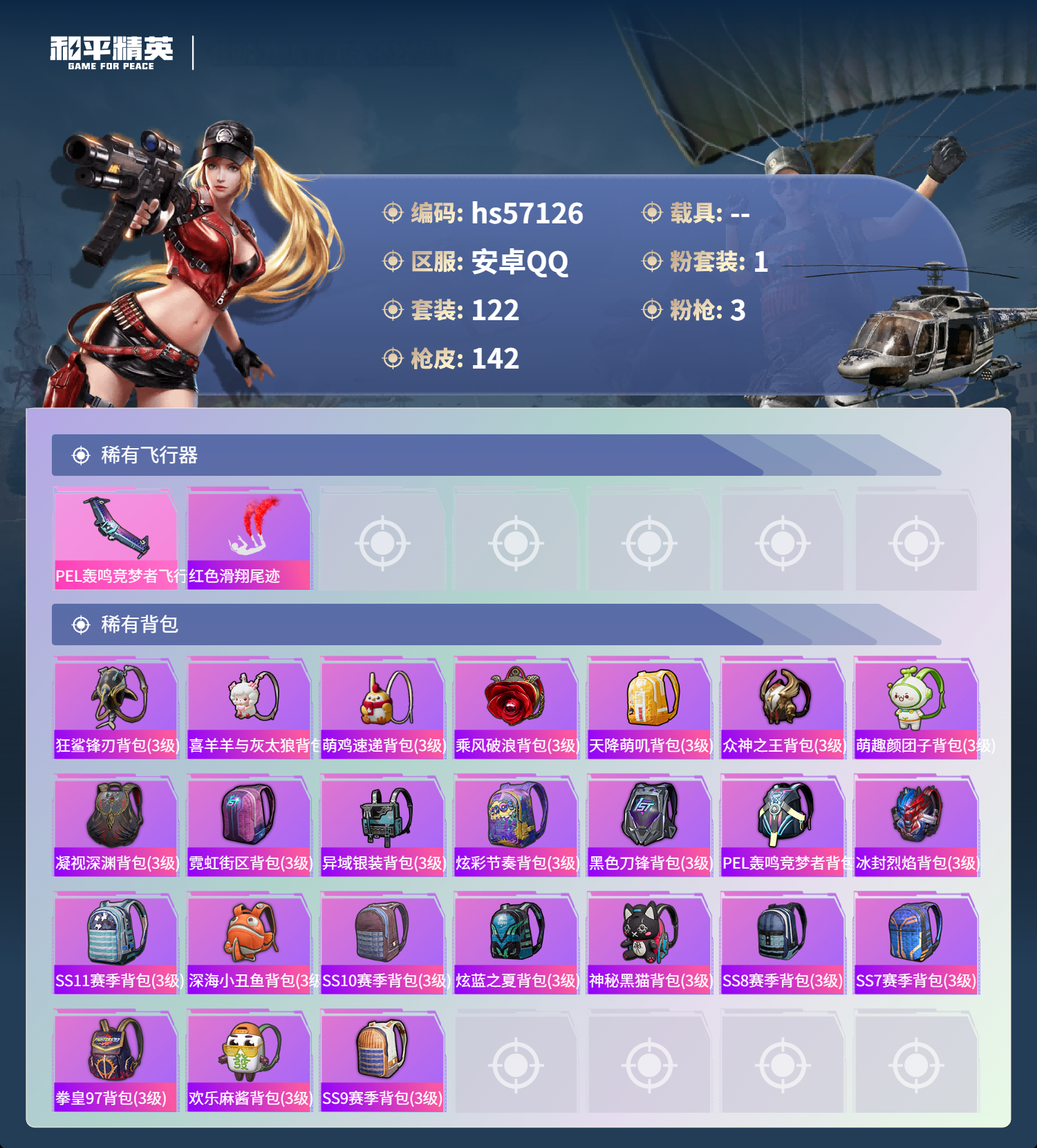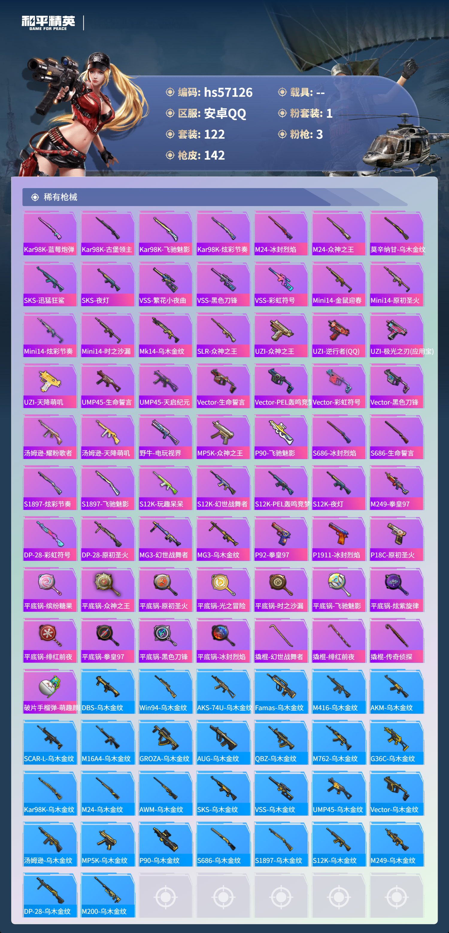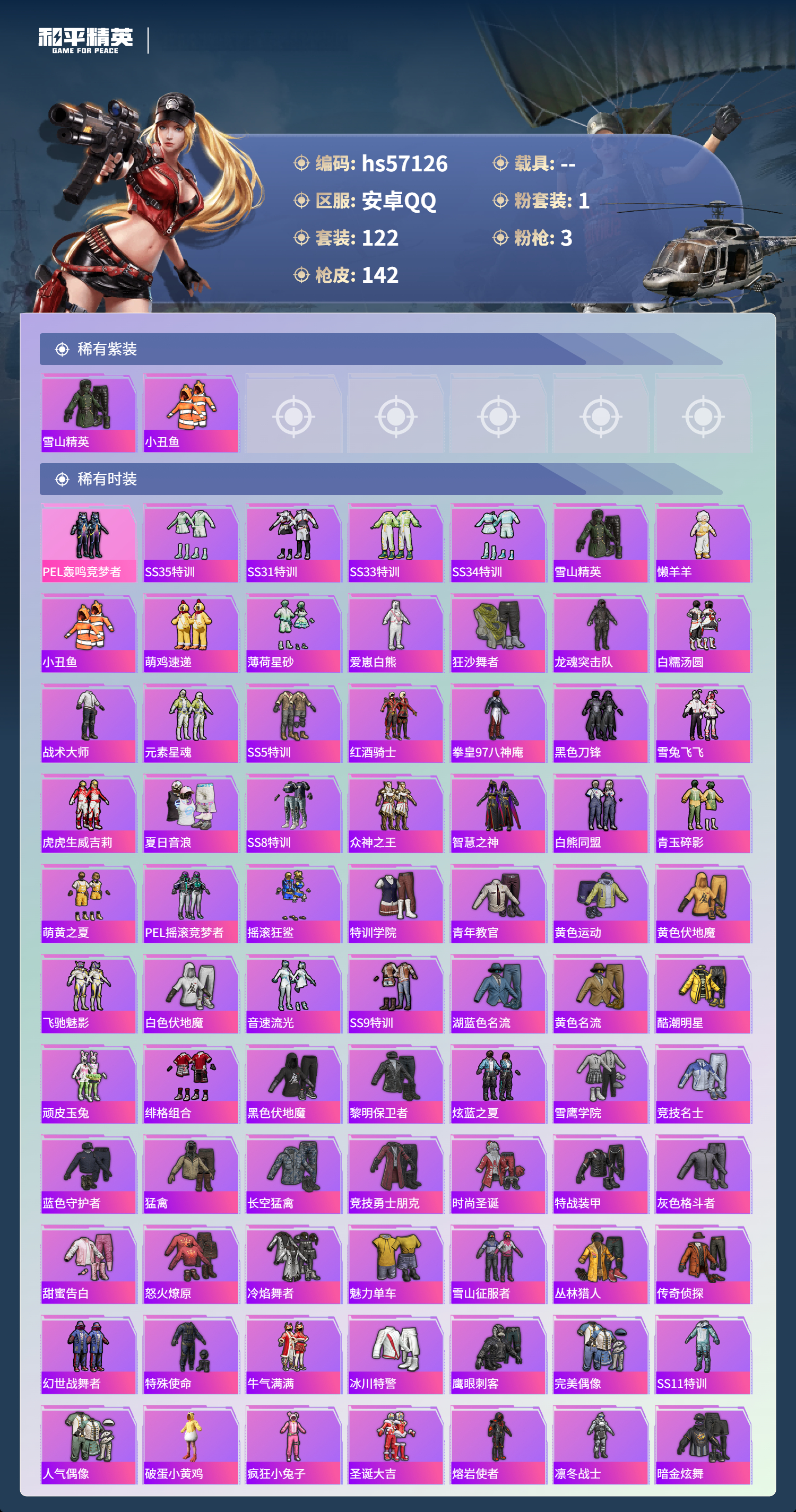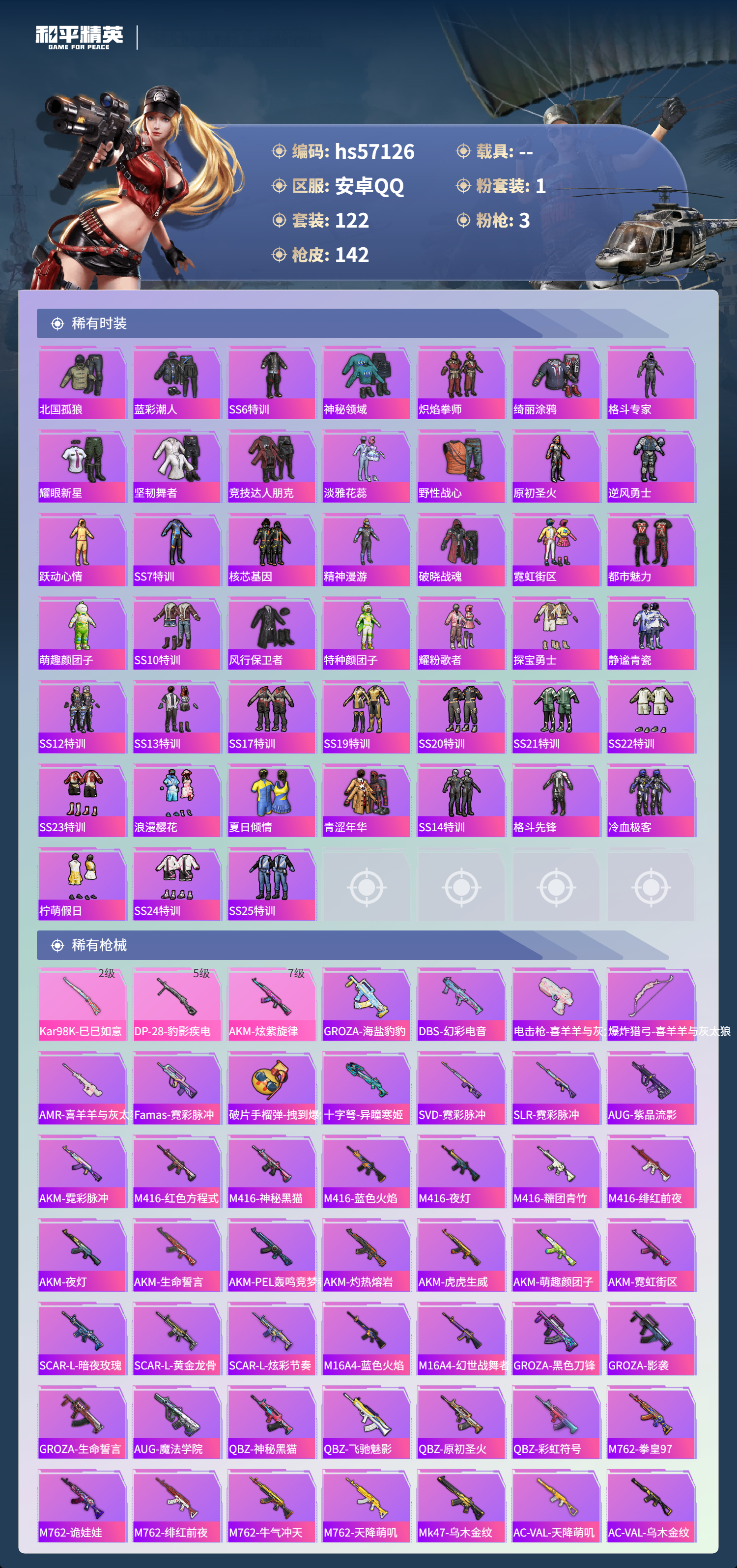 【300420】【可二次】【安卓QQ】AKM-炫紫旋律 PEL轰鸣竞梦者飞行器 PEL轰鸣竞梦者 AUG-魔法学院 黑色刀锋 狂沙舞者 雪山精英 静谧青瓷