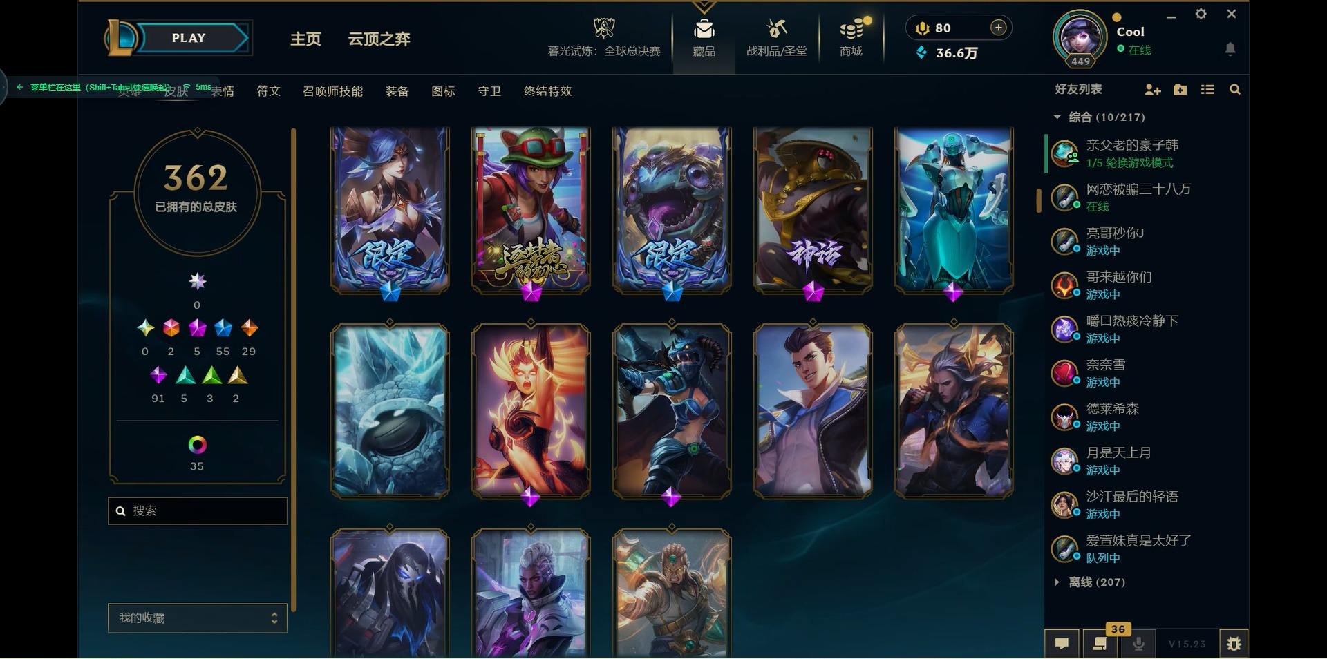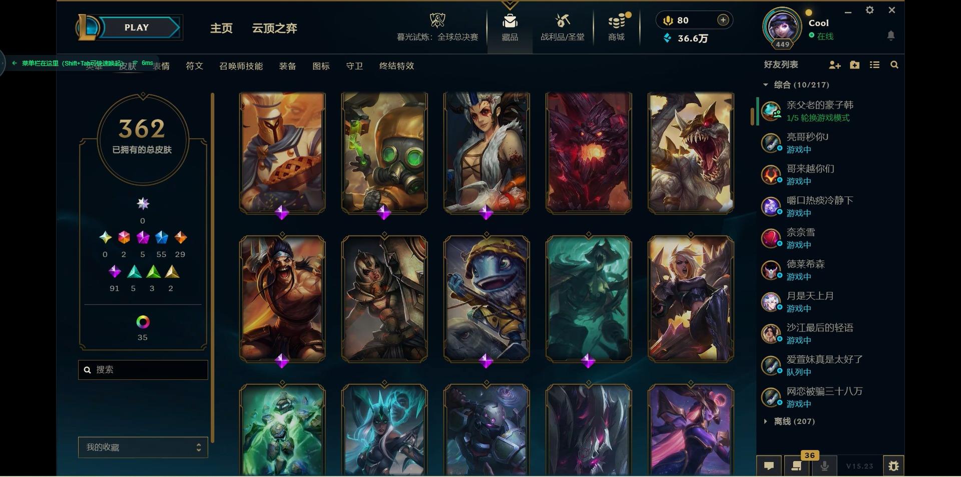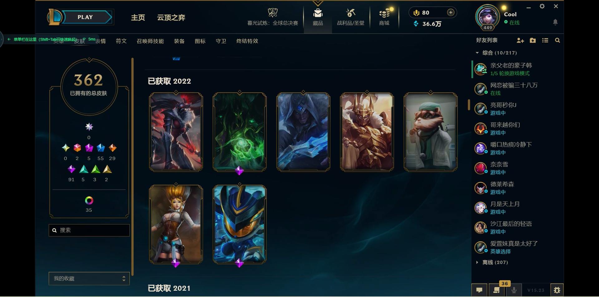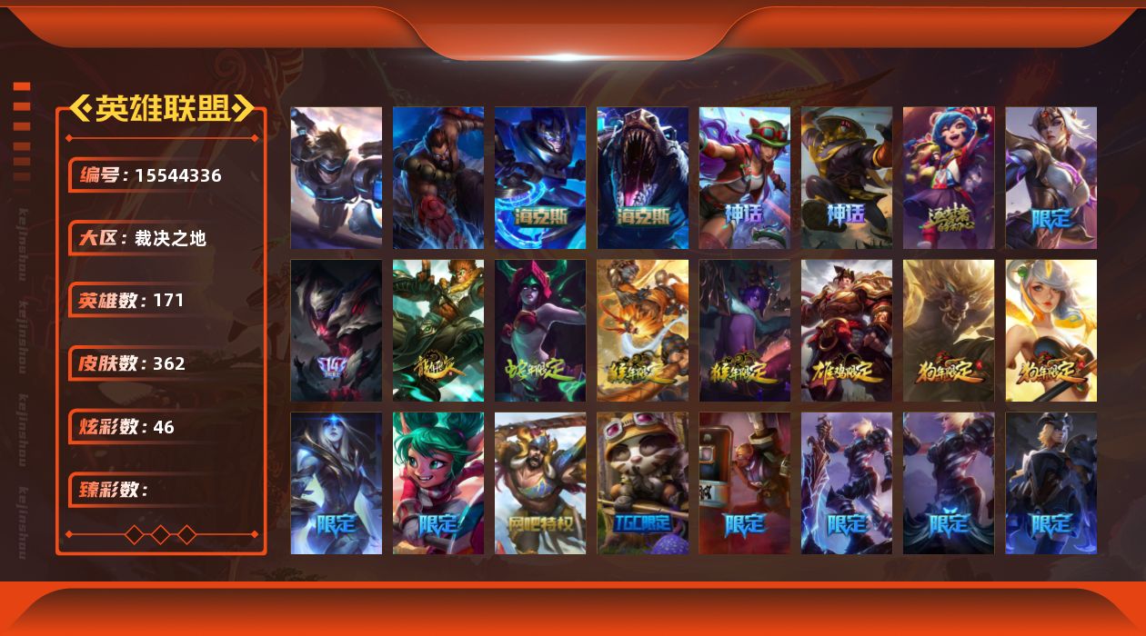 【300438】[15544336]2终极 5神话 55限定 29传说 91史诗 362皮肤 46炫彩 171英雄 可二次 可修改实名 【海克斯】:海克斯 嘉文四世,海克斯 雷克顿【赛季限定皮】:胜利女神-菲奥娜,胜利之运 崔斯特,胜利剑圣 易,胜利女神 娑娜,胜利巨口 克格莫,胜利之树 茂凯,胜利机器人 布里茨【冠军限定系列】:S1FNC 嘉文四世,S1FNC 库奇,S2 暗杀星 发条,S2