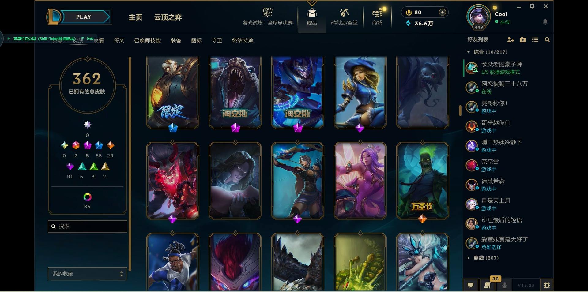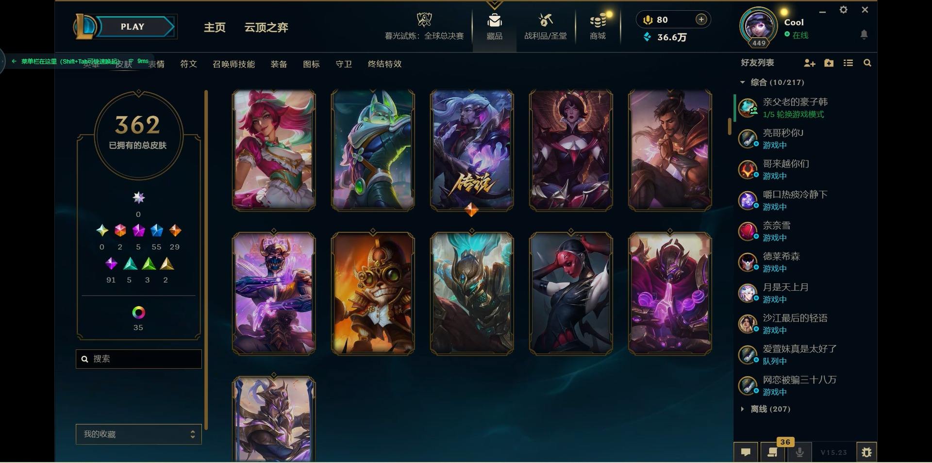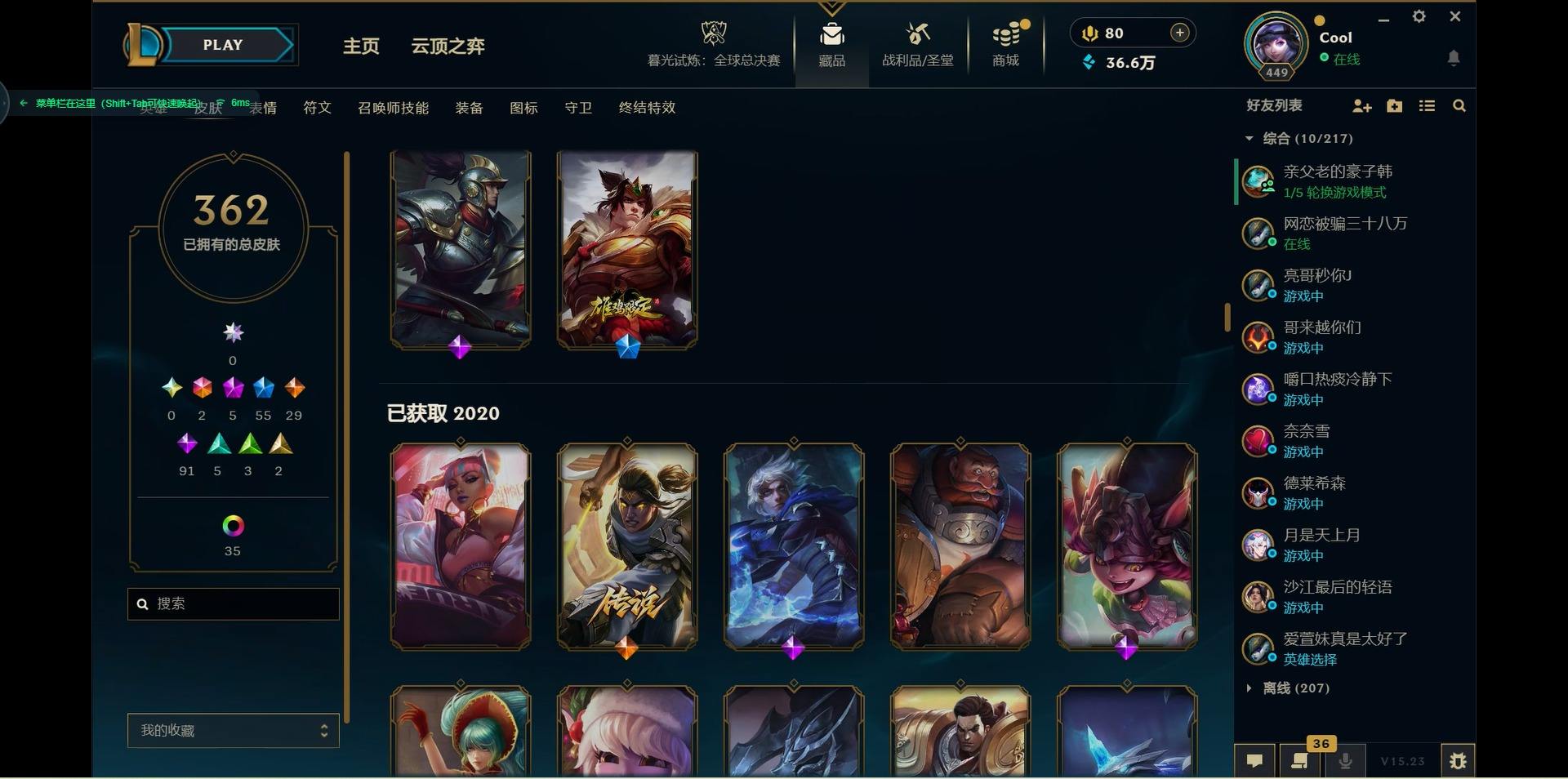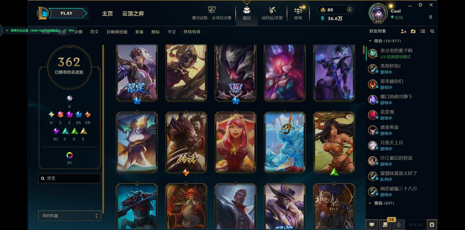 【300438】[15544336]2终极 5神话 55限定 29传说 91史诗 362皮肤 46炫彩 171英雄 可二次 可修改实名 【海克斯】:海克斯 嘉文四世,海克斯 雷克顿【赛季限定皮】:胜利女神-菲奥娜,胜利之运 崔斯特,胜利剑圣 易,胜利女神 娑娜,胜利巨口 克格莫,胜利之树 茂凯,胜利机器人 布里茨【冠军限定系列】:S1FNC 嘉文四世,S1FNC 库奇,S2 暗杀星 发条,S2