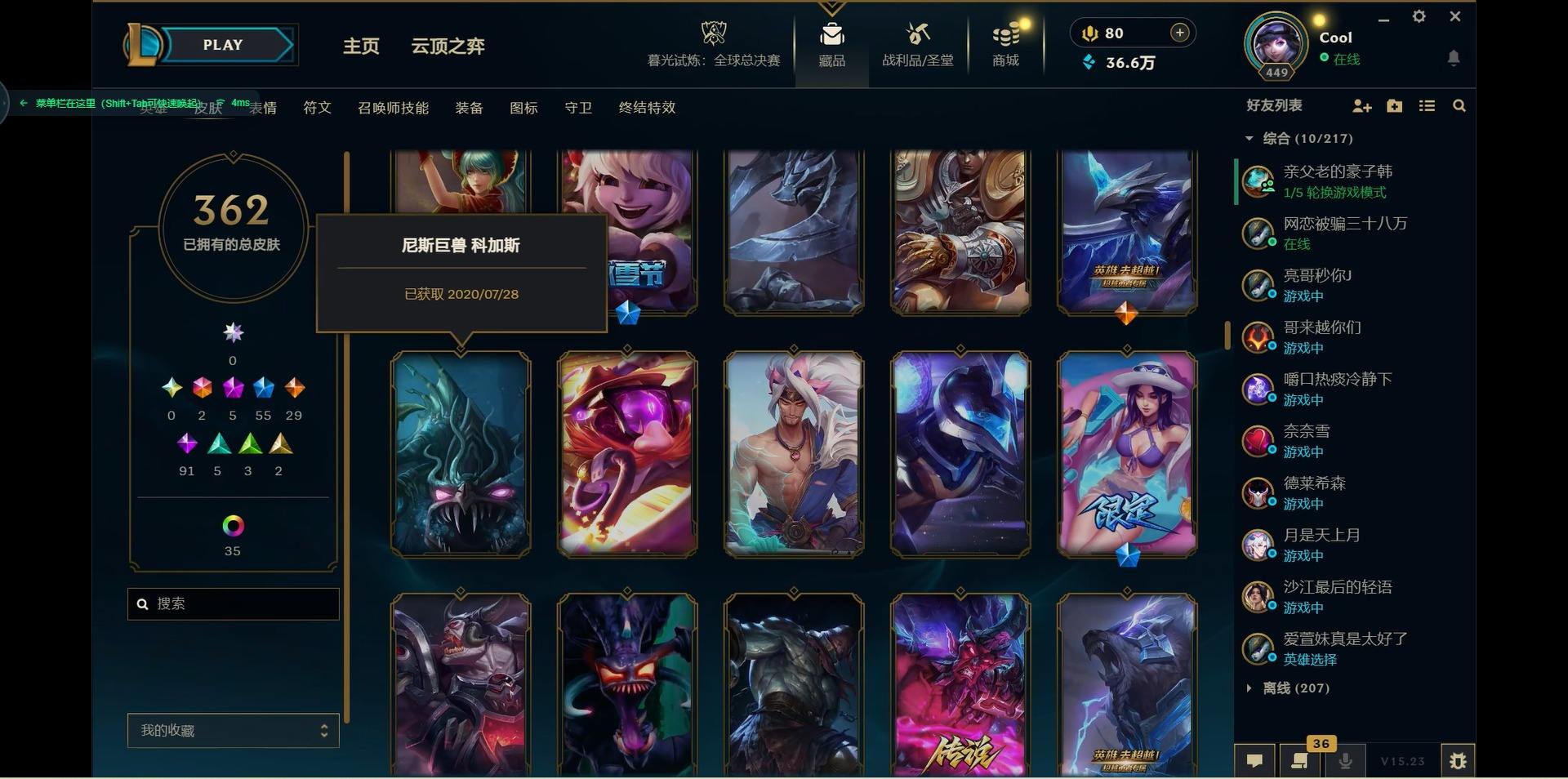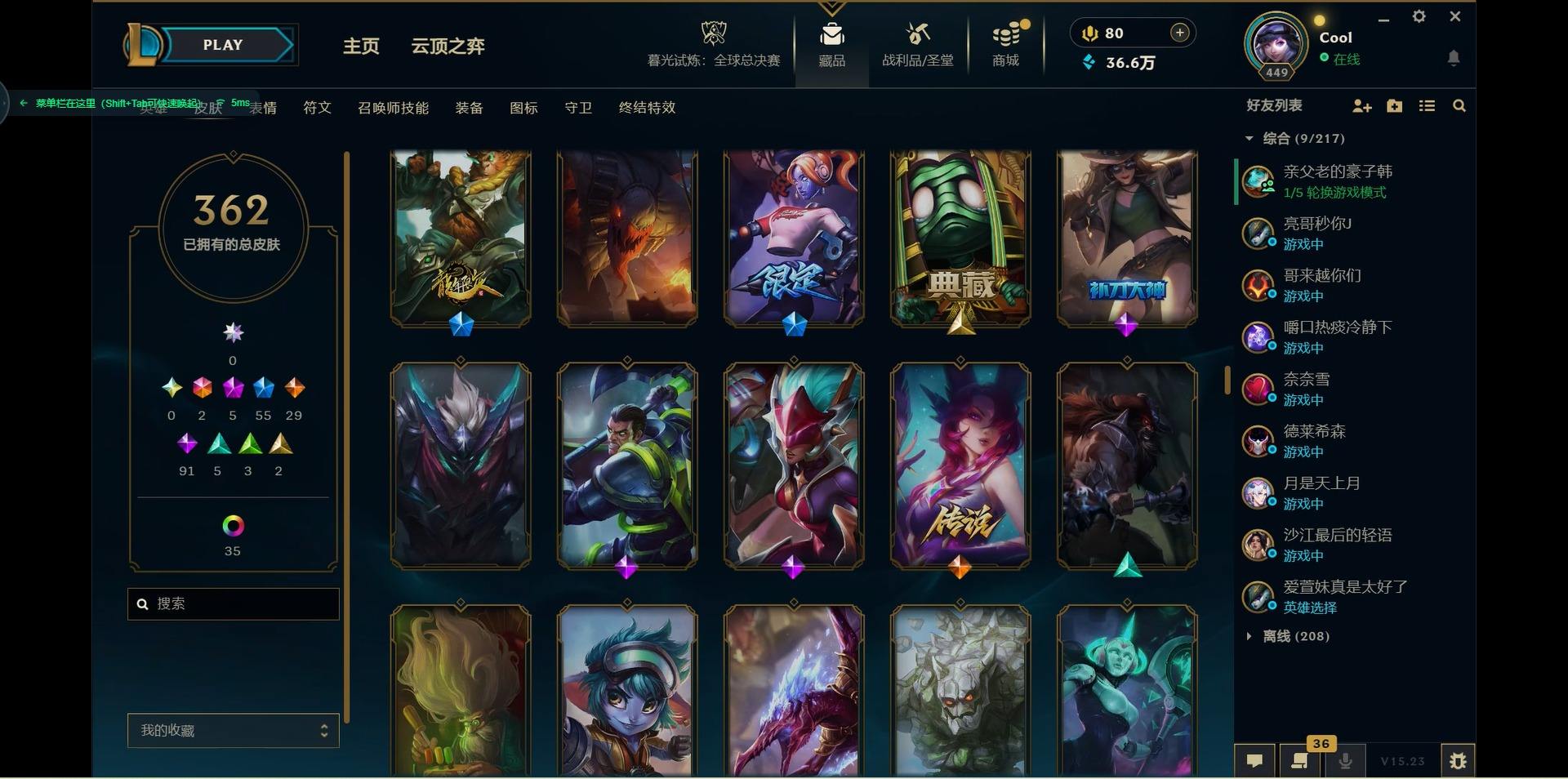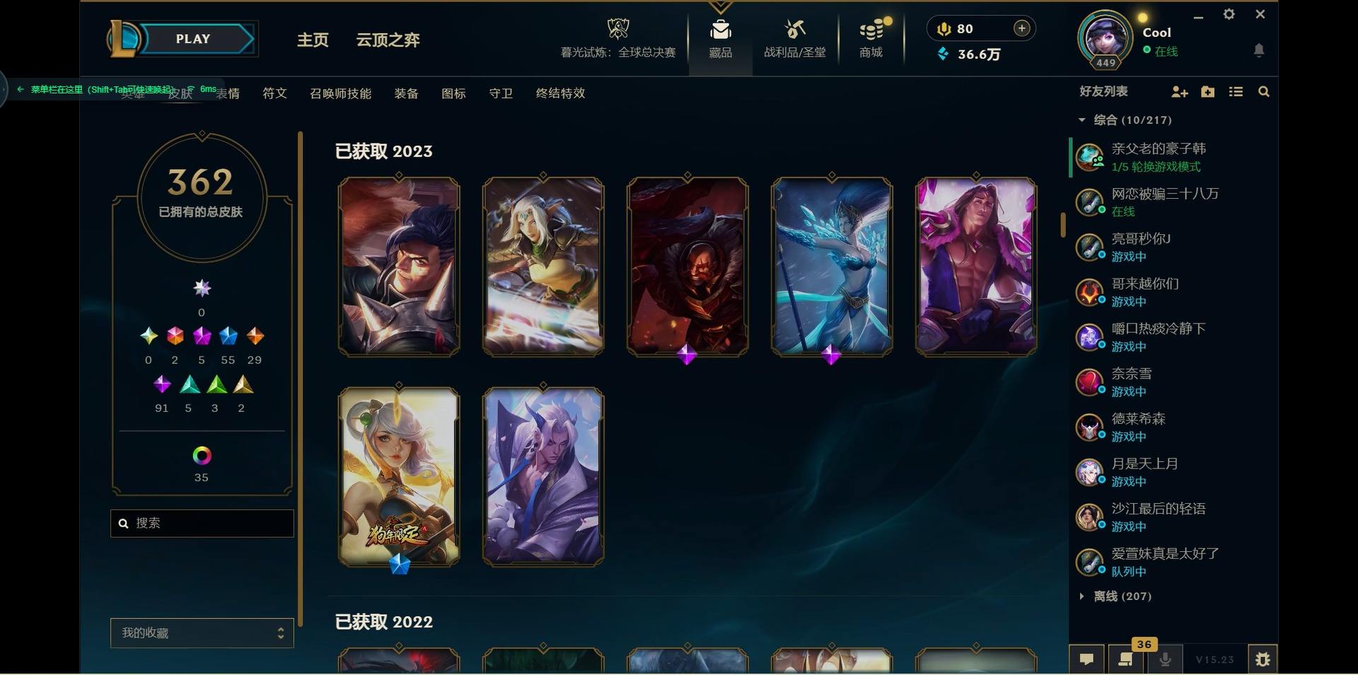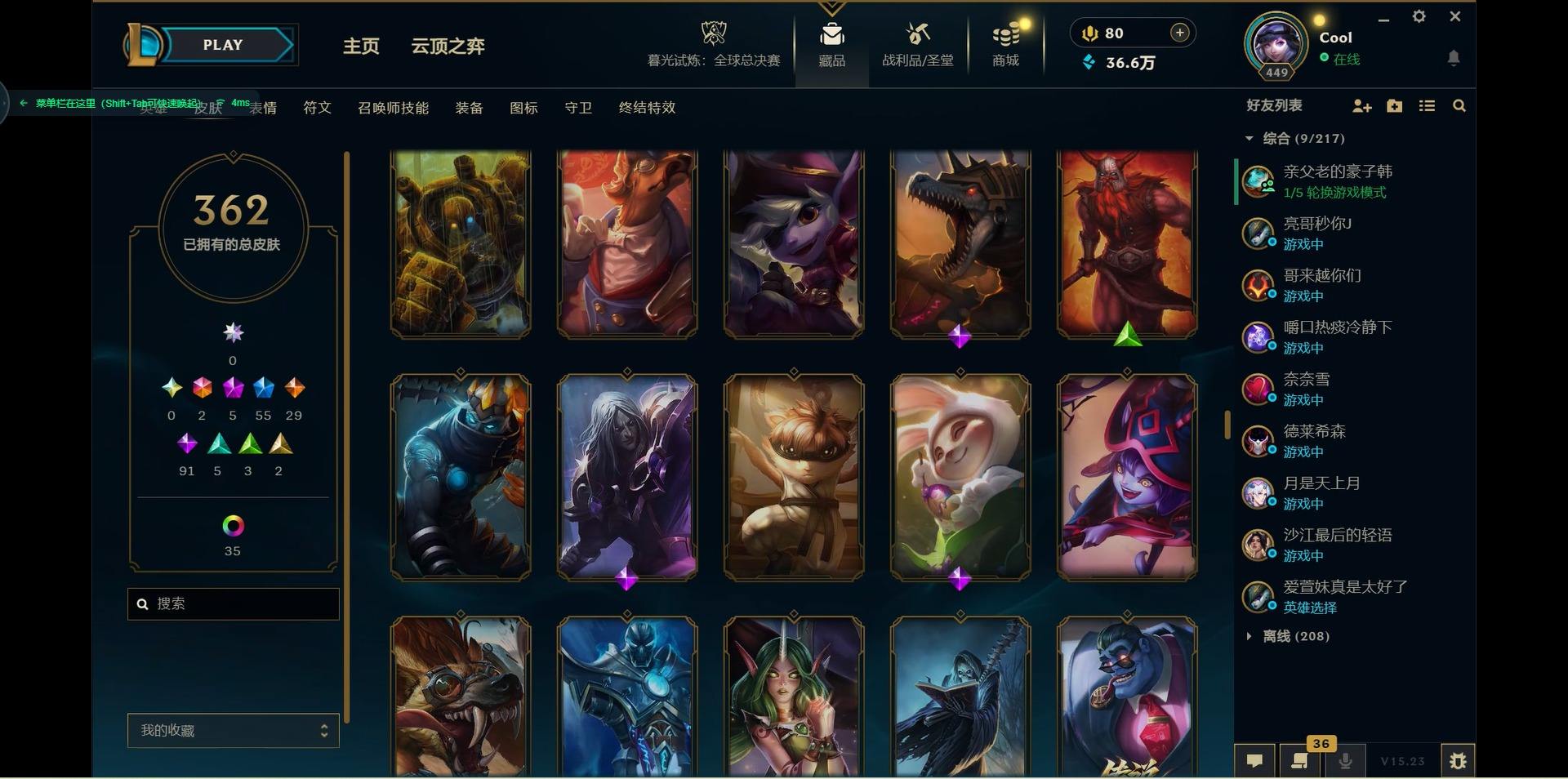 【300438】[15544336]2终极 5神话 55限定 29传说 91史诗 362皮肤 46炫彩 171英雄 可二次 可修改实名 【海克斯】:海克斯 嘉文四世,海克斯 雷克顿【赛季限定皮】:胜利女神-菲奥娜,胜利之运 崔斯特,胜利剑圣 易,胜利女神 娑娜,胜利巨口 克格莫,胜利之树 茂凯,胜利机器人 布里茨【冠军限定系列】:S1FNC 嘉文四世,S1FNC 库奇,S2 暗杀星 发条,S2