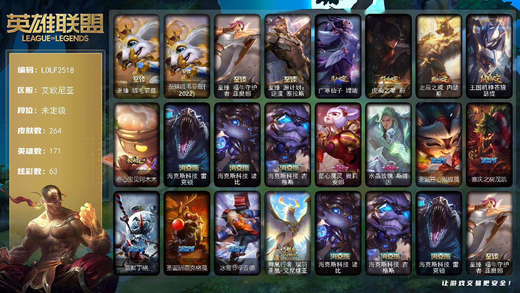 【300534】【LOLF2518】171英雄/264皮肤/8神话/38限定/3臻彩/63炫彩/28传说/60史诗/未定级/至臻绒毛菲兹/至臻绒毛菲兹(2022)/至臻福牛守护者菲奥娜/至臻源计划:逆流塞拉斯/源计划火菲奥娜惩戒/魔女阿卡丽虚荣/净雪之月莫甘娜冬虹/广寒仙子嫦娥/虎痴之拳蔚/北辰之威内瑟斯/王国机神苍狼瑟提/点心宝贝阿木木/海克斯科技雷克顿/海克斯科技波比/海克斯科技吉格斯/觅心