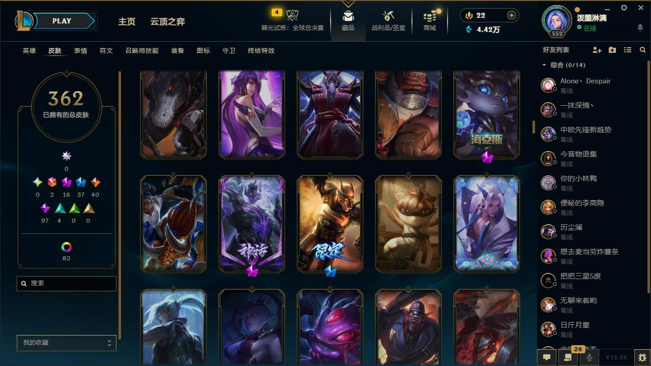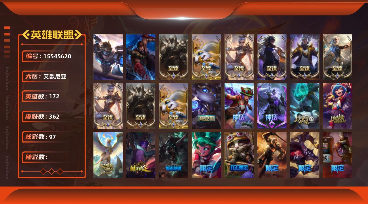 【300889】[15545620]2终极 16神话 37限定 40传说 97史诗 362皮肤 97炫彩 172英雄 可二次 可修改实名 【至臻】:至臻 腥红之月 亚托克斯(2022),至臻 绒毛 菲兹(2022),至臻 玉剑传说 武剑仙(2022),至臻 腥红之月 亚托克斯,至臻 绒毛菲兹,至臻 玉剑传说 武剑仙,至臻 真实伤害 赛娜,至臻 真实伤害 亚索,至臻 黑夜使者 凯隐【海克斯】:海克