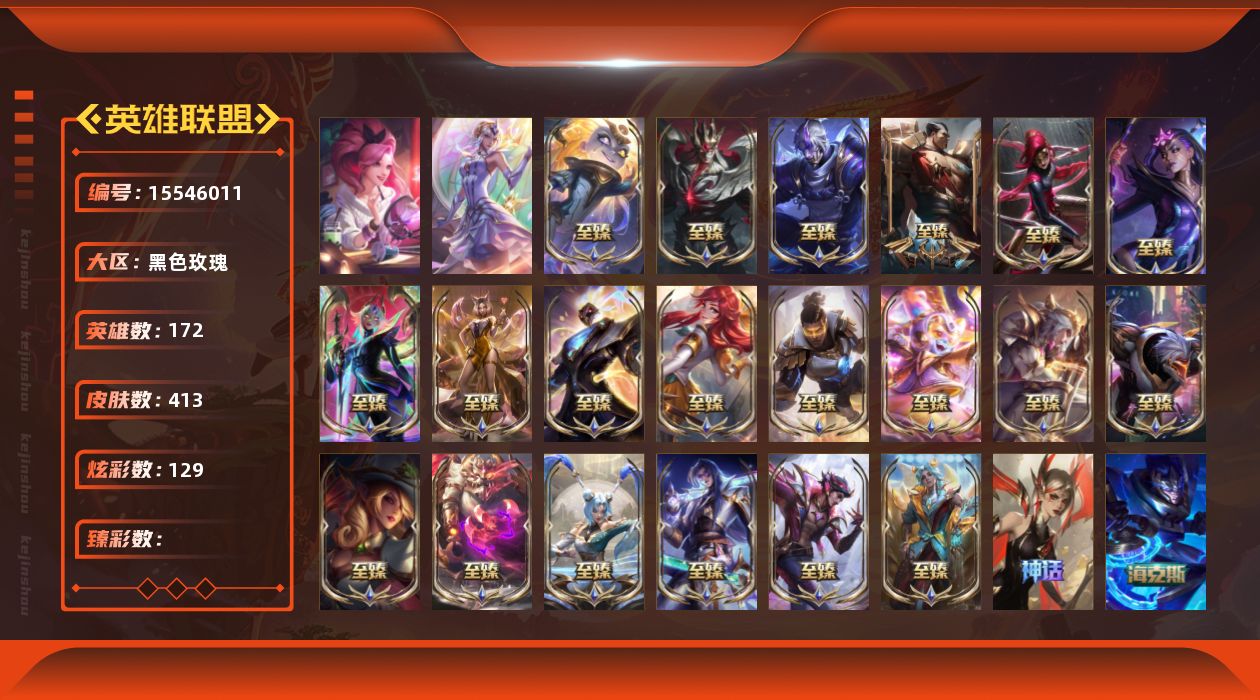 【300995】[15546011]2终极 27神话 43限定 47传说 77史诗 413皮肤 129炫彩 172英雄 可二次 可修改实名 【至臻】至臻 天龙之子 伊泽瑞尔,至臻 神龙尊者 比翼之龙 洛,至臻 心之钢 永恩,至臻 玉剑传说 琴仙子,至臻 永恒星灵 佐伊,至臻 灵魂莲华 劫,至臻 凯旋将军 德莱厄斯,至臻 黑色玫瑰假面舞会 卡特琳娜,至臻 暗星女王 黛安娜,至臻 至高天 凯尔,至臻