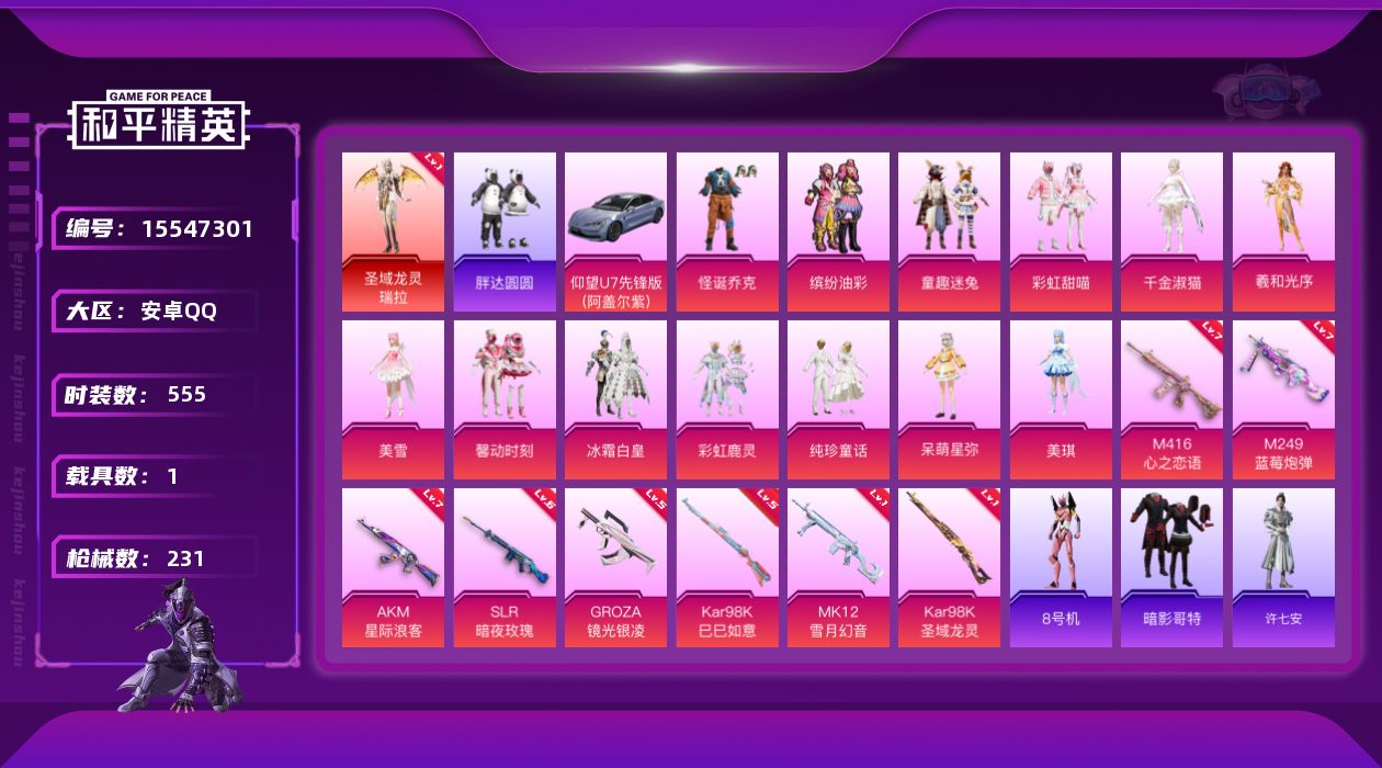 【301235】【不可二次】【安卓QQ】龟仙人 AKM-星际浪客 极速红龙 甜蜜誓约飞行器 汤姆逊-林间仙鹿 GROZA-林间仙鹿 M416-心之恋语 缤纷油彩 馨动时刻 童趣迷兔 瑞龙福将 童趣迷兔飞行器 醒狮腾龙 梦之呓语 纯白誓言 胖达圆圆 团圆交子 怪诞乔克 暗夜契约 M762-瑞龙福将 彩虹鹿灵 糯粉咩咩 圣域龙灵-瑞拉 M249-蓝莓炮弹 SLR-暗夜玫瑰 暗影哥特 冰霜白皇