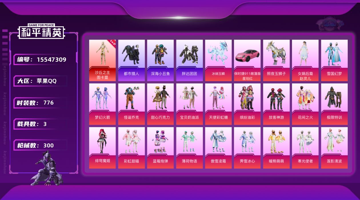 【301236】【不可二次】【苹果QQ】龟仙人 水银刺客 漫步者 M416-星际漫游 花间之火 都市猎人 M762-奇异狩猎者 沙丘之主-图卡盟 UMP45-量子极限 M249-彩虹甜喵 缤纷油彩 深海小丑鱼 SCAR-童趣迷兔 AKM-甜心宝贝 AKM-奇异狩猎者 怪诞乔克 迅捷狂鲨 狂沙舞者 龙翔九天飞行器 天之羽翼飞行器 星夜魔法师飞行翼 蓝莓炮弹 S686-奇异狩猎者 雪国梦幻 M416