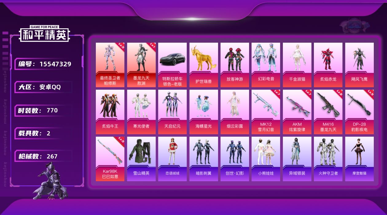 【301242】【可二次】【安卓QQ】龟仙人 爱神 MK20-H-海螺星光 飓风飞鹰 炙焰赤龙 M249-古堡领主 特斯拉3银色 黑色刀锋 天启纪元 极速红龙 龙翔九天飞行器 M416-墨龙九天 AKM-炫紫旋律 放客神游 古战神甲飞行器 墨龙九天-敖渊 粉红小猪 M24-香水柠檬 神秘黑猫 深海曼妙飞行器 雪山精英 最终圣卫者-帕修斯