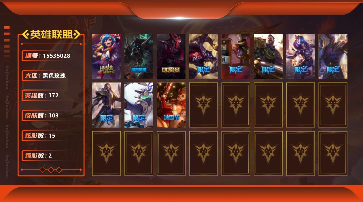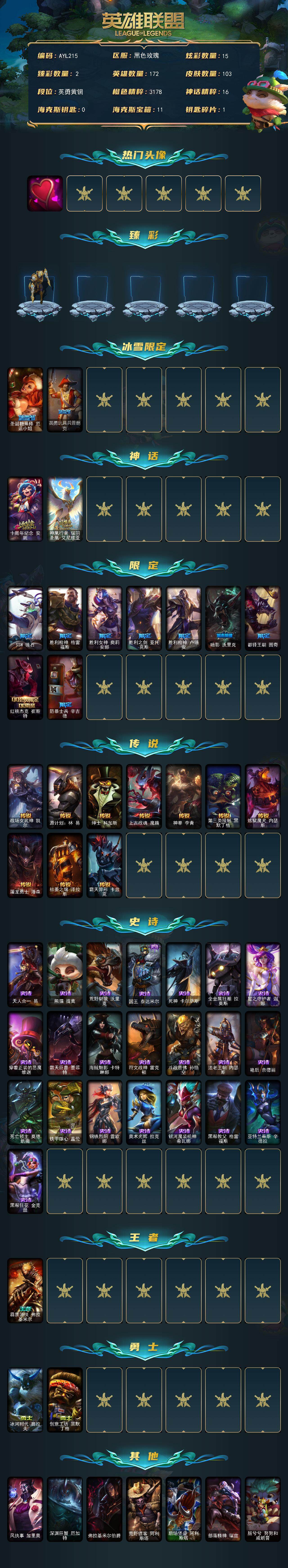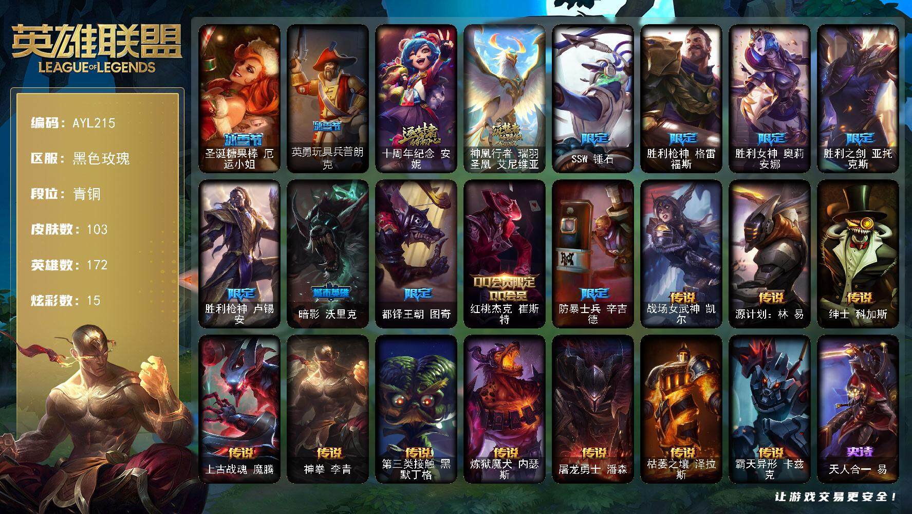 【301292】[15535028]【店主推荐捡漏号!可直接换绑】 青铜段位-172英雄-103皮肤-15炫彩-0终极-2神话-11限定-10传说-22史诗 【热门头像】:爱意绵绵头像 【臻彩皮肤】:冠军之隐劫凯旋圣装,预知之眼亚索不怠 【冰雪限定】:圣诞糖果棒厄运小姐,英勇玩具兵普朗克 【神话皮肤】:十周年纪念安妮,神凰行者瑞羽圣凰艾尼维亚 【限定皮肤】:SSW锤石,胜利枪神格雷福斯,胜利女神