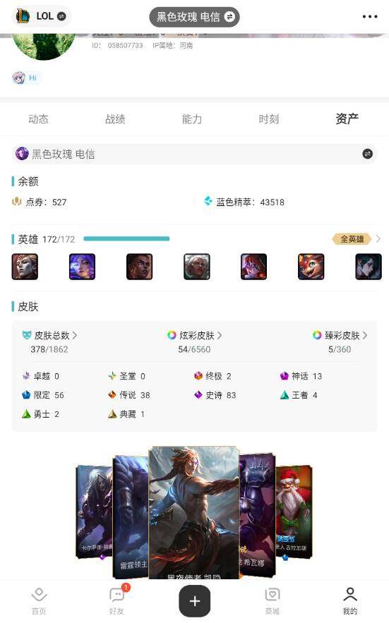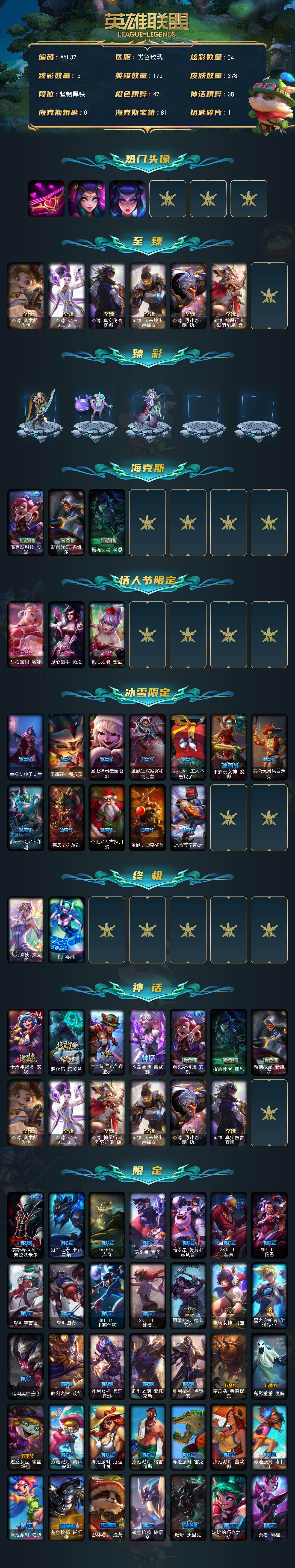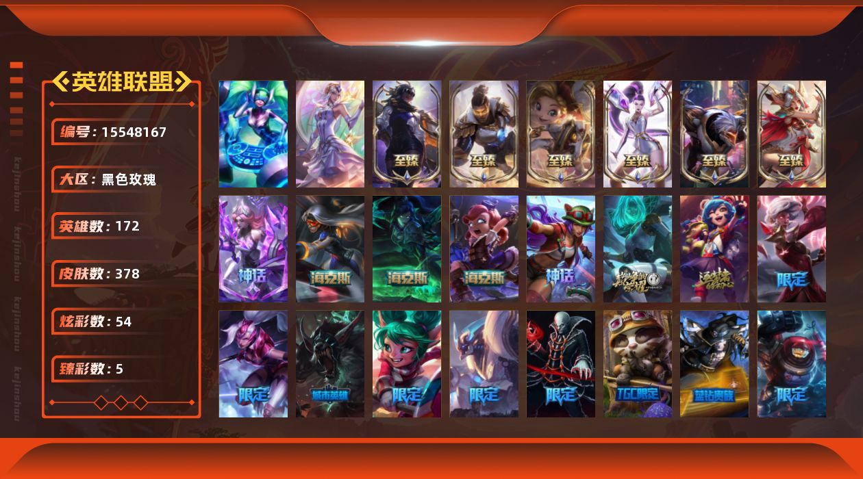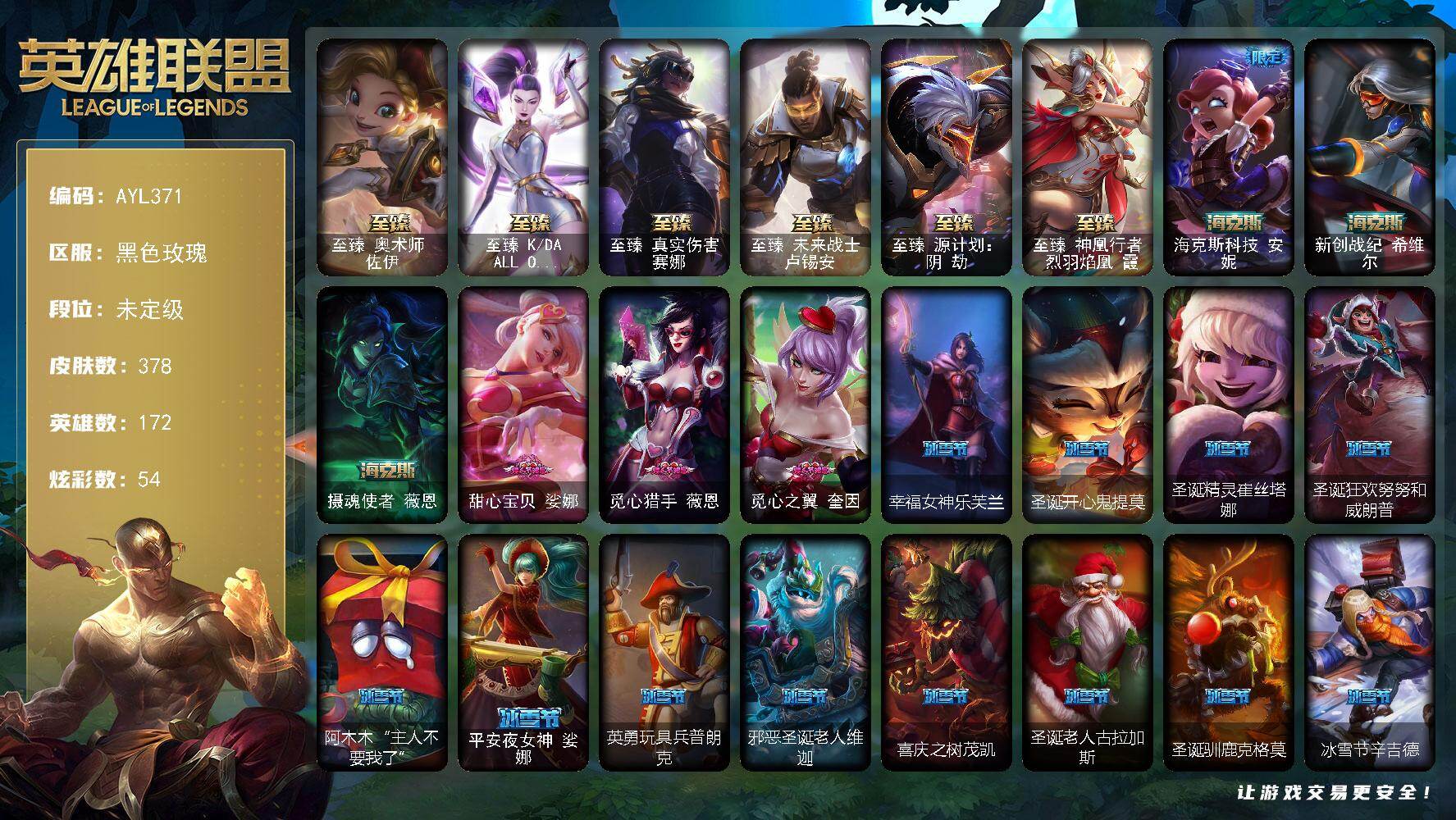 【301532】[15548167]【特价出售/店主推荐】未定级段位-172英雄-378皮肤-54炫彩-2终极-13神话-56限定-38传说-83史诗【热门头像】:爱情之歌头像,玉剑传说寒潭夭夭头像,玉剑传说苍鸾头像【至臻皮肤】:至臻奥术师佐伊,至臻KDAALLOUT卡莎,至臻真实伤害赛娜,至臻未来战士卢锡安,至臻源计划阴劫,至臻神凰行者烈羽焰凰霞【臻彩皮肤】:天龙之子卡莎飞龙乘云,冠军之箭艾希