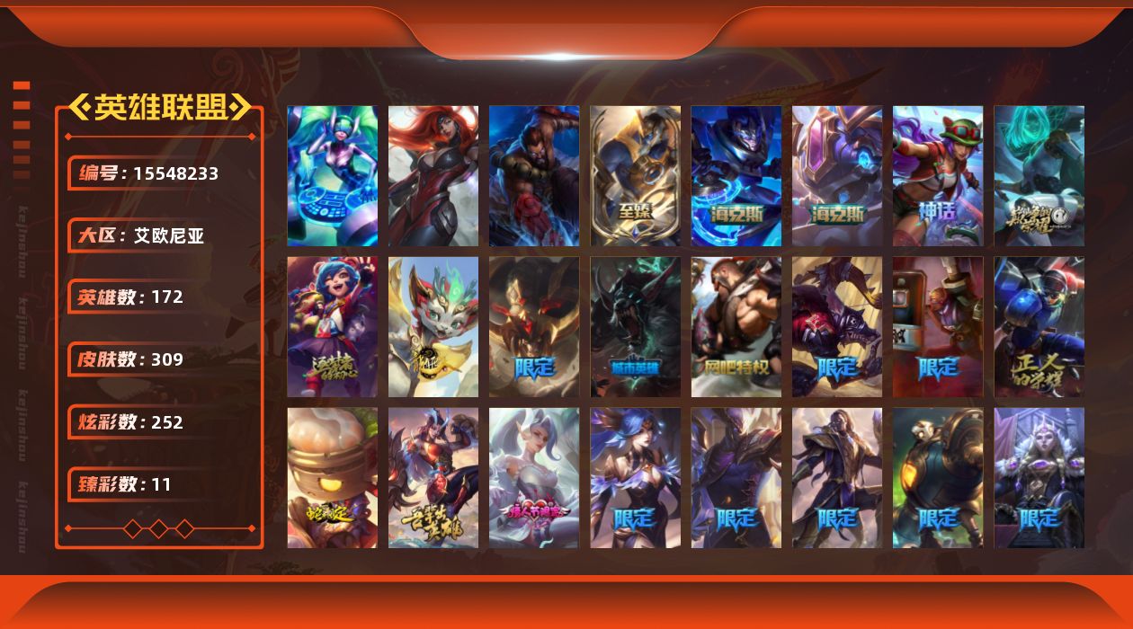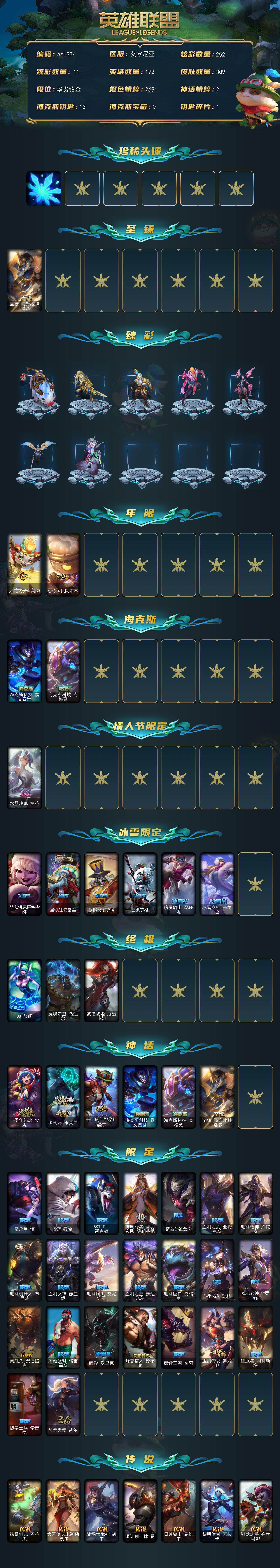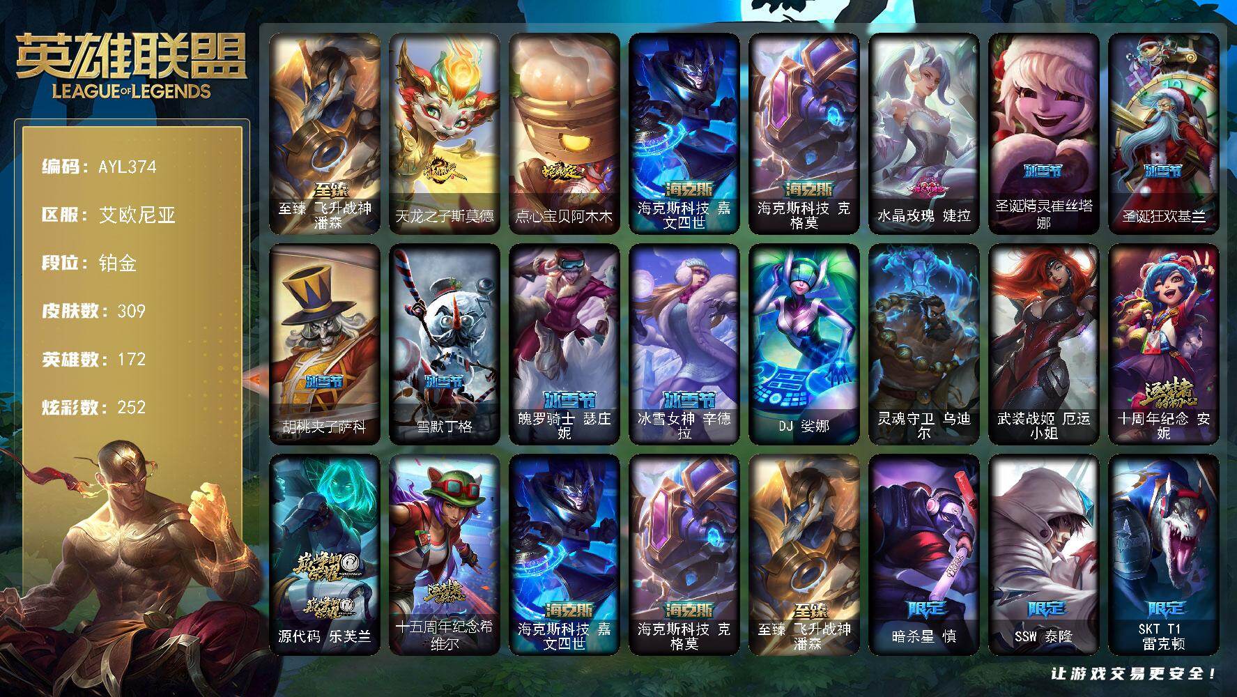 【301553】[15548233]【特价出售/店主推荐】铂金段位-172英雄-309皮肤-252炫彩-3终极-6神话-32限定-34传说-63史诗【珍稀头像】:雪花头像【至臻皮肤】:至臻飞升战神潘森【臻彩皮肤】:天龙之子卡莎飞龙乘云,无畏骑士瑟庄妮赤子初心,赵云子龙炫金将军,冠军之志瑞兹凯旋圣装,神龙尊者圣龙李青登龙,斗魂觉醒拉克丝无限斗志,弹幕天使卡莎炽天使勇敢,玉剑传说翼剑仙珠光,魔女阿卡