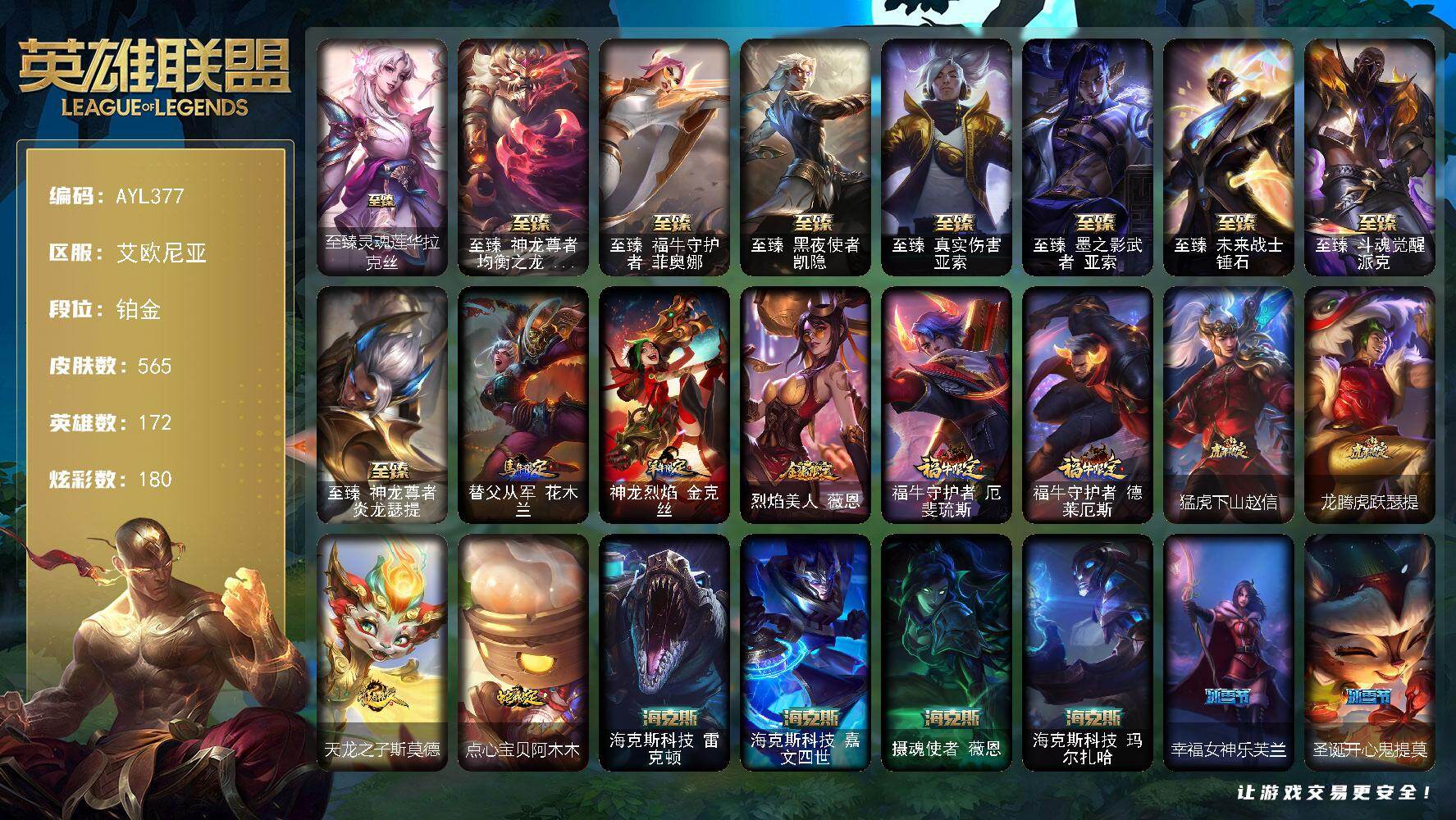 【301584】[15548361]【特价出售/店主推荐】铂金段位-172英雄-565皮肤-180炫彩-2终极-19神话-94限定-78传说-113史诗【热门头像】:爱情之歌头像【至臻皮肤】:至臻灵魂莲华拉克丝,至臻神龙尊者均衡之龙沃利贝尔,至臻福牛守护者菲奥娜,至臻黑夜使者凯隐,至臻真实伤害亚索,至臻墨之影武者亚索,至臻未来战士锤石,至臻斗魂觉醒派克,至臻神龙尊者炎龙瑟提【臻彩皮肤】:天龙之子