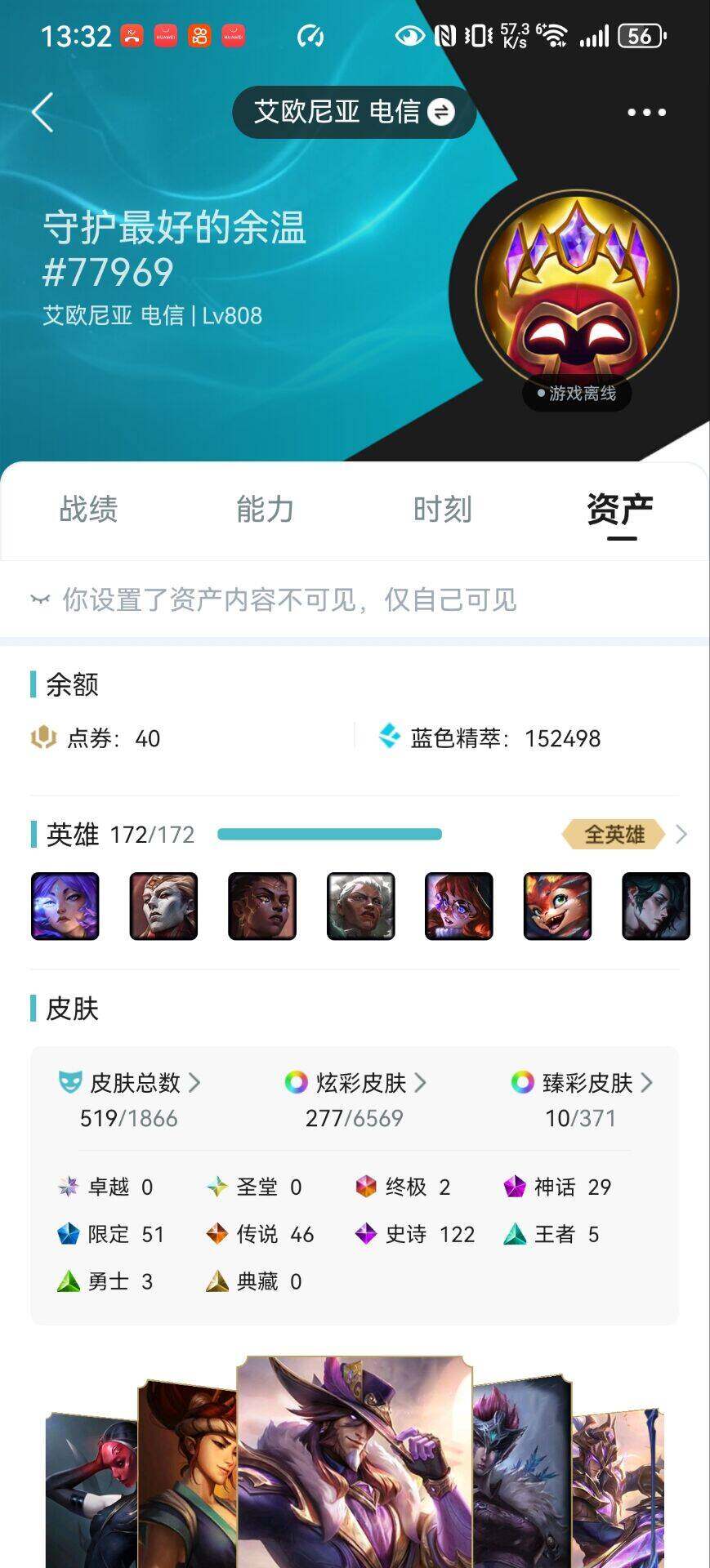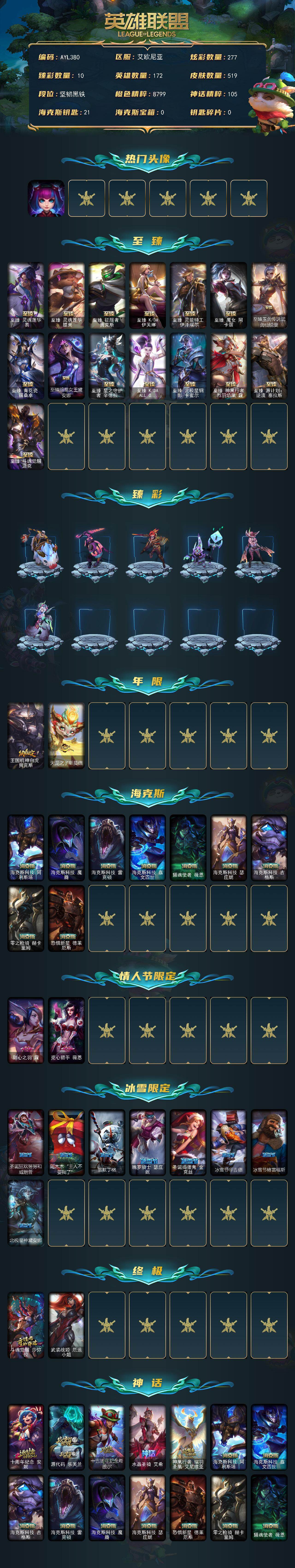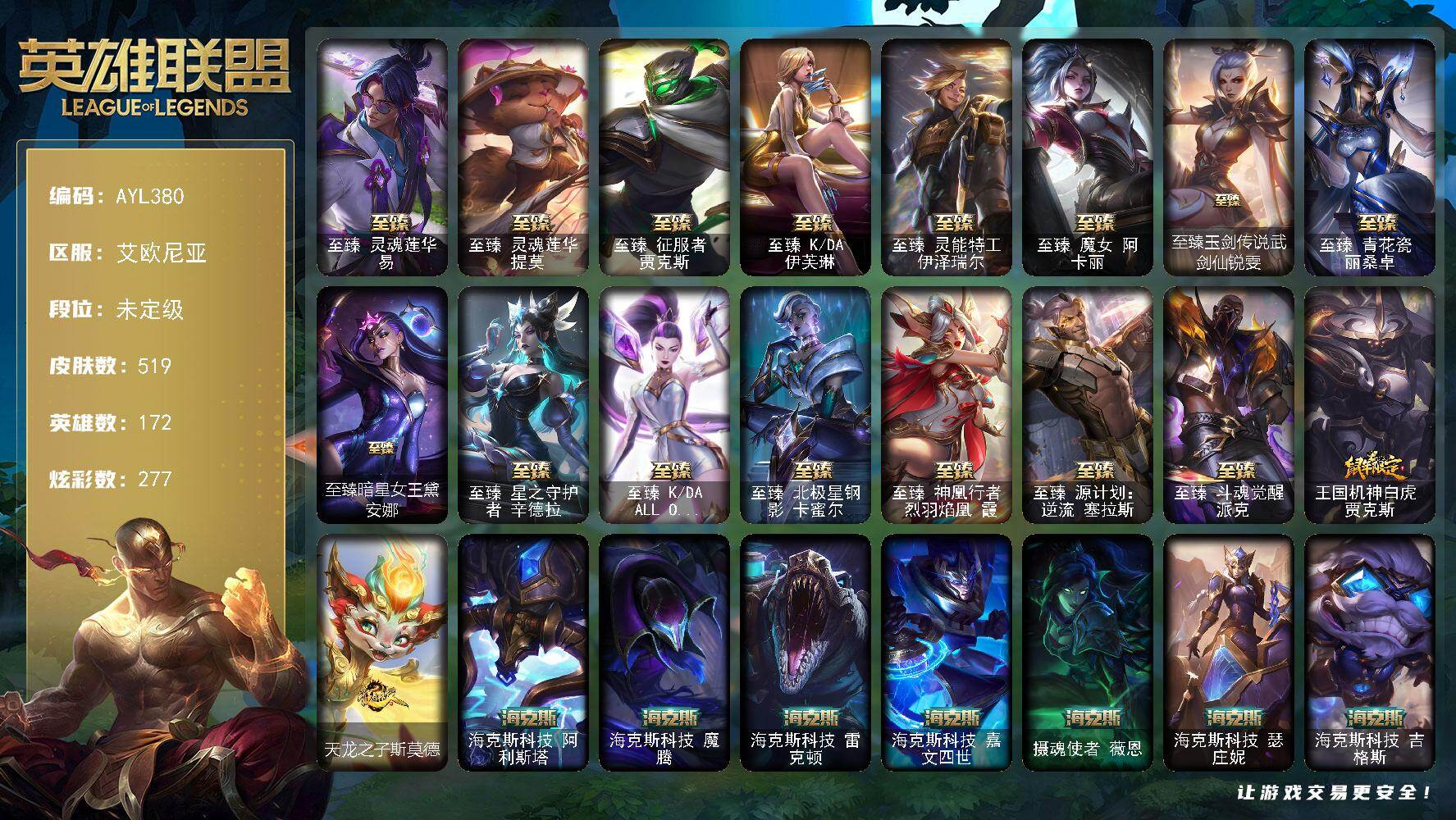 【301647】[15548705]【特价出售/店主推荐】未定级段位-172英雄-519皮肤-277炫彩-2终极-29神话-51限定-46传说-122史诗【热门头像】:银河魔装机神安妮头像【至臻皮肤】:至臻灵魂莲华易,至臻灵魂莲华提莫,至臻征服者贾克斯,至臻KDA伊芙琳,至臻灵能特工伊泽瑞尔,至臻魔女阿卡丽,至臻玉剑传说武剑仙锐雯,至臻青花瓷丽桑卓,至臻暗星女王黛安娜,至臻星之守护者辛德拉,至臻