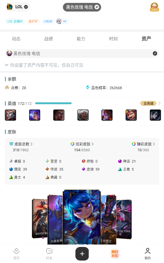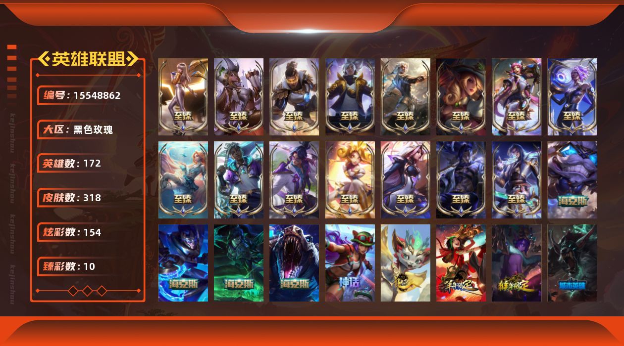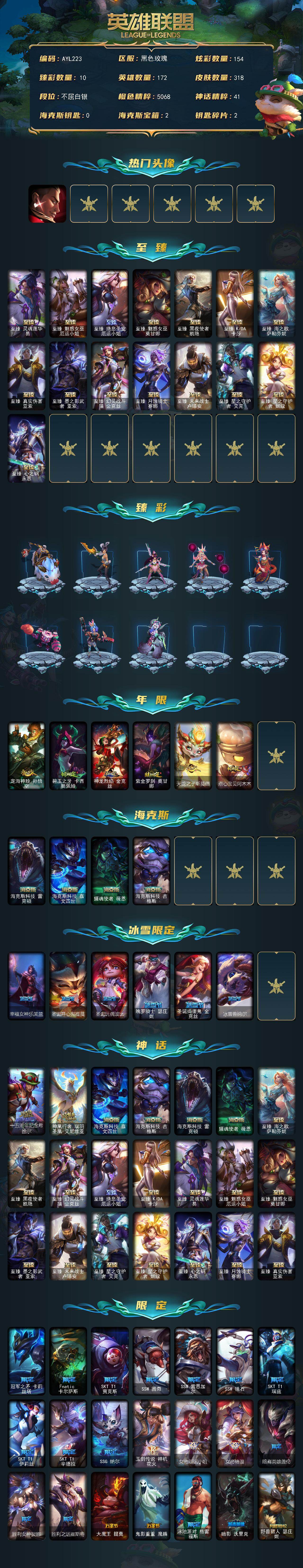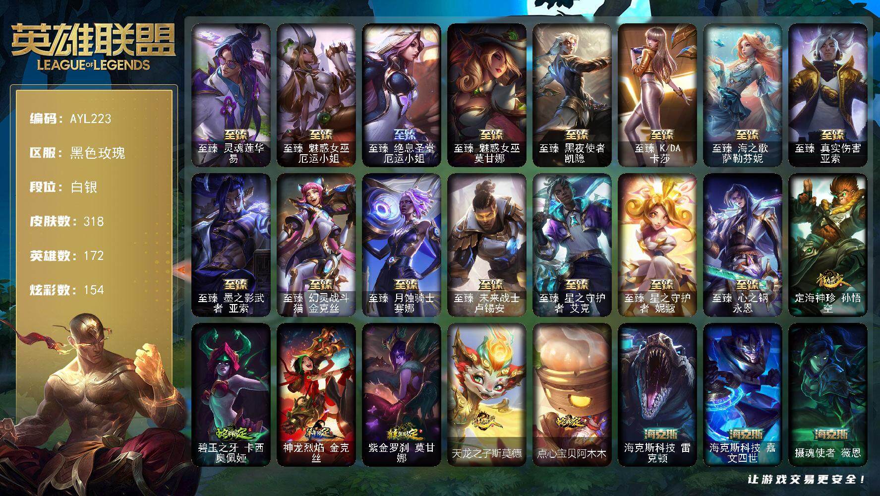 【301676】[15548862]【特价出售/店主推荐】白银段位-172英雄-318皮肤-154炫彩-0终极-21神话-39限定-35传说-59史诗【热门头像】:觅心游侠卢锡安头像【至臻皮肤】:至臻灵魂莲华易,至臻魅惑女巫厄运小姐,至臻绝息圣堂厄运小姐,至臻魅惑女巫莫甘娜,至臻黑夜使者凯隐,至臻KDA卡莎,至臻海之歌萨勒芬妮,至臻真实伤害亚索,至臻墨之影武者亚索,至臻幻灵战斗猫金克丝,至臻月蚀