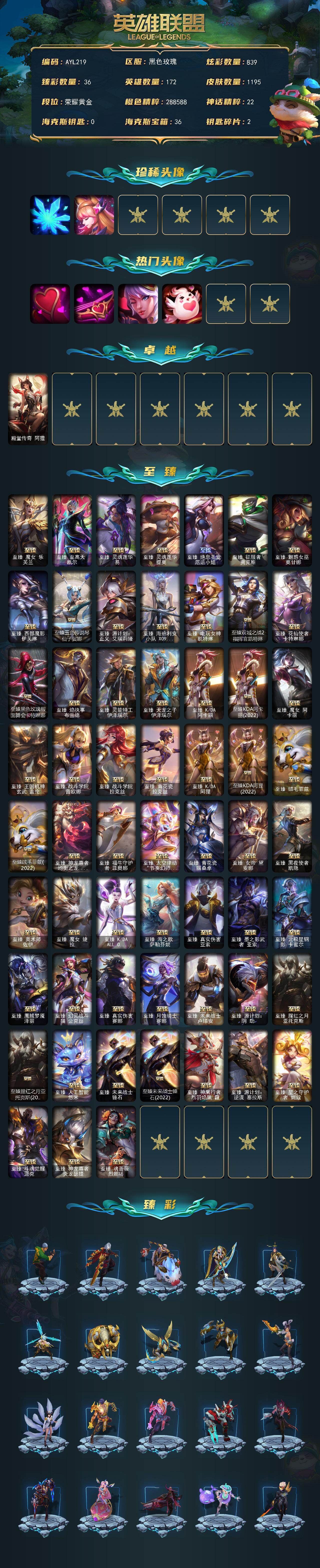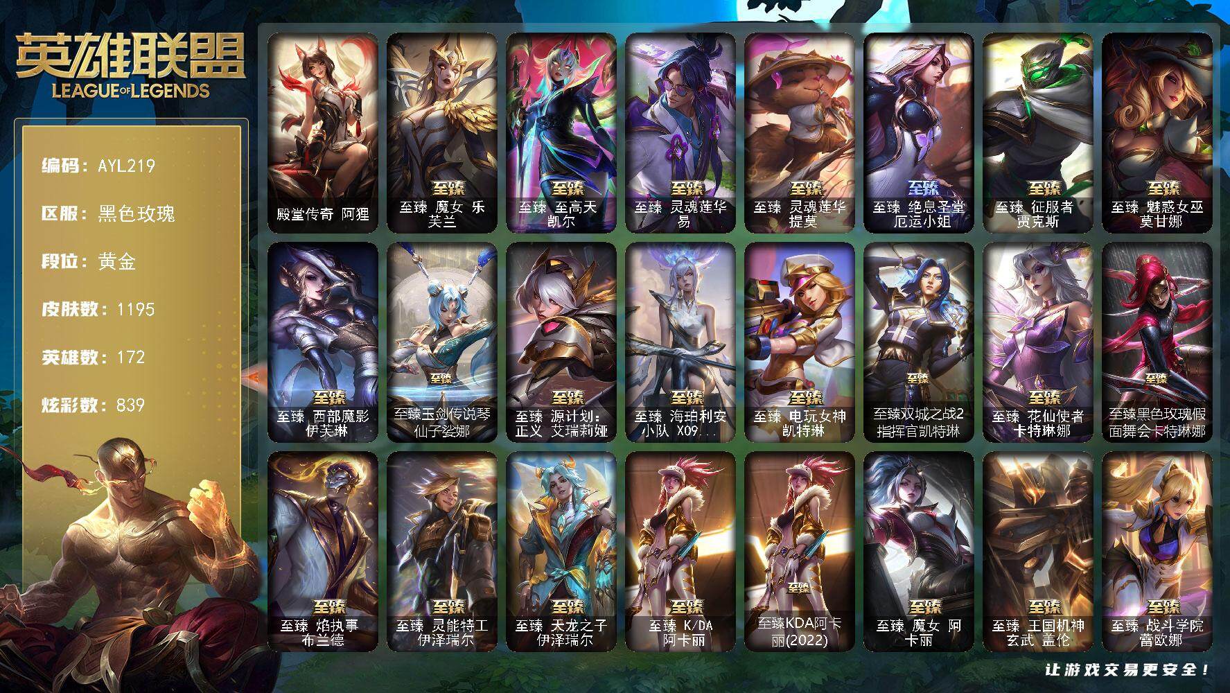 【301705】[15549043]【店主推荐捡漏号!可直接换绑】黄金段位-172英雄-1195皮肤-839炫彩-7终极-88神话-222限定-100传说-213史诗【珍稀头像】:雪花头像,星守阿狸头像【热门头像】:爱意绵绵头像,爱情之歌头像,觅心之翼奎因头像,爱情鸽头像【卓越皮肤】:殿堂传奇阿狸【至臻皮肤】:至臻魔女乐芙兰,至臻至高天凯尔,至臻灵魂莲华易,至臻灵魂莲华提莫,至臻绝息圣堂厄运小姐