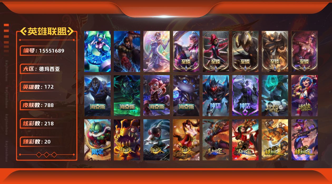 【302024】[15551689]【特价出售/店主推荐】黄金段位-172英雄-788皮肤-218炫彩-3终极-13神话-149限定-70传说-193史诗【热门头像】:春晖神女头像【至臻皮肤】:至臻剪纸仙灵希维尔,至臻黑色玫瑰假面舞会卡特琳娜,至臻黑夜使者李青,至臻王国机神玄武盖伦,至臻战斗学院奇亚娜【臻彩皮肤】:春晖神女拉克丝流风回雪,天龙之子卡莎飞龙乘云,无畏骑士瑟庄妮赤子初心,替父从军花木