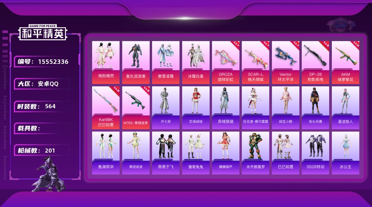 【302144】【可二次】【安卓QQ】AKM-绿萝繁花 S686-奇异狩猎者 M762-青锋波束 Vector-环太平洋 GROZA-旋转彩虹 冰霜白皇