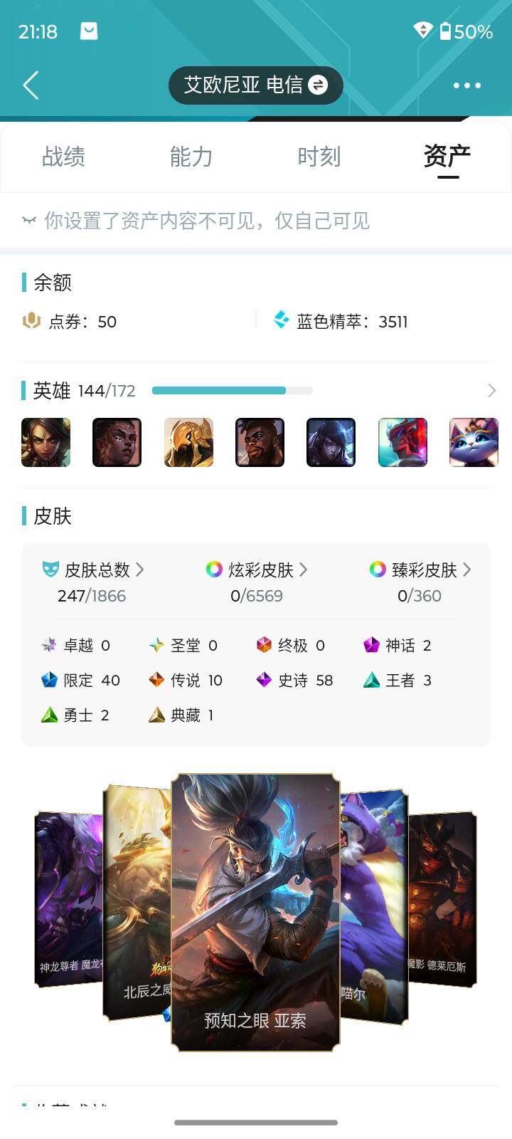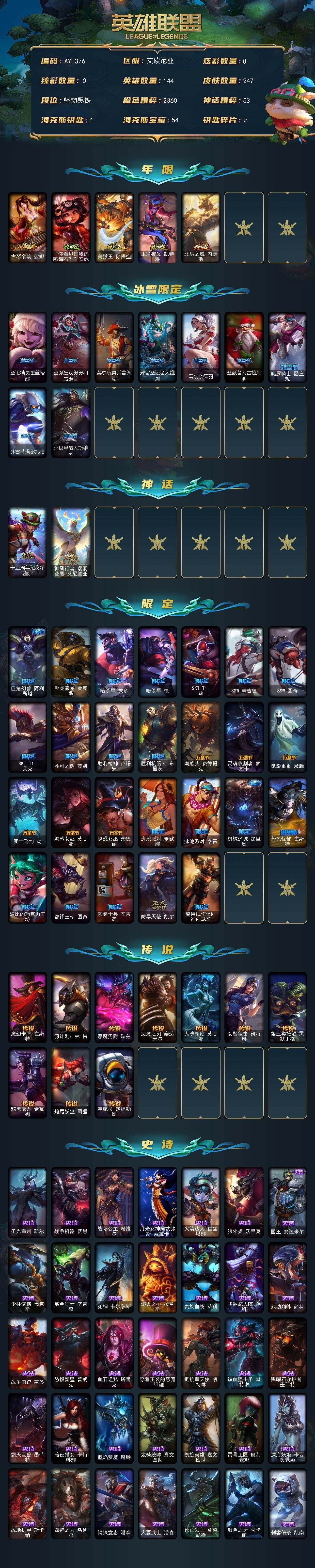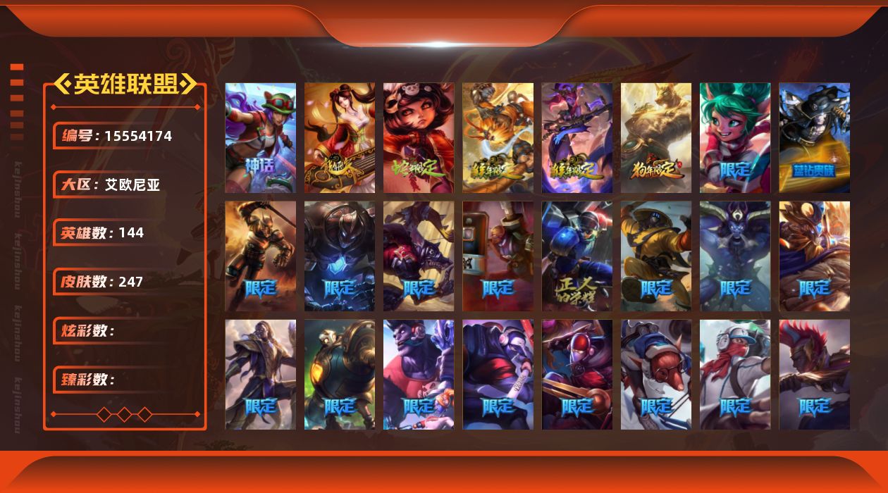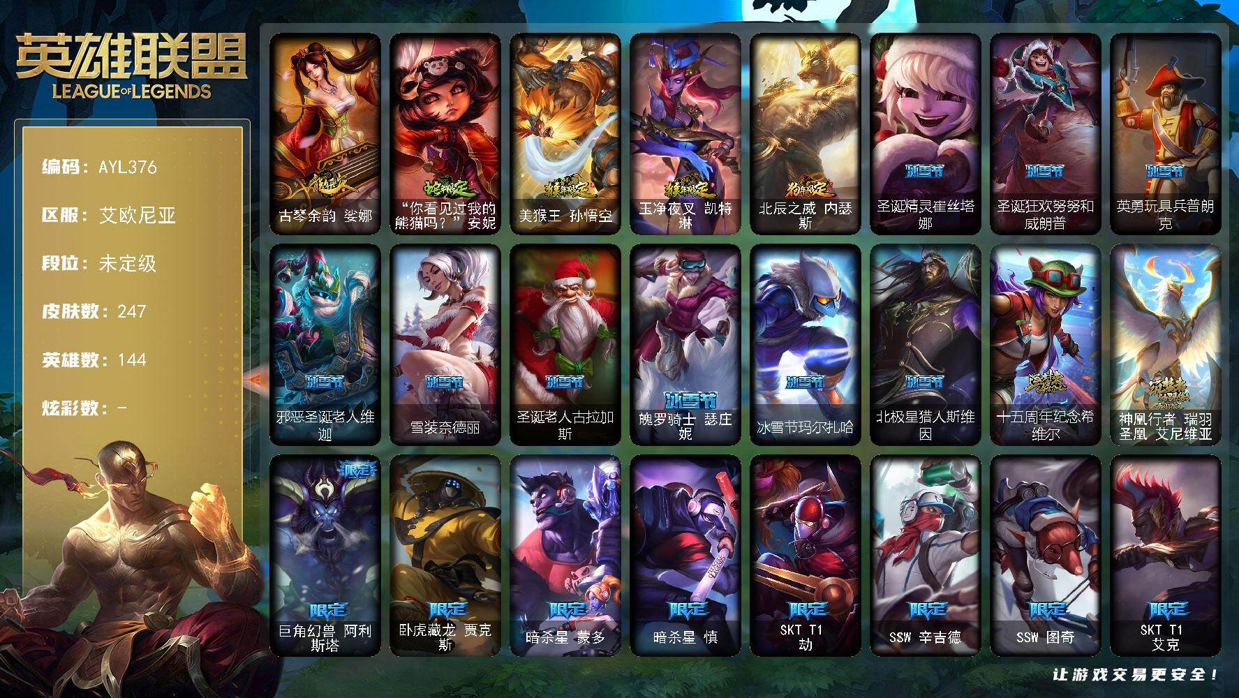 【302458】[15554174]【店主推荐捡漏号】未定级段位-144英雄-247皮肤-0炫彩-0终极-2神话-40限定-10传说-58史诗【年限皮肤】:古琴余韵娑娜,你看见过我的熊猫吗安妮,美猴王孙悟空,玉净夜叉凯特琳,北辰之威内瑟斯【冰雪限定】:圣诞精灵崔丝塔娜,圣诞狂欢努努和威朗普,英勇玩具兵普朗克,邪恶圣诞老人维迦,雪装奈德丽,圣诞老人古拉加斯,魄罗骑士瑟庄妮,冰雪节玛尔扎哈,北极星猎