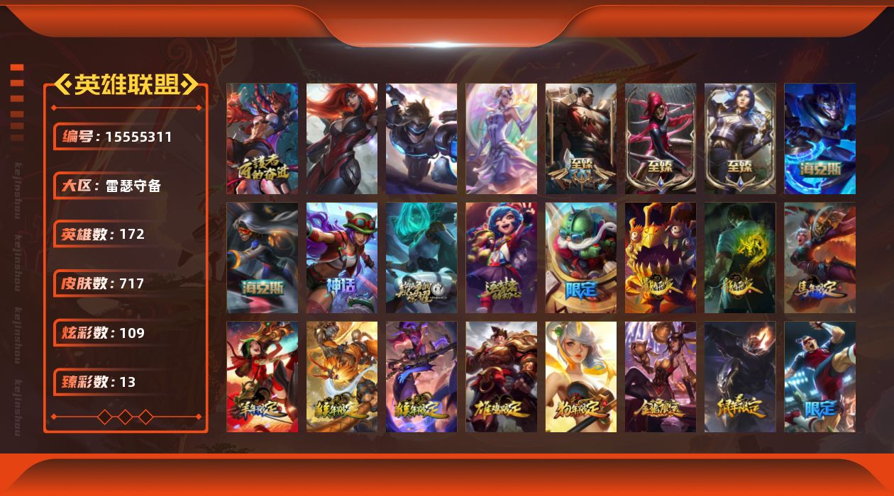 【302595】[15555311]【特价出售/店主推荐】白银段位-172英雄-717皮肤-109炫彩-4终极-8神话-126限定-72传说-159史诗【热门头像】:爱意绵绵头像【至臻皮肤】:至臻双城之战2指挥官凯特琳,至臻黑色玫瑰假面舞会卡特琳娜,至臻凯旋将军德莱厄斯【臻彩皮肤】:天龙之子卡莎飞龙乘云,墨之影武者亚索金墨耀影,冠军之志瑞兹凯旋圣装,冠军之隐劫凯旋圣装,觅心萝莉金克丝是心动啊,灵