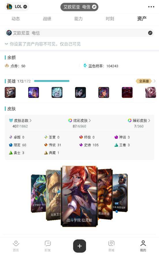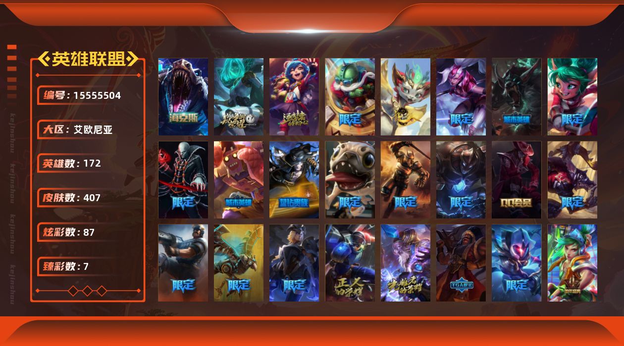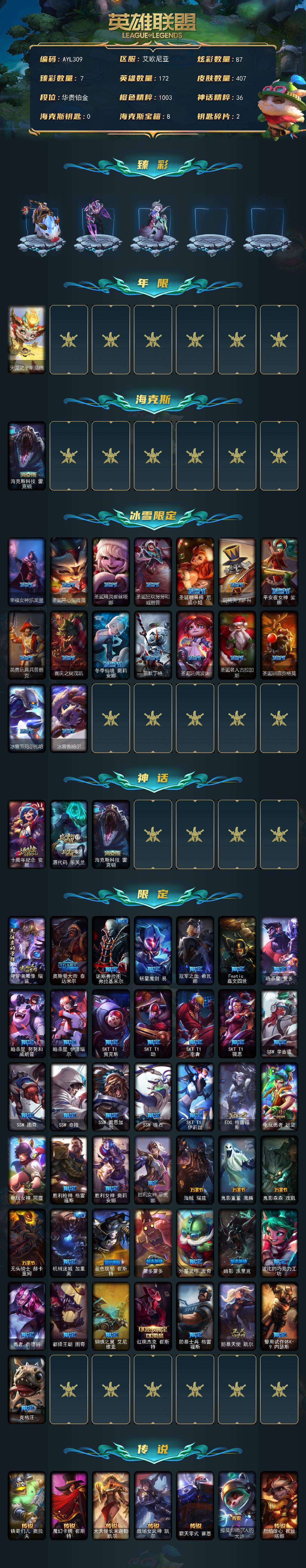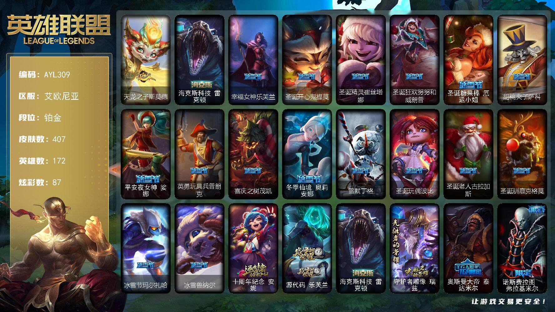 【302625】[15555504]【特价出售/店主推荐】铂金段位-172英雄-407皮肤-87炫彩-0终极-3神话-60限定-31传说-105史诗【臻彩皮肤】:天龙之子卡莎飞龙乘云,无畏骑士瑟庄妮赤子初心,天煞劫恒星游历者,海之歌艾希冰爽浪花,魔女阿卡丽虚荣,净雪之月莫甘娜冬虹,红莲之刃锐雯【年限皮肤】:天龙之子斯莫德【海克斯皮肤】:海克斯科技雷克顿【冰雪限定】:幸福女神乐芙兰,圣诞开心鬼提莫