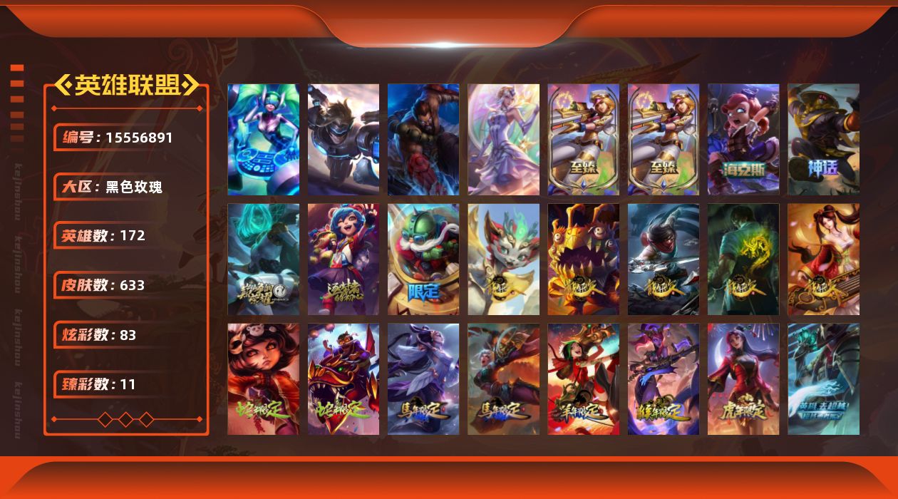 【302797】[15556891]【店主推荐捡漏号,卡拉曼达还有234皮肤】白银段位-172英雄-633皮肤-83炫彩-4终极-8神话-115限定-56传说-161史诗【至臻皮肤】:至臻电玩女神凯特琳,至臻电玩女神凯特琳(2022),至臻永恒星灵佐伊【臻彩皮肤】:天龙之子卡莎飞龙乘云,无畏骑士瑟庄妮赤子初心,墨之影武者亚索金墨耀影,征服者韦鲁斯炫金,幻灵战斗兔锐雯梦幻强袭,可爱可爱粉红红布里茨