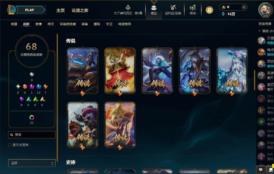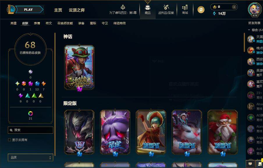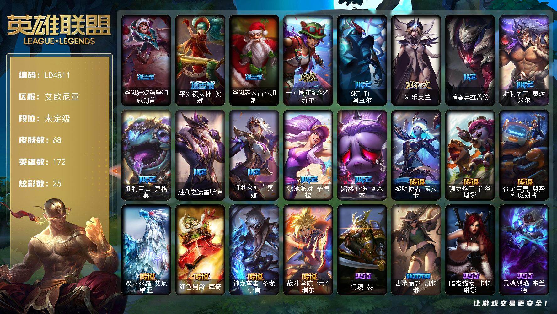 【302807】【LD4811】172英雄/68皮肤/1神话/12限定/4臻彩/25炫彩/7传说/9史诗/未定级账号等级:478/星之守护者娑娜未来之光/星之守护者卡莎热情之光/星之守护者阿卡丽热情之光/幽梦玫瑰辛德拉纯洁花蕾/圣诞狂欢努努和威朗普/平安夜女神娑娜/圣诞老人古拉加斯/十五周年纪念希维尔/SKTT1阿兹尔/IG乐芙兰/暗裔英雄盖伦/胜利之王泰达米尔/胜利巨口克格莫/胜利之运崔斯特/