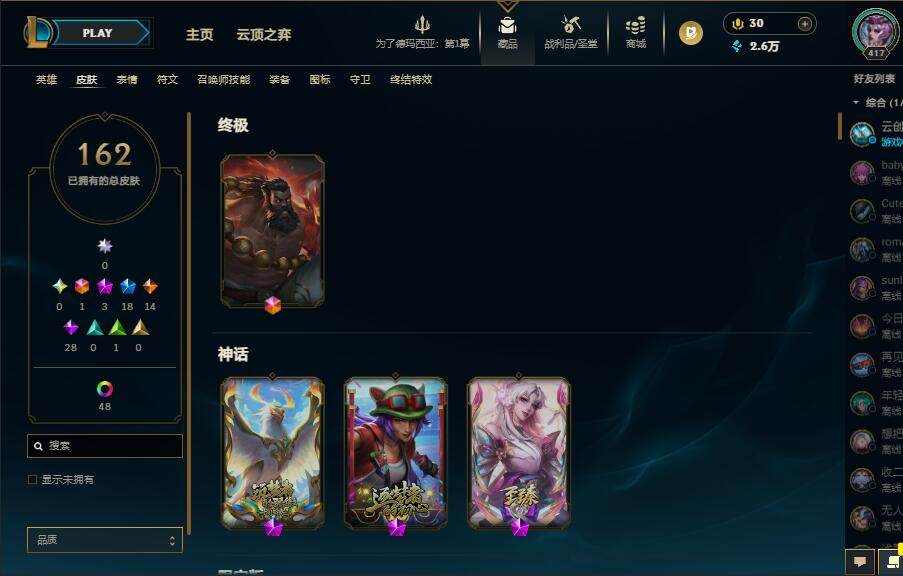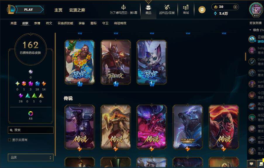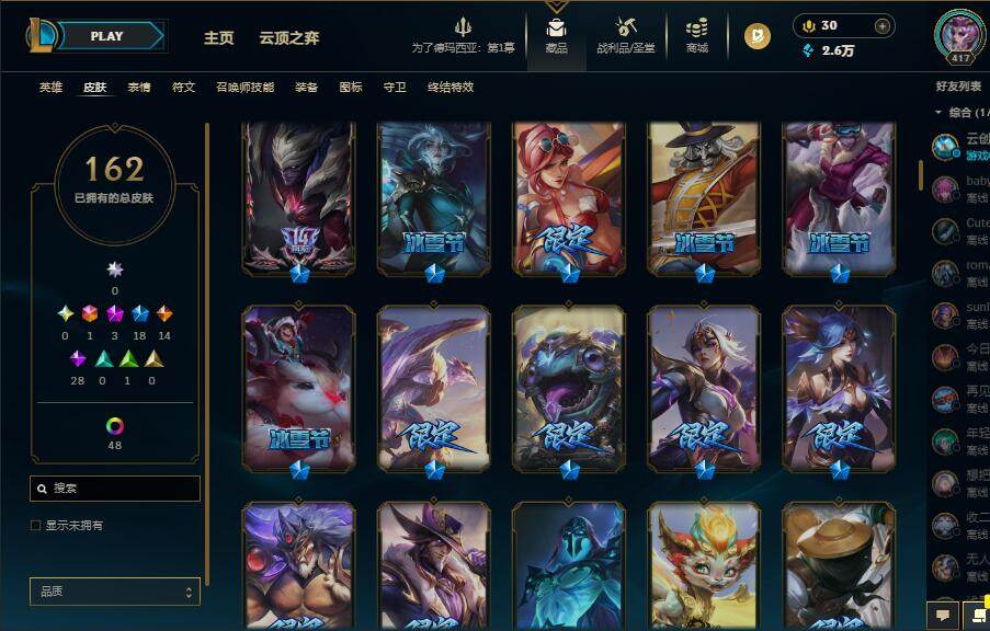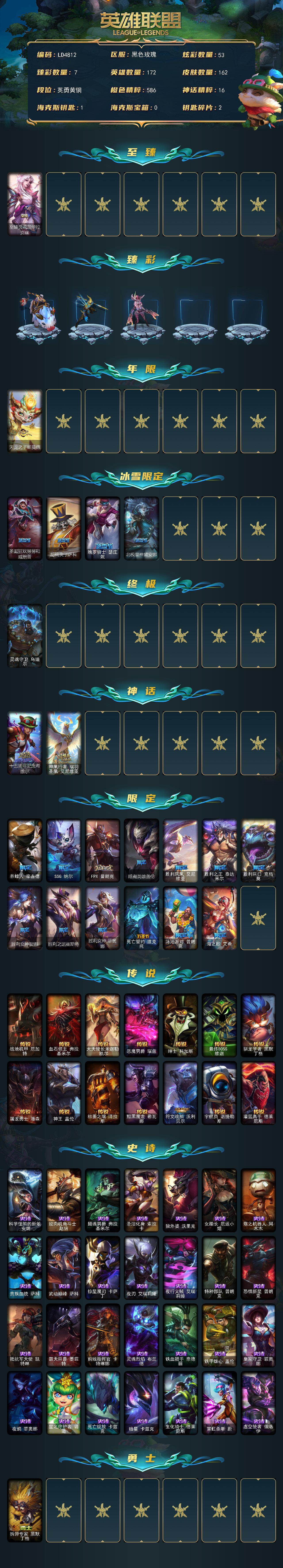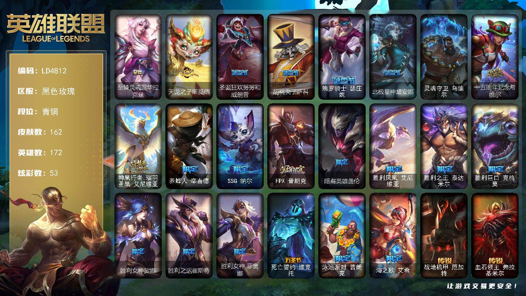 【302808】【LD4812】172英雄/162皮肤/1终极/3神话/18限定/7臻彩/53炫彩/14传说/28史诗/青铜账号等级:417/至臻灵魂莲华拉克丝/无畏骑士瑟庄妮赤子初心/冠军之矛卡莉丝塔凯旋圣装/破败军团厄运小姐灵岛征伐使/海之歌艾希冰爽浪花/魔女阿卡丽虚荣/幽梦玫瑰泰隆浪漫花蕾/黑夜使者嘉文四世白夜/天龙之子斯莫德/圣诞狂欢努努和威朗普/胡桃夹子萨科/魄罗骑士瑟庄妮/北极星神黛