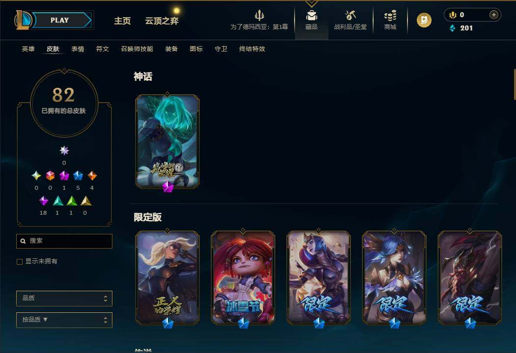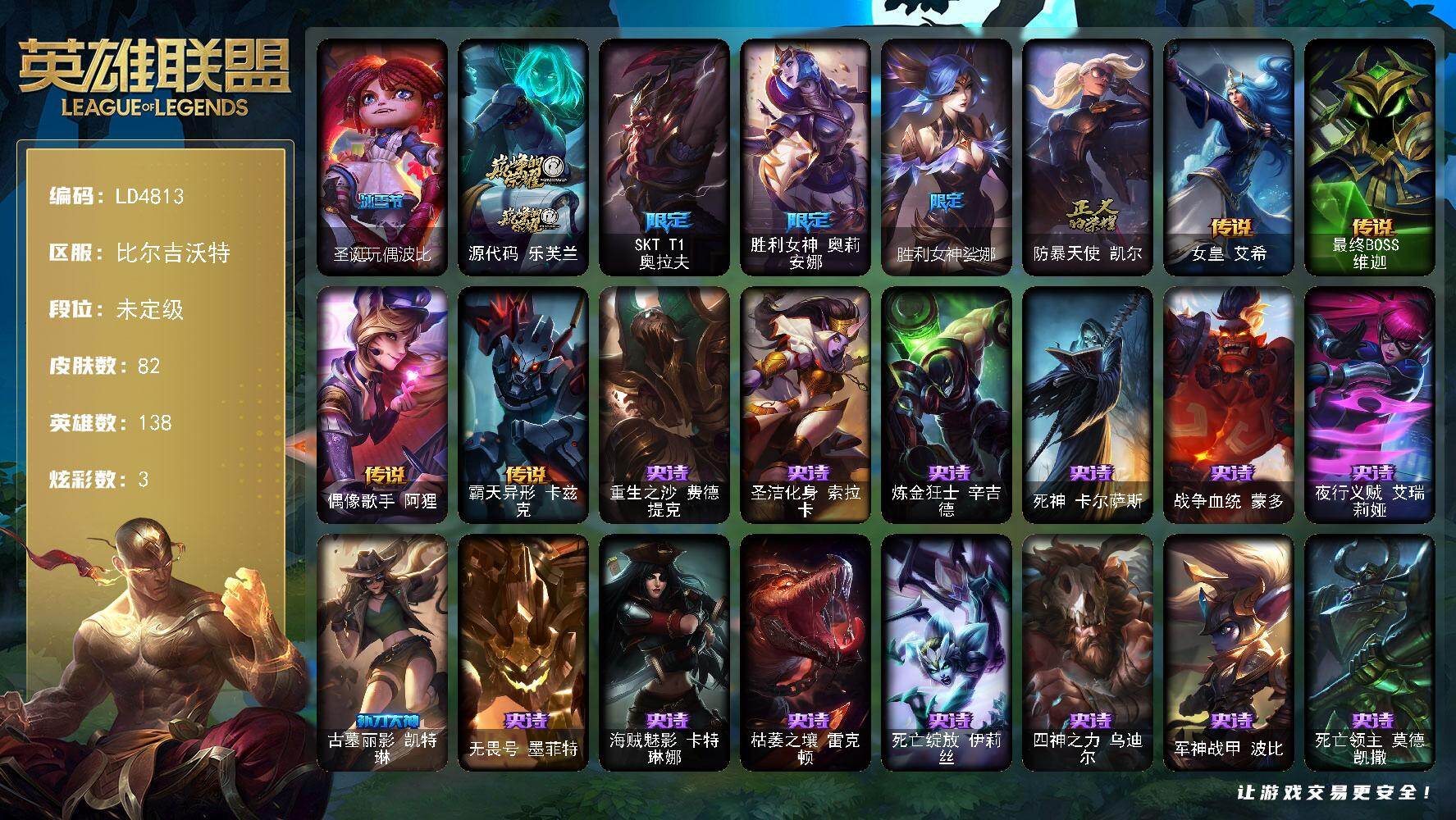 【302811】【LD4813】138英雄/82皮肤/1神话/5限定/3炫彩/4传说/18史诗/未定级账号等级:247/圣诞玩偶波比/源代码乐芙兰/SKTT1奥拉夫/胜利女神奥莉安娜/胜利女神娑娜/防暴天使凯尔/女皇艾希/最终BOSS维迦/偶像歌手阿狸/霸天异形卡兹克/重生之沙费德提克/圣洁化身索拉卡/炼金狂士辛吉德/死神卡尔萨斯/战争血统蒙多/夜行义贼艾瑞莉娅/古墓丽影凯特琳/无畏号墨菲特/海