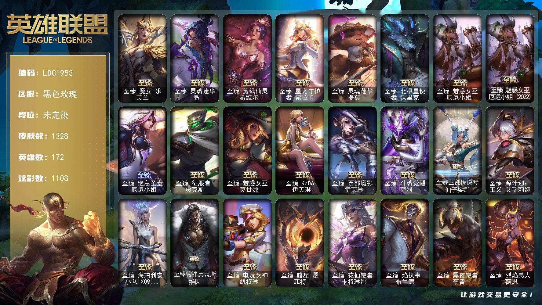 【302854】【LDC1953】172英雄/1328皮肤/8终极/111神话/228限定/62臻彩/1108炫彩/116传说/215史诗/未定级/星守阿狸/爱意绵绵/爱情之歌/觅心之翼奎因/觅心游侠卢锡安/星守索拉卡/至臻魔女乐芙兰/至臻灵魂莲华易/至臻剪纸仙灵希维尔/至臻星之守护者索拉卡/至臻灵魂莲华提莫/至臻北极星使者沃里克/至臻魅惑女巫厄运小姐/至臻魅惑女巫厄运小姐(2022)/至臻绝息