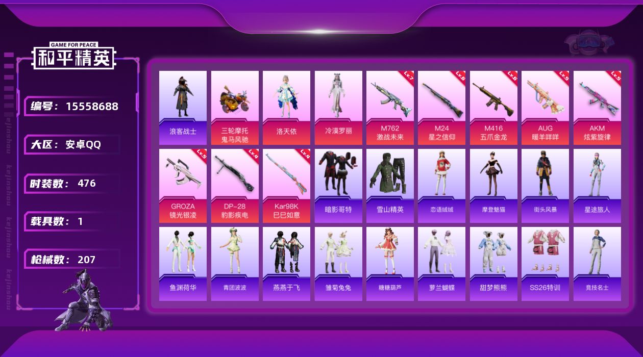 【302996】【不可二次】【安卓QQ】灵绣 M416-五爪金龙 M762-激战未来 M249-古堡领主 M762-瑞龙福将 潮萌小黄鸭 海洋之心 洛天依 浪客战士 夏日绵绵冰飞行器 罗小黑 AKM-炫紫旋律 鬼马风驰 M416-仓鼠灰灰 浪漫波比 瑞龙福将 激萌小黄鸭 抹茶蜜豆 风华少年志 M24-星之信仰 暗影哥特 雪山精英 团圆交子