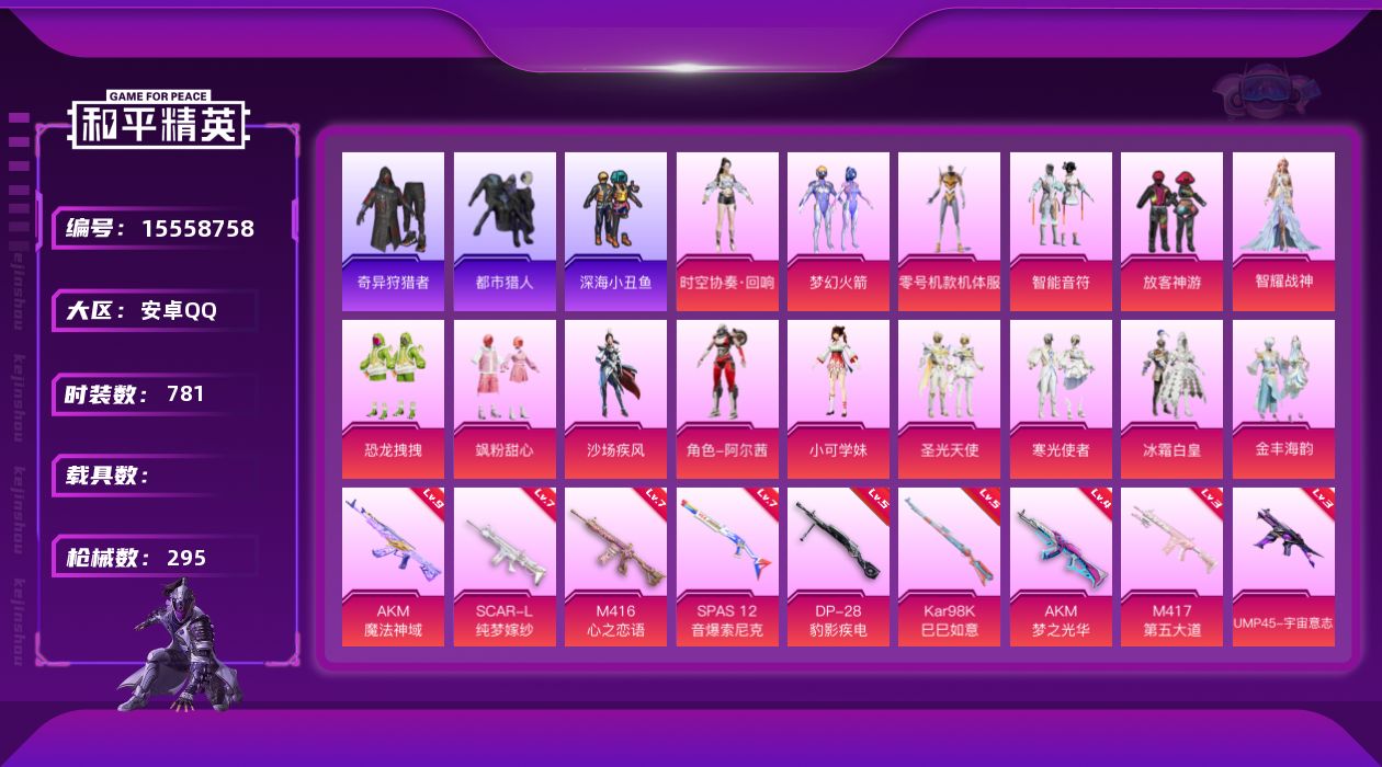 【303005】【不可二次】【安卓QQ】龟仙人 恐龙拽拽 漫步者 都市猎人 SPAS-12-音爆索尼克 M24-奇异狩猎者 忍者信条 风花雪月飞行器 放客神游 M416-心之恋语 黄螳螂 深海小丑鱼 瑞龙福将 智能音符 醒狮腾龙 浪漫天命 纯梦嫁纱飞行翼 团圆交子 沙场疾风 时空协奏·回响 迅捷狂鲨 奇异狩猎者 M762-瑞龙福将 UMP45-宇宙意志 M417射手步枪 AKM-魔法神域 诡面顽