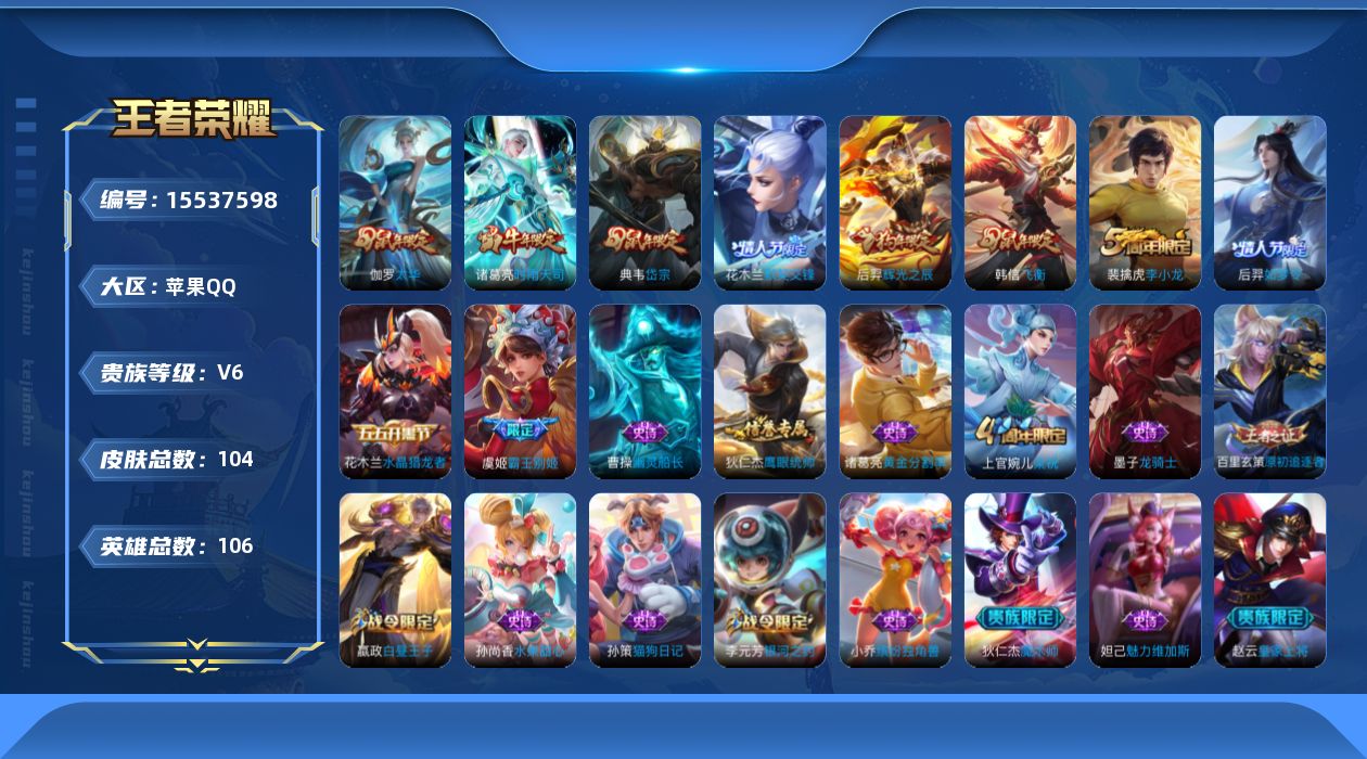 【303035】【可二次】【QQ(苹果)】科学大爆炸 后羿如梦令 鹰眼统帅 水晶猎龙者 猎兽之王 霸王别姬女 原初探秘者 街头霸王 岱宗 御霄 烛龙 朔风刀 缤纷独角兽 万华元夜 银河之约 御銮 千军破阵 花好人间 疑决卦 醍醐杖 丁香结 白昼王子 如懿 魅力维加斯 李小龙 龙骑士 时雨天司 穷奇 御旌 弈星混沌棋 皇家上将 星空之诺 水果甜心 演武夺筹 驱傩正仪 飞衡 幽灵船长 敏锐之力 混沌