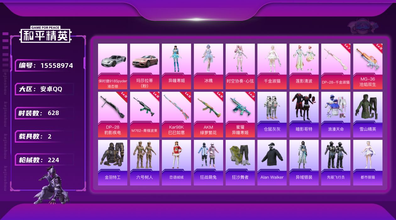【303037】【不可二次】【安卓QQ】AKM-绿萝繁花 M762-青锋波束 M762-瑞龙福将 黑色刀锋 狂沙舞者 金羽特工 仓鼠灰灰 M416-仓鼠灰灰 AKM-百万伏特 粉红小猪 六号树人 瑞龙福将 玛莎拉蒂粉色 醒狮腾龙 浪漫天命 暗影哥特 雪山精英 时空协奏·心弦 团圆交子