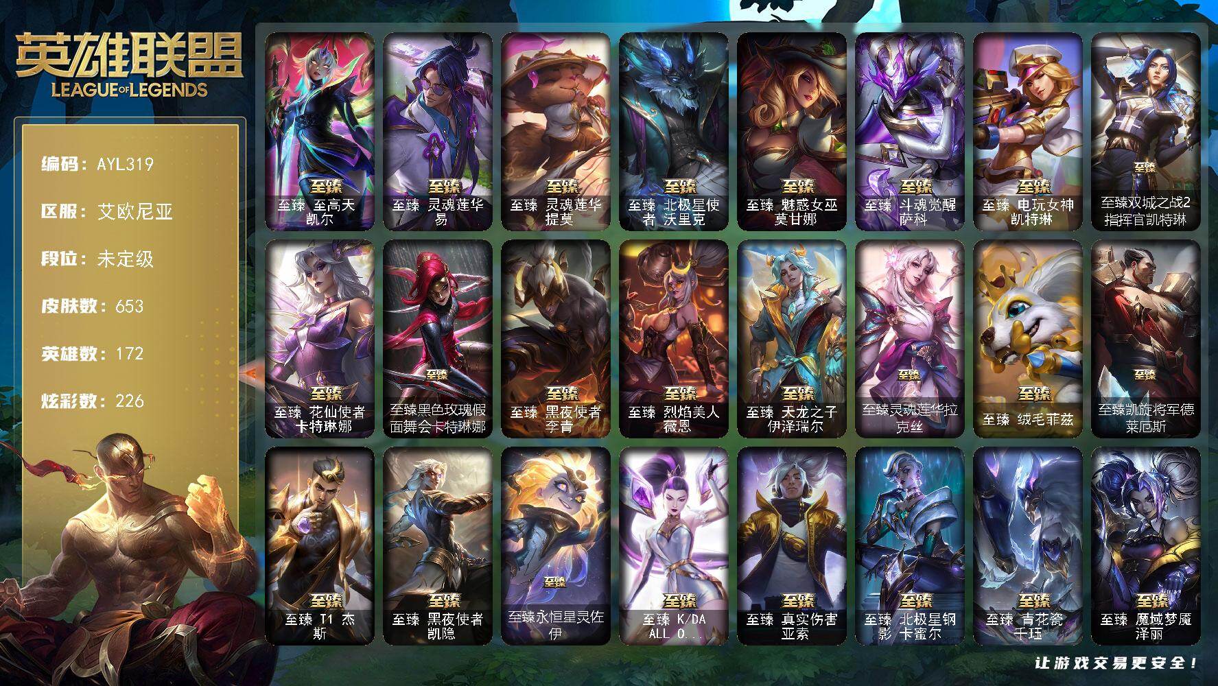 【303071】[15559135]【特价出售/店主推荐】、未定级段位-172英雄-653皮肤-226炫彩-1终极-41神话-87限定-61传说-130史诗【热门头像】:爱情之歌头像,银河魔装机神安妮头像【至臻皮肤】:至臻至高天凯尔,至臻灵魂莲华易,至臻灵魂莲华提莫,至臻北极星使者沃里克,至臻魅惑女巫莫甘娜,至臻斗魂觉醒萨科,至臻电玩女神凯特琳,至臻双城之战2指挥官凯特琳,至臻花仙使者卡特琳娜,