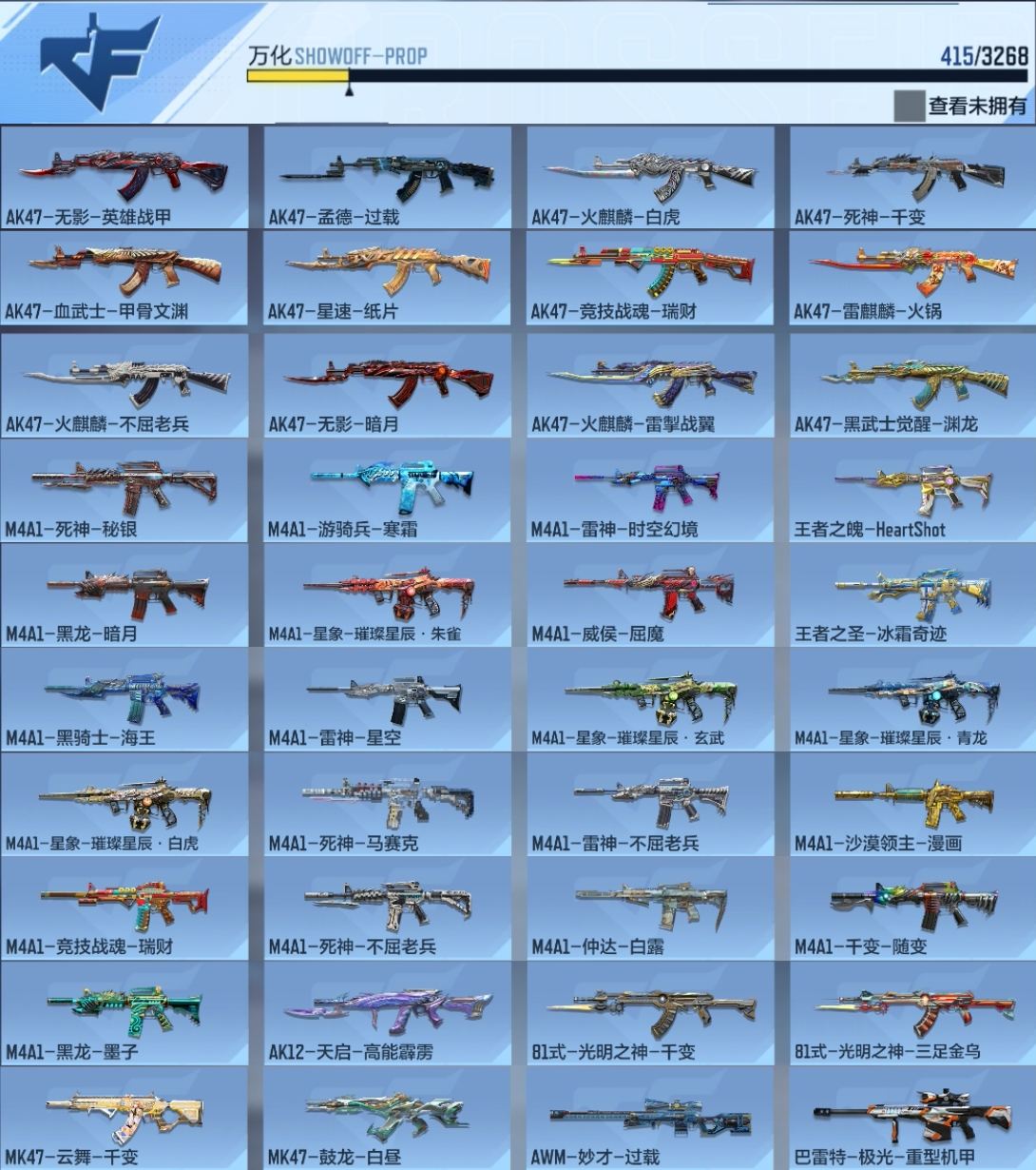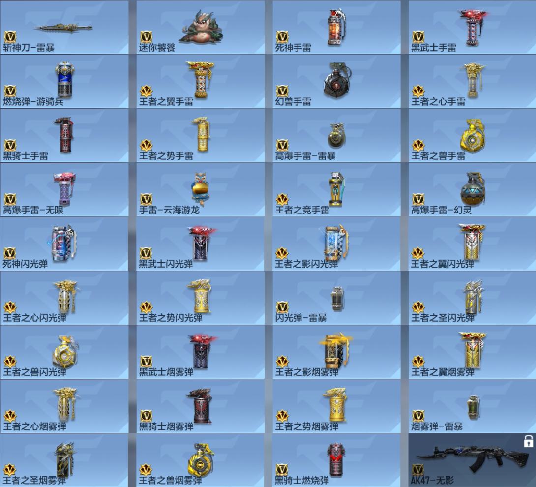 【303256】[15560227]x1264 VIP8,王者武器34,英雄级武器231,万化415,角色43 【王者武器】:王者之魂/王者之隐/王者之迹/王者之兽/王者之势烟雾弹/王者之影烟雾弹/王者之兽闪光弹/王者之翼烟雾弹/王者之心烟雾弹/王者之竞手雷/王者之影闪光弹/王者之翼闪光弹/王者之魄-冠军珍藏/王者幻神/王者之盘/王者之狱/M12S-雷霆王者/王者之仞/王者之烈/王者之势闪光弹/