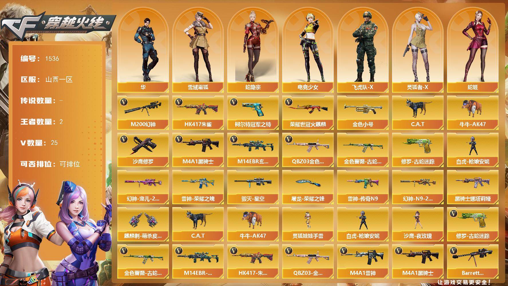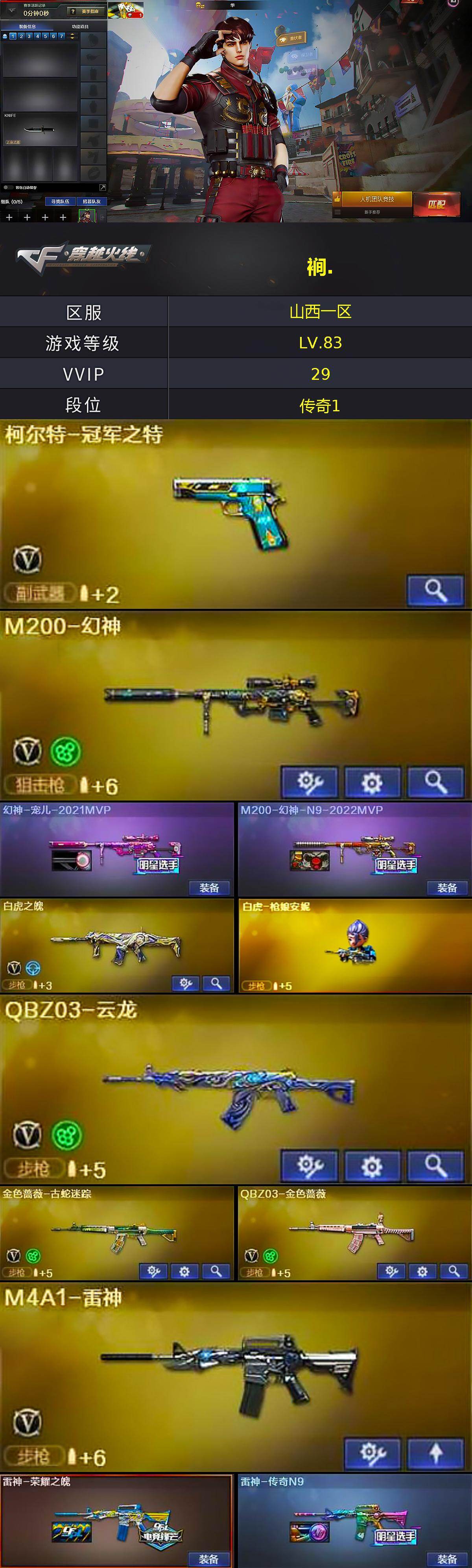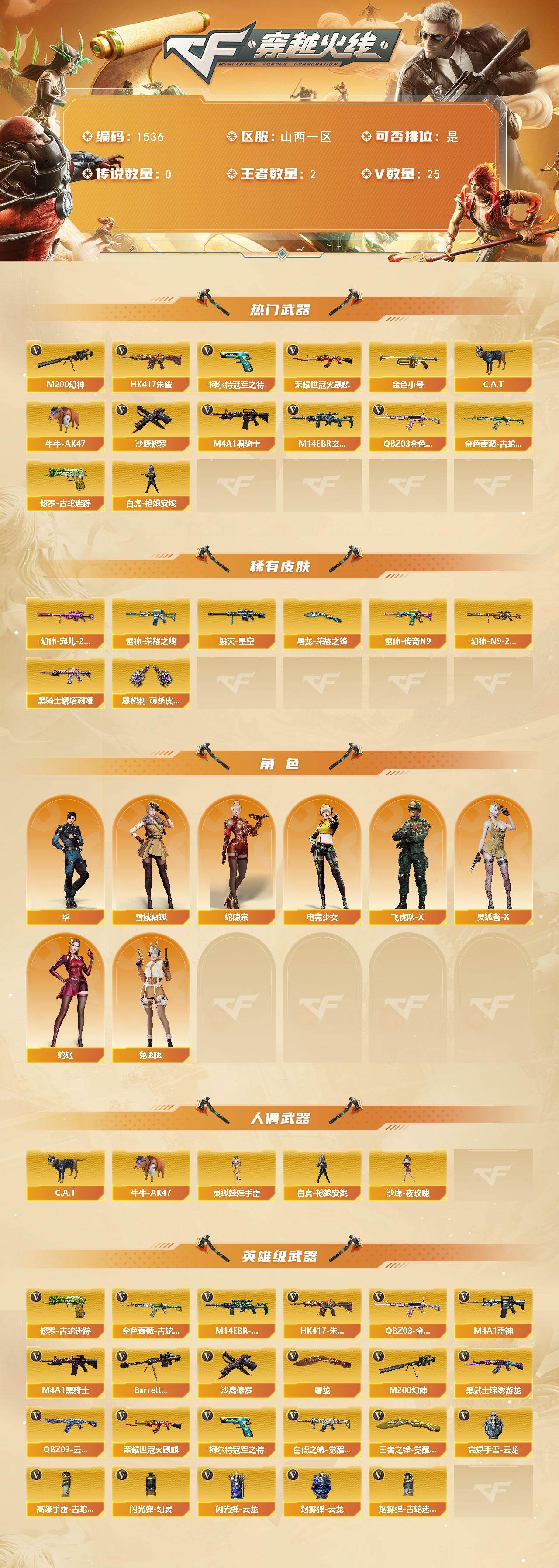 【303497】【303497】[15561657]山西一区-25V-2王者-0炫金【热门武器】:QBZ03-金色蔷薇,M14EBR-玄武,HK417-朱雀,