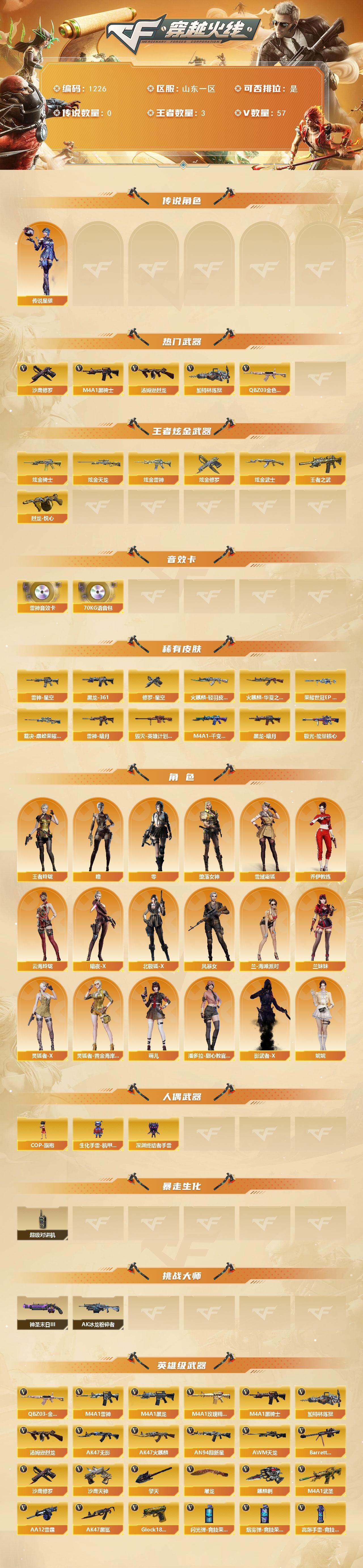 【303644】【303644】山东一区-57V-3王者-9炫金【传说角色】:传说星骇【热门武器】:QBZ03-金色蔷薇,M4A1-黑骑士*2,汤姆逊-烈龙*