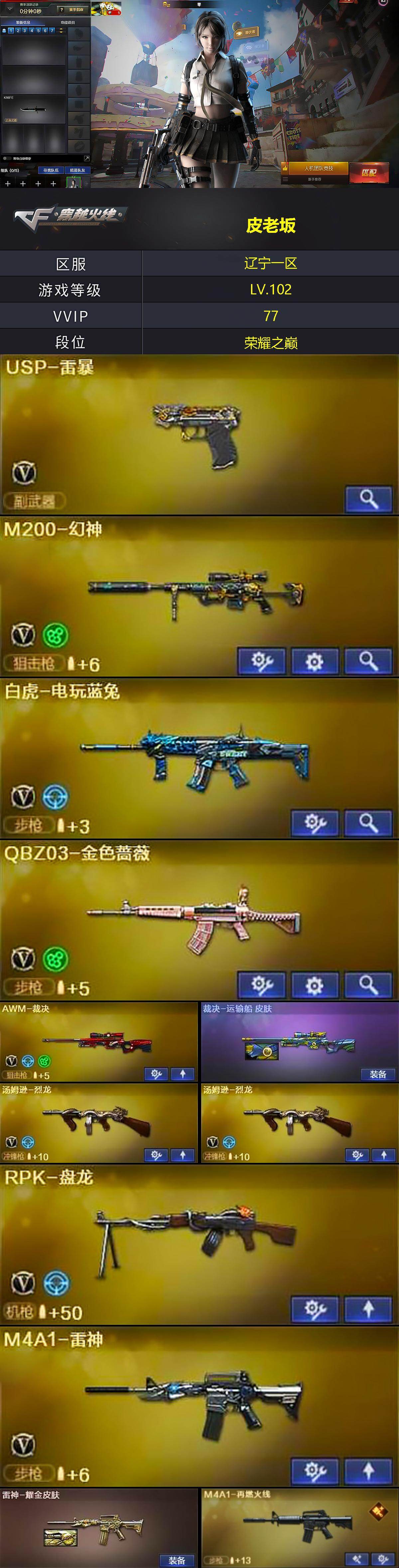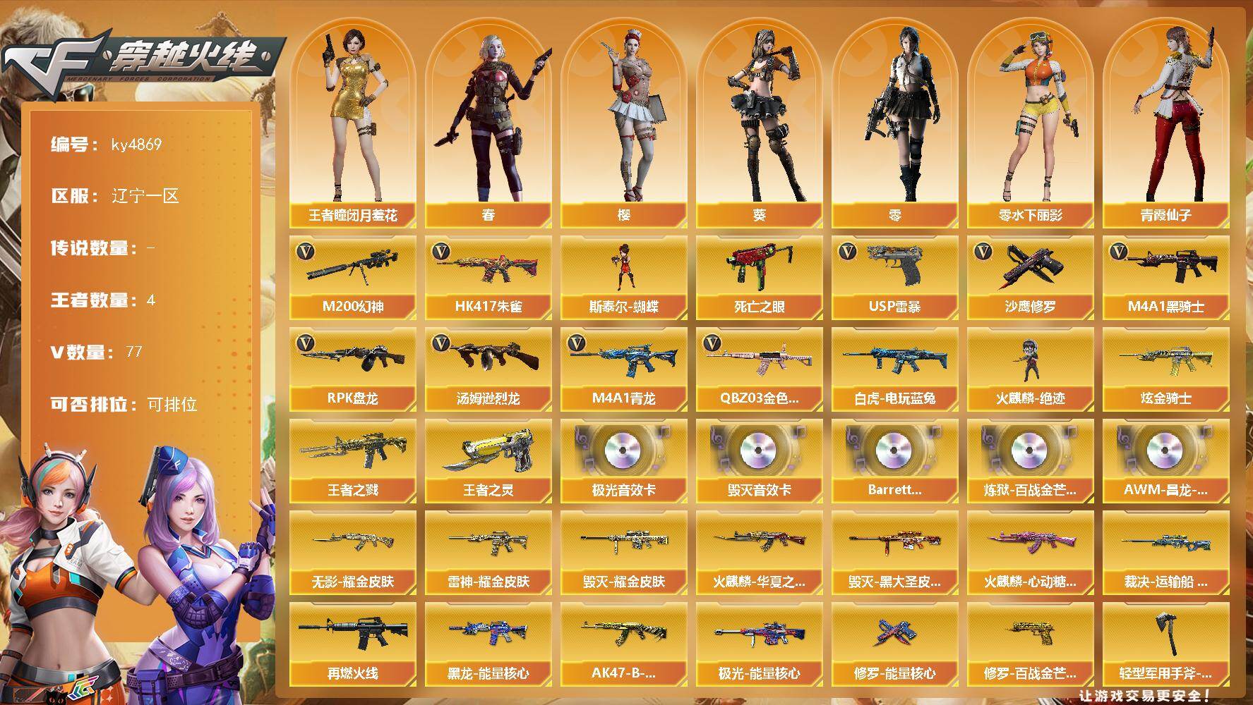 【303661】【303661】辽宁一区-77V-4王者-1炫金【热门武器】:QBZ03-金色蔷薇,HK417-朱雀,M4A1-青龙,M200-幻神,死亡之眼