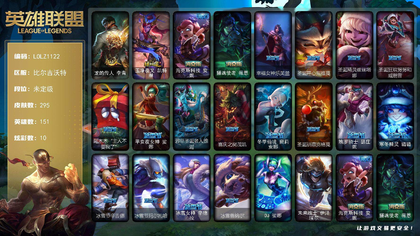 【303918】【LOLZ1122】151英雄/295皮肤/2终极/2神话/45限定/10炫彩/22传说/80史诗/未定级账号等级:126/龙的传人李青/玉净夜叉凯特琳/海克斯科技安妮/摄魂使者薇恩/幸福女神乐芙兰/圣诞开心鬼提莫/圣诞精灵崔丝塔娜/圣诞狂欢努努和威朗普/阿木木:“主人不要我了”/平安夜女神娑娜/邪恶圣诞老人维迦/喜庆之树茂凯/冬季仙境奥莉安娜/圣诞驯鹿克格莫/魄罗骑士瑟庄妮/寒