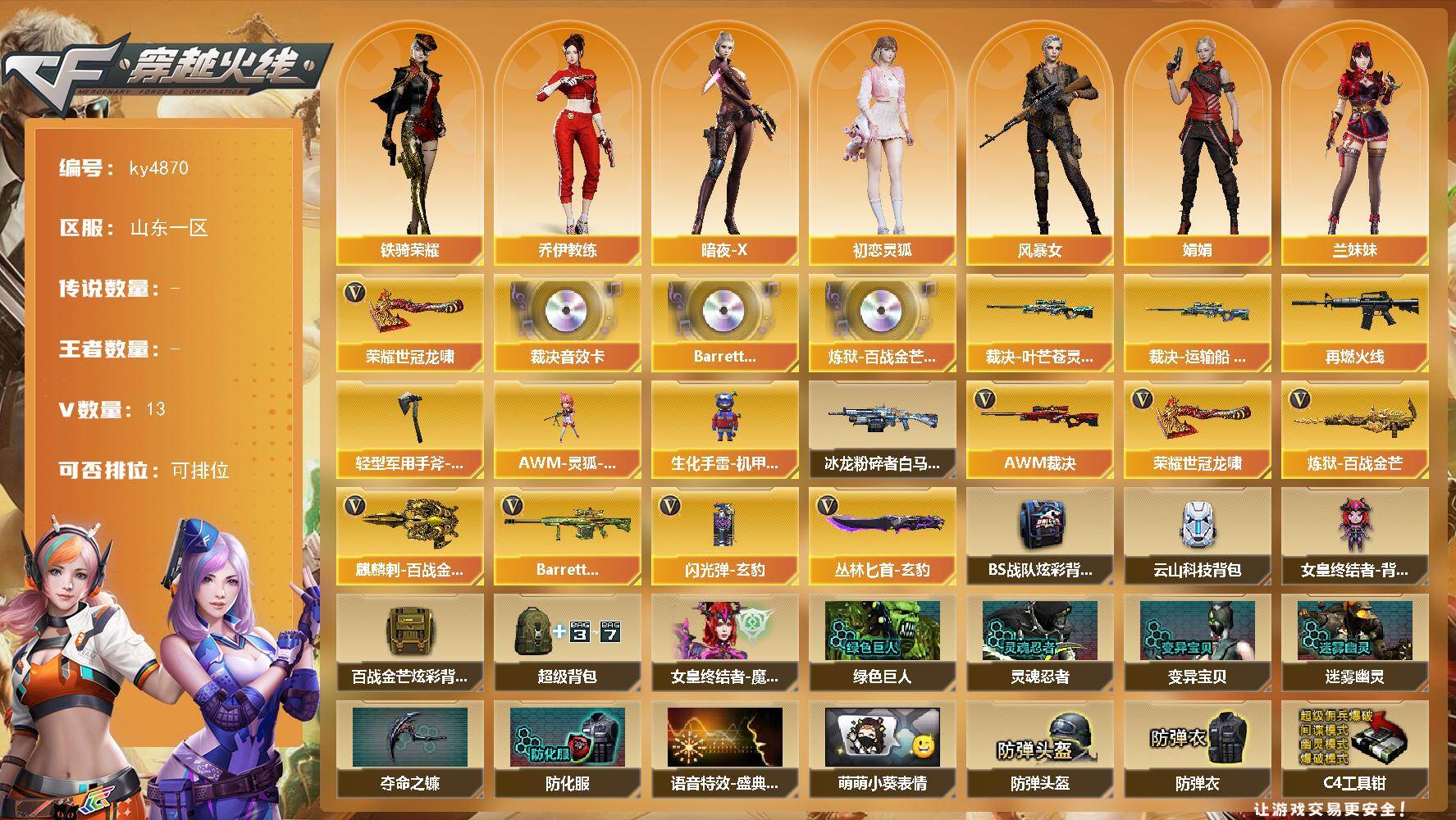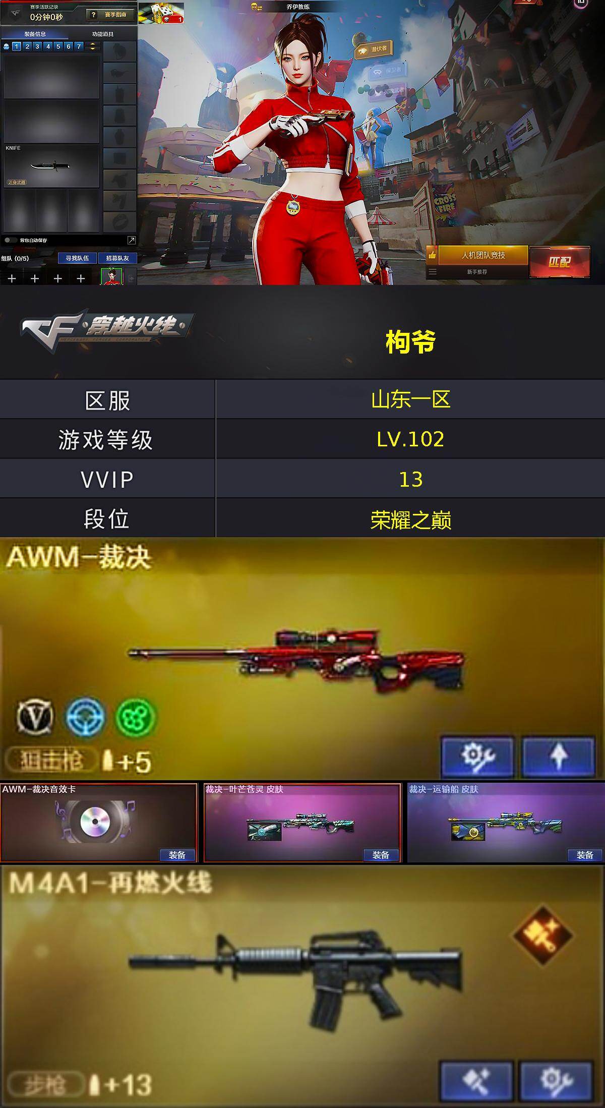 【303647】【303647】山东一区-13V-0王者-0炫金【热门武器】:荣耀世冠-龙啸【音效卡】:AWM-裁决音效卡,Barrett-碧霄极光音效卡,炼