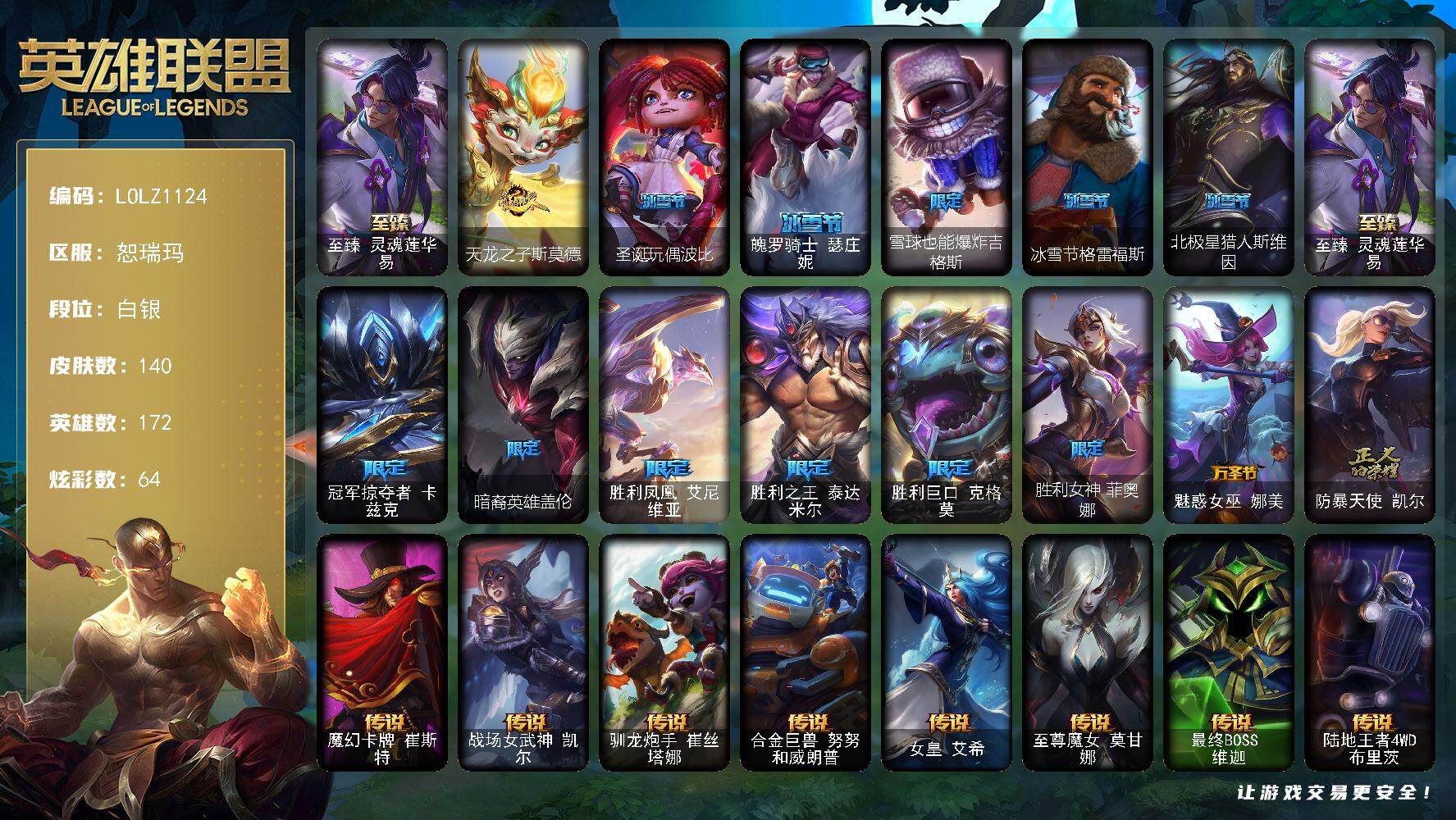 【303967】【LOLZ1124】172英雄/140皮肤/1神话/14限定/9臻彩/64炫彩/19传说/26史诗/白银/至臻灵魂莲华易/无畏骑士瑟庄妮赤子初心/冰霜之刃艾瑞莉娅炫金/征服者阿利斯塔炫金/冠军之刃锐雯2016凯旋圣装/神龙尊者圣龙李青登龙/玉剑传说翼剑仙珠光/可爱可爱粉红红布里茨/幻灵战斗队长厄运小姐勇气赞歌/魔女阿卡丽虚荣/天龙之子斯莫德/圣诞玩偶波比/魄罗骑士瑟庄妮/雪球也能