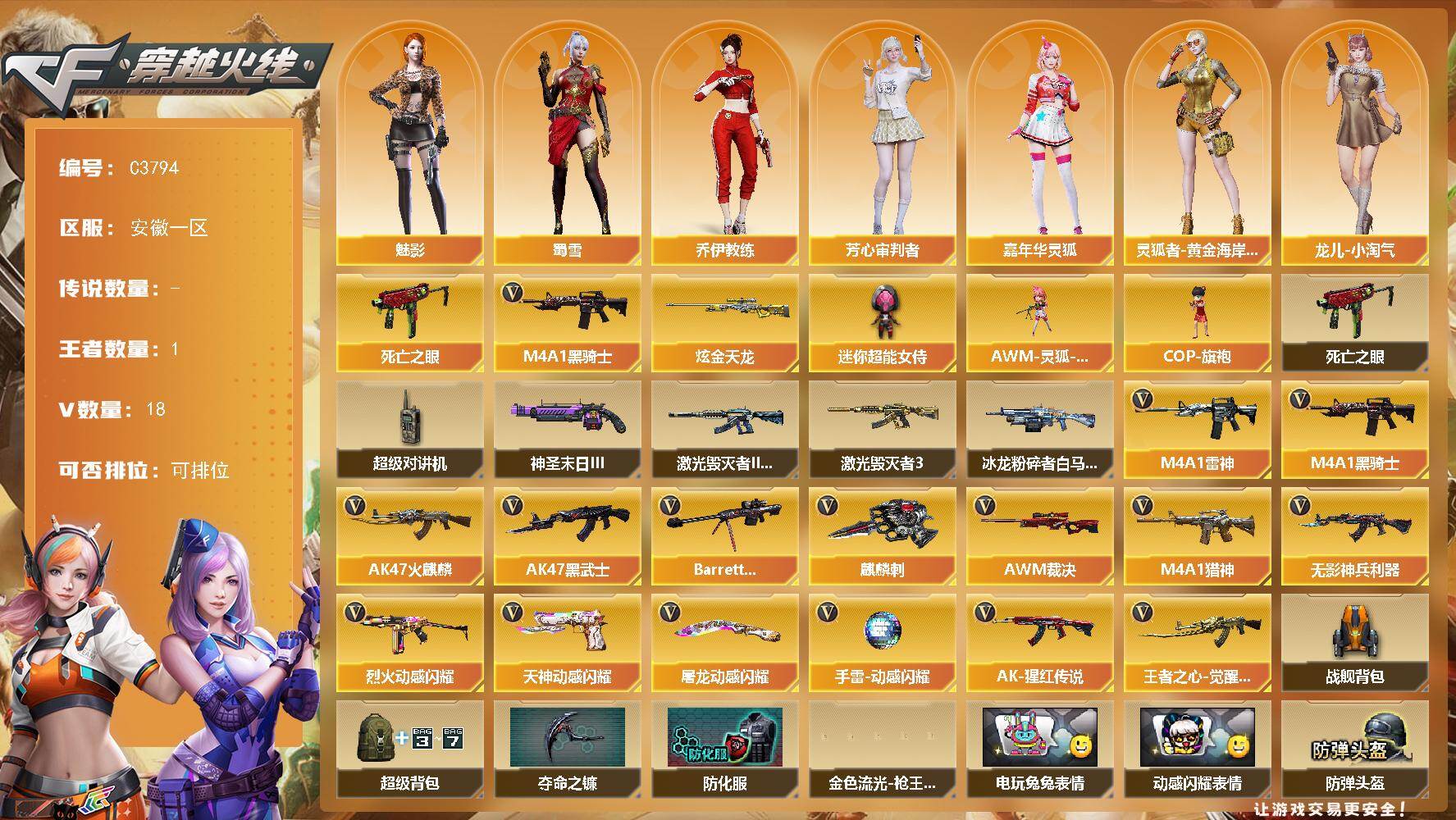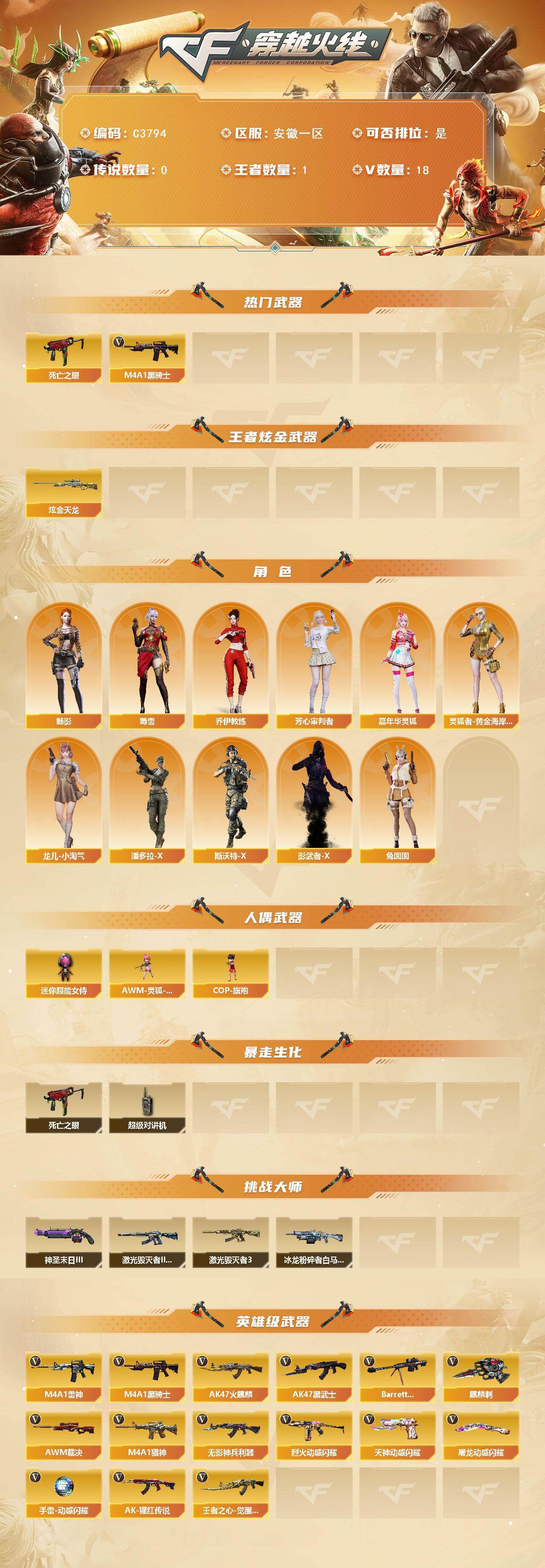【304165】【304165】【C3794】安徽一区-18V-1王者-1炫金【热门武器】:死亡之眼,M4A1-黑骑士【王者炫金武器】:炫金天龙【角色】:魅影