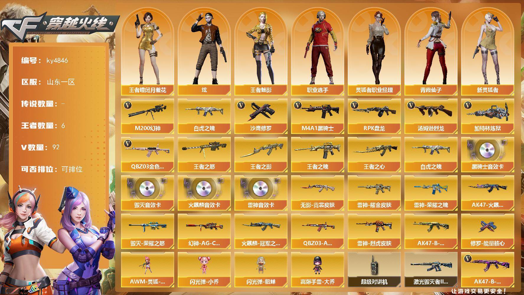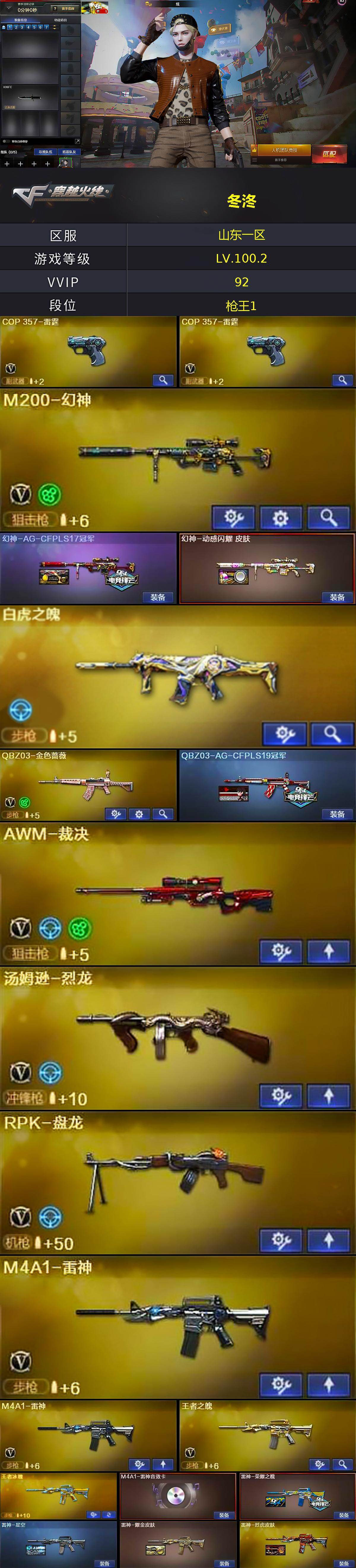 【304295】【304295】山东一区-92V-6王者-0炫金【热门武器】:QBZ03-金色蔷薇,M200-幻神,白虎之魄,M4A1-黑骑士*2,汤姆逊-烈
