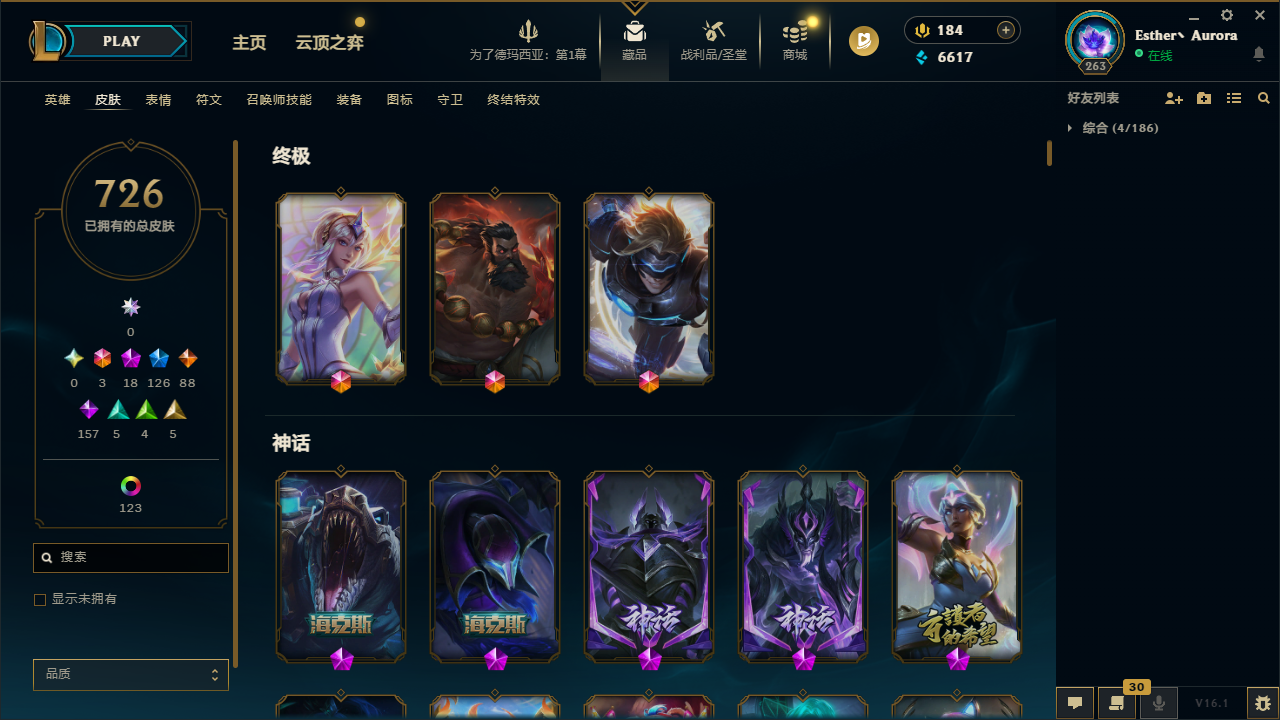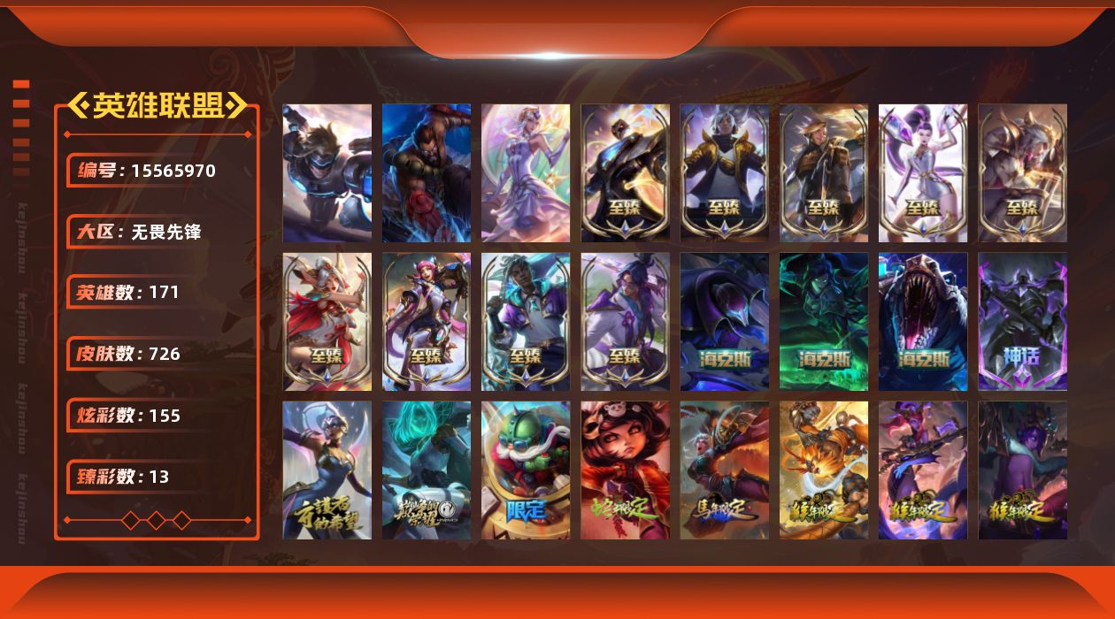 【304306】[15565970]t34153【无畏先锋】 726皮肤 155炫彩 13臻彩 18神话/126限定/88传说/171英雄 账号等级:263【重要头像】雪花 两仪无极 KDA萨勒芬妮 星守卡莎 幻灵战斗队长厄运小姐 烈焰美人薇恩 送披萨的小姐姐希维尔 战斗学院伊泽瑞尔神话炫彩 西部天使赛娜神话炫彩 圣诞捣蛋鬼金克丝 至臻幻灵战斗猫金克丝 至臻女帝黛安娜 至