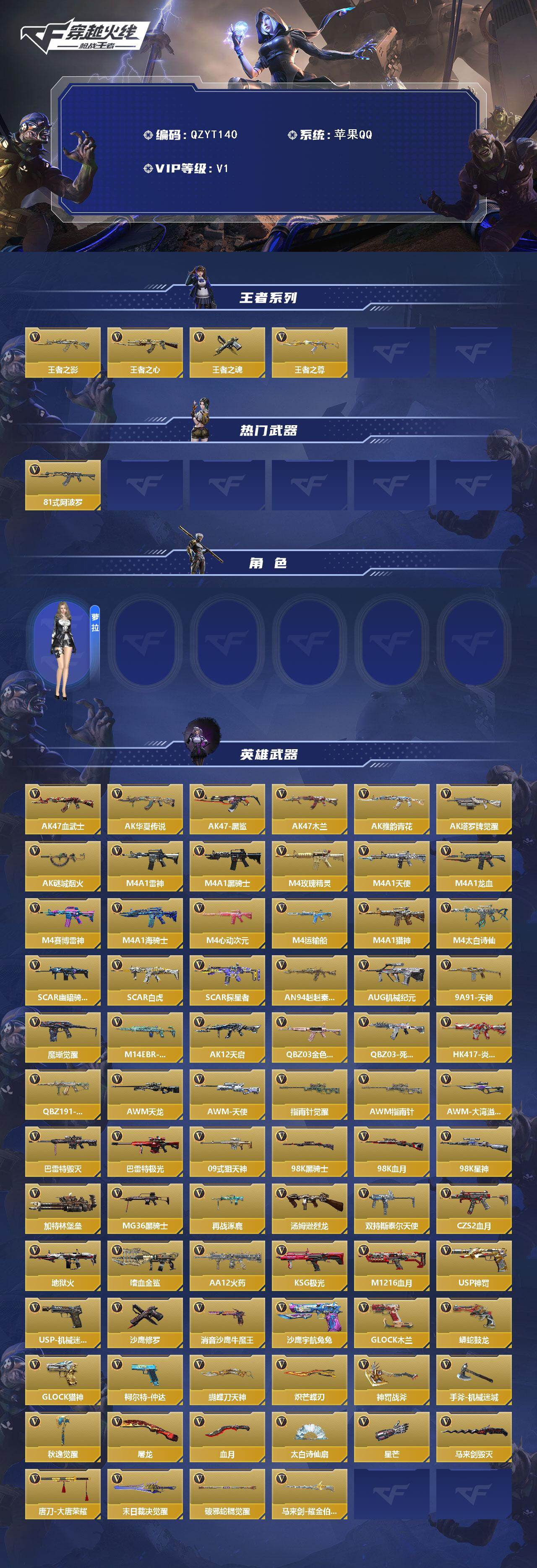 【304308】【QZYT140】VIP1/142V/王者之影/王者之心/王者之魂/王者之尊/81式-阿波罗/萝拉/AK47-血武士/AK47-华夏传说/AK47-黑鲨/AK47-木兰/AK47-雅韵青花/AK47-塔罗牌觉醒/AK47-谜城烟火/雷神/黑骑士/M4A1-玫瑰精灵/天使/M4A1-龙血/M4A1-赛博雷神/M4A1-海骑士/M4A1-心动次元/M4A1-运输船/M4A1-猎神/M
