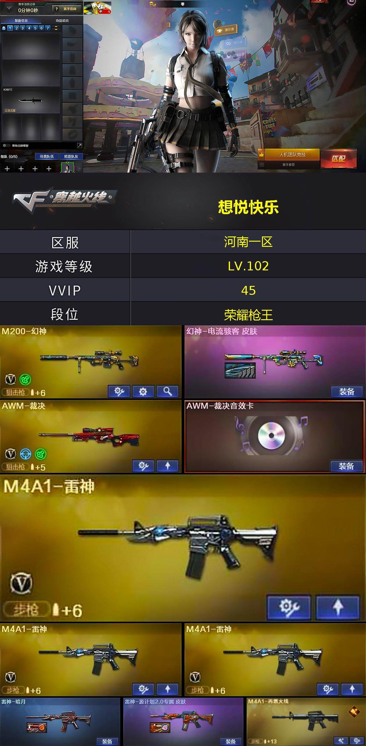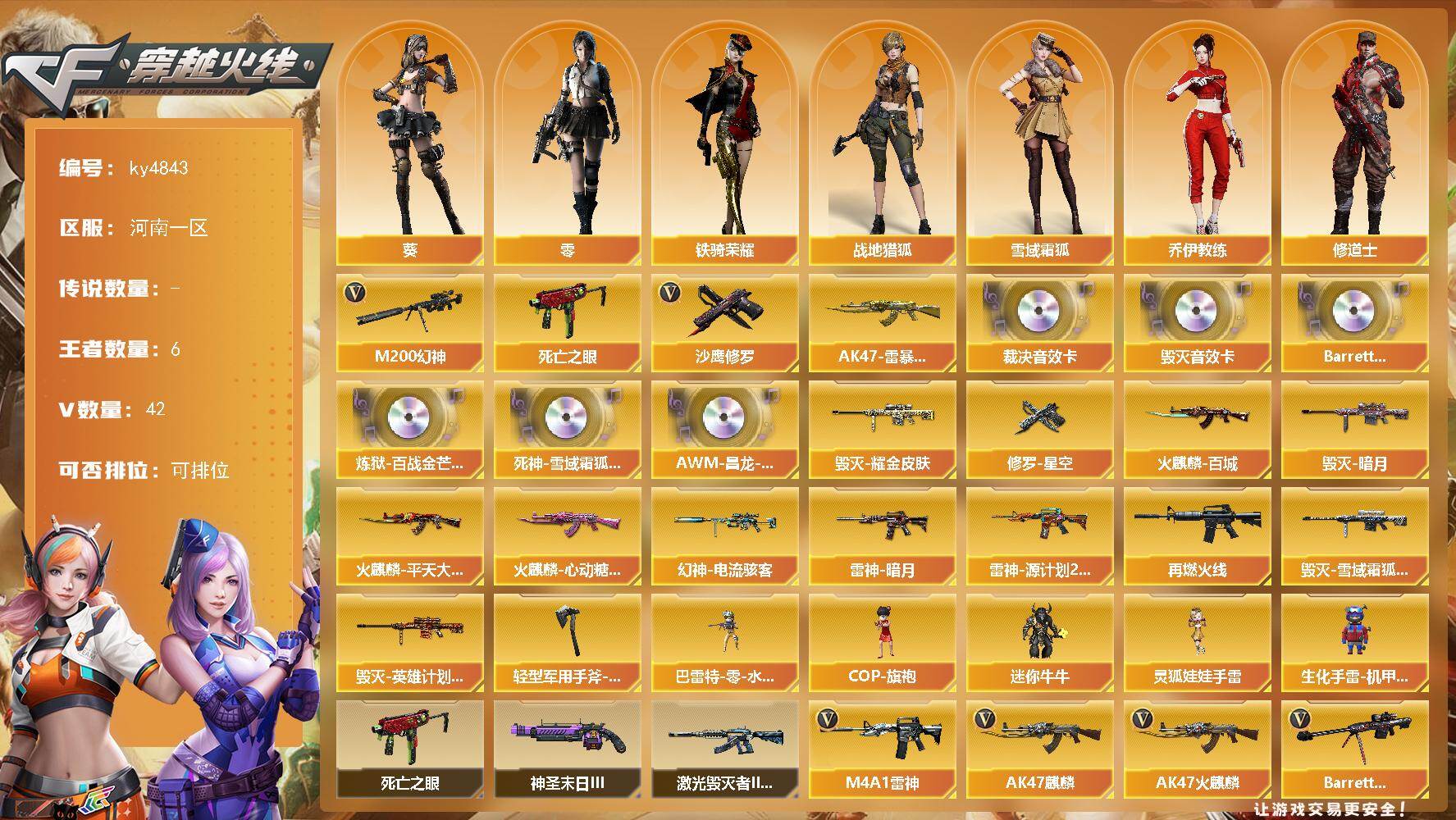 【304319】【304319】河南一区-42V-6王者-0炫金【热门武器】:M200-幻神,死亡之眼,沙鹰-修罗【王者炫金武器】:AK47-雷暴王者【音效卡
