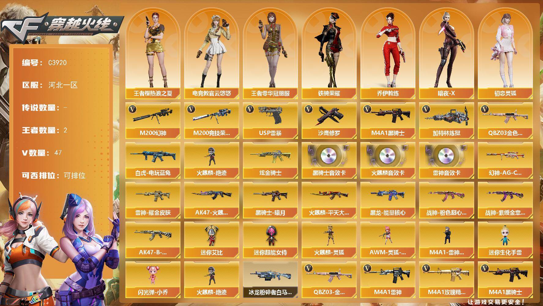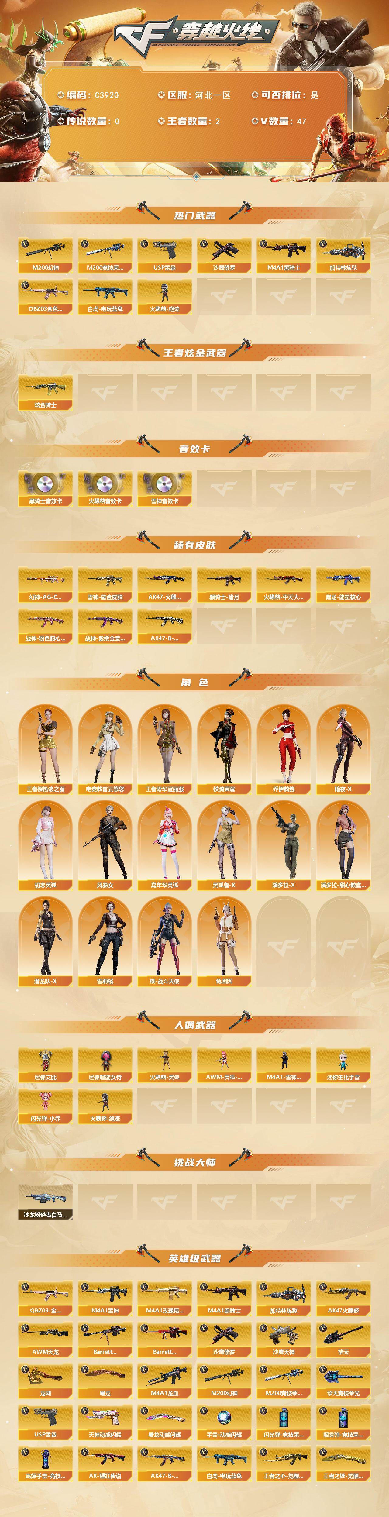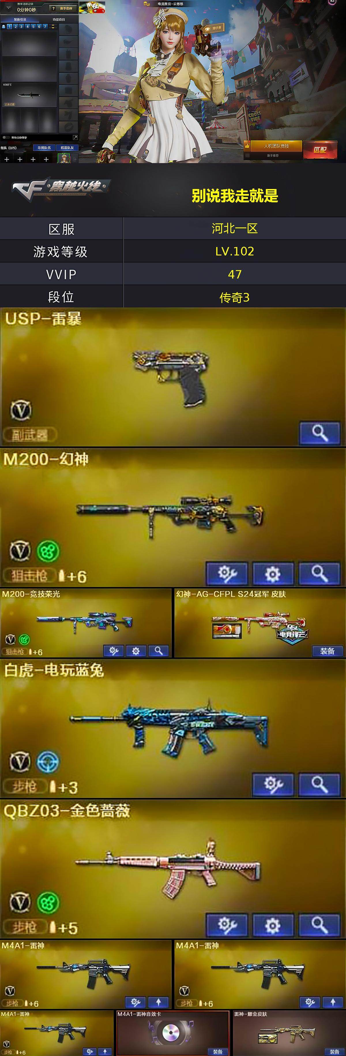 【304548】【304548】[15567240]河北一区-47V-2王者-1炫金【热门武器】:QBZ03-金色蔷薇,M200-幻神,M200-竞技荣光,白