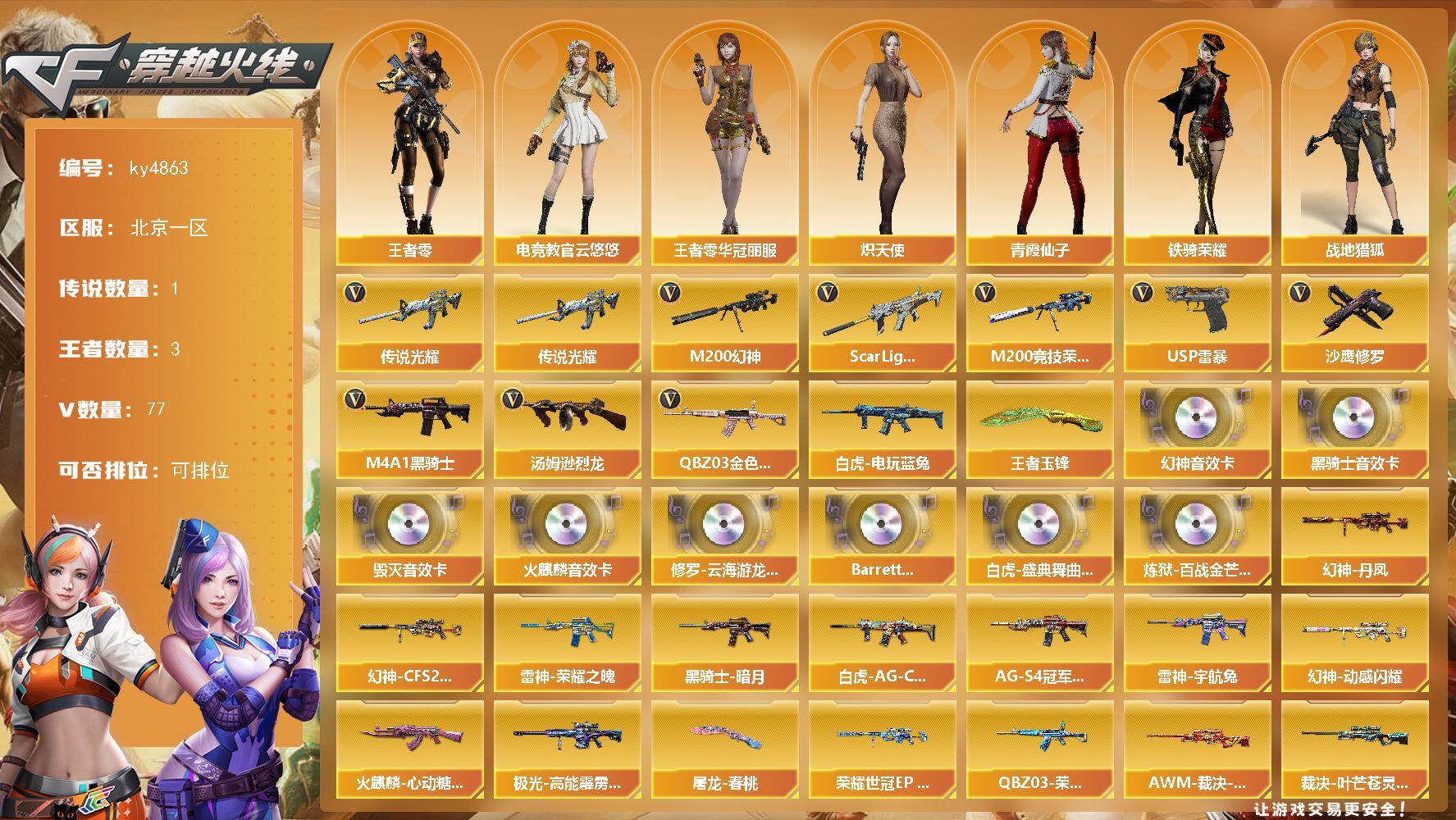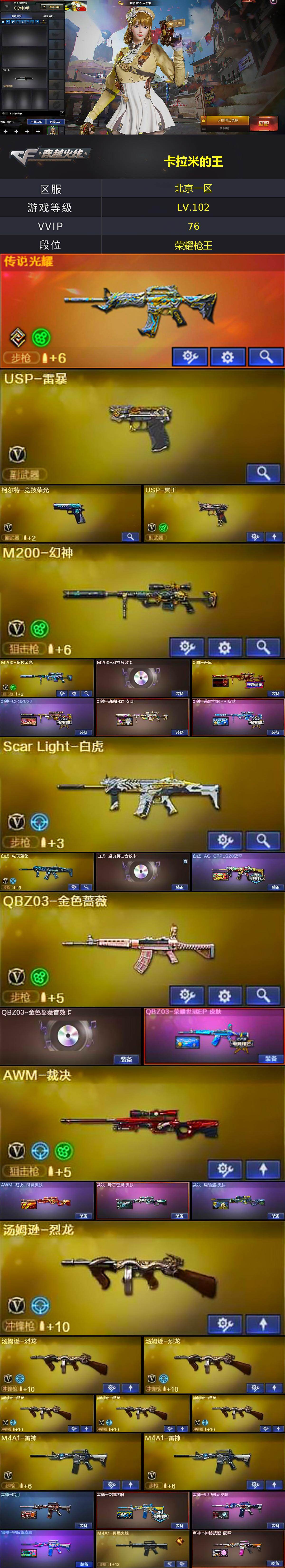 【304624】【304624】北京一区-77V-3王者-0炫金【传说武器】:传说光耀【热门武器】:传说光耀,QBZ03-金色蔷薇,Scar Light-白虎