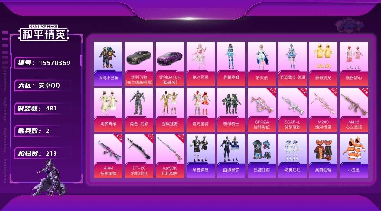 【305256】【不可二次】【安卓QQ】龟仙人 迅捷狂鲨 金属狂野 洛天依 萌物绒绒飞行器 翡翠骑士 M762-风花雪月 AKM-炫紫旋律 M416-心之恋语 AKM-缤纷海域 心之恋语飞行翼 花傲天飞行器 深海小丑鱼 SCAR-L-纯梦嫁纱 GROZA-旋转彩虹