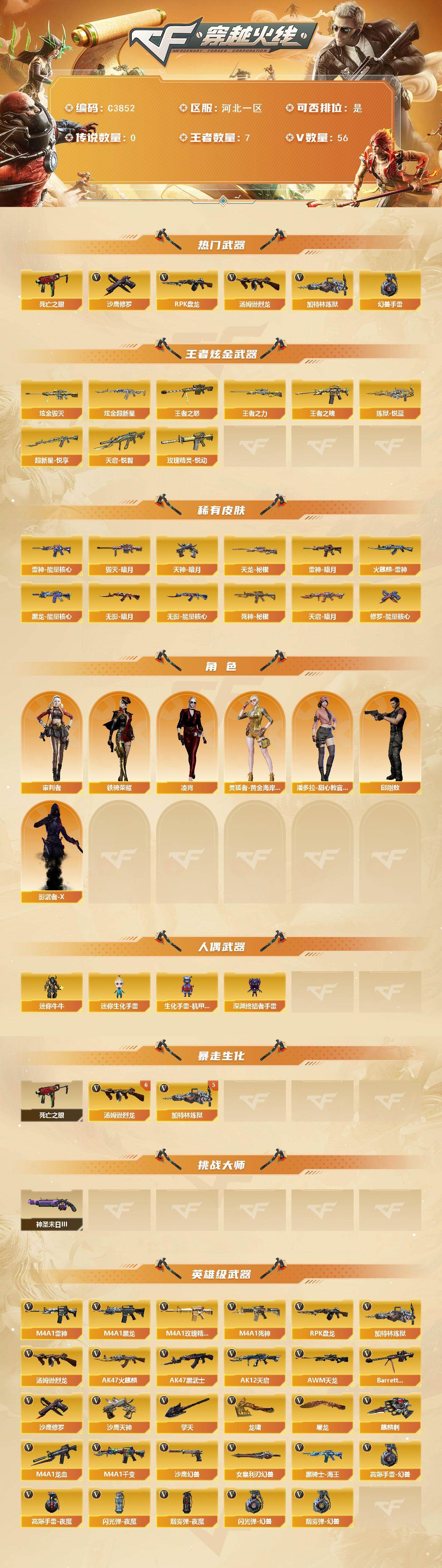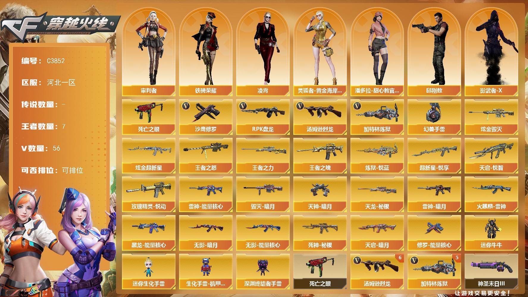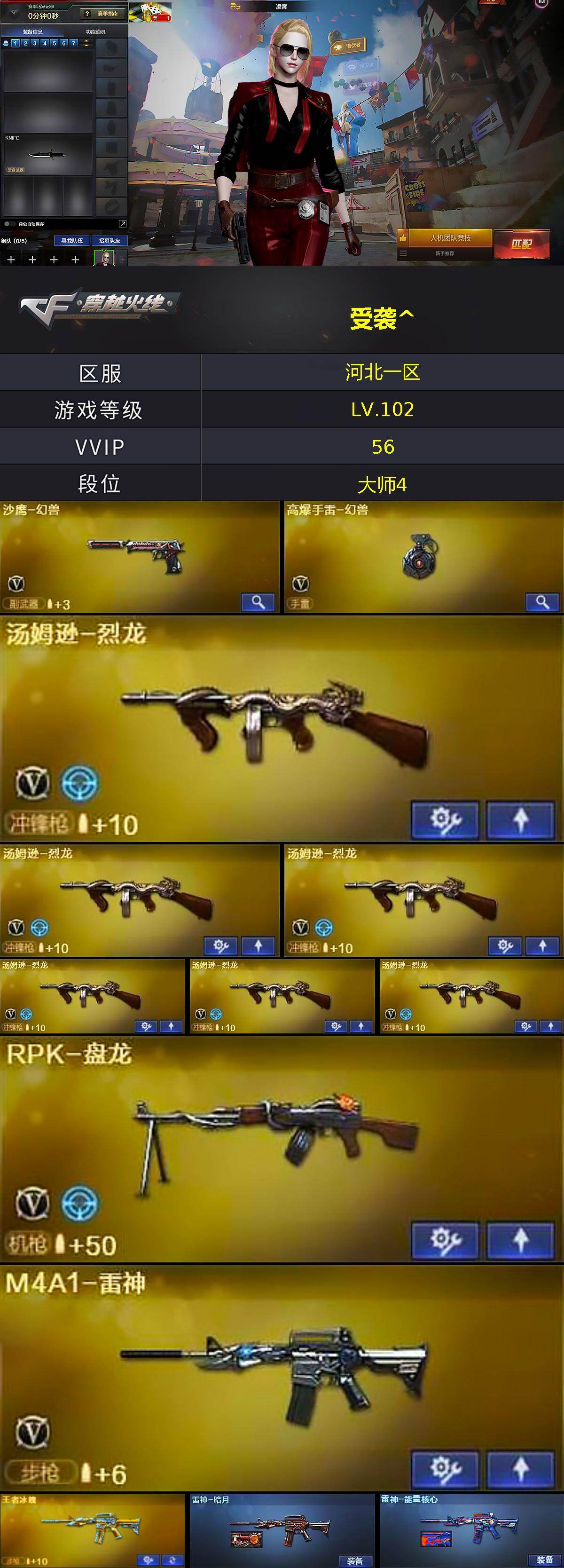 【305258】【305258】[15570258]河北一区-56V-7王者-4炫金【热门武器】:死亡之眼,汤姆逊-烈龙*6,RPK-盘龙,加特林-炼狱*5,